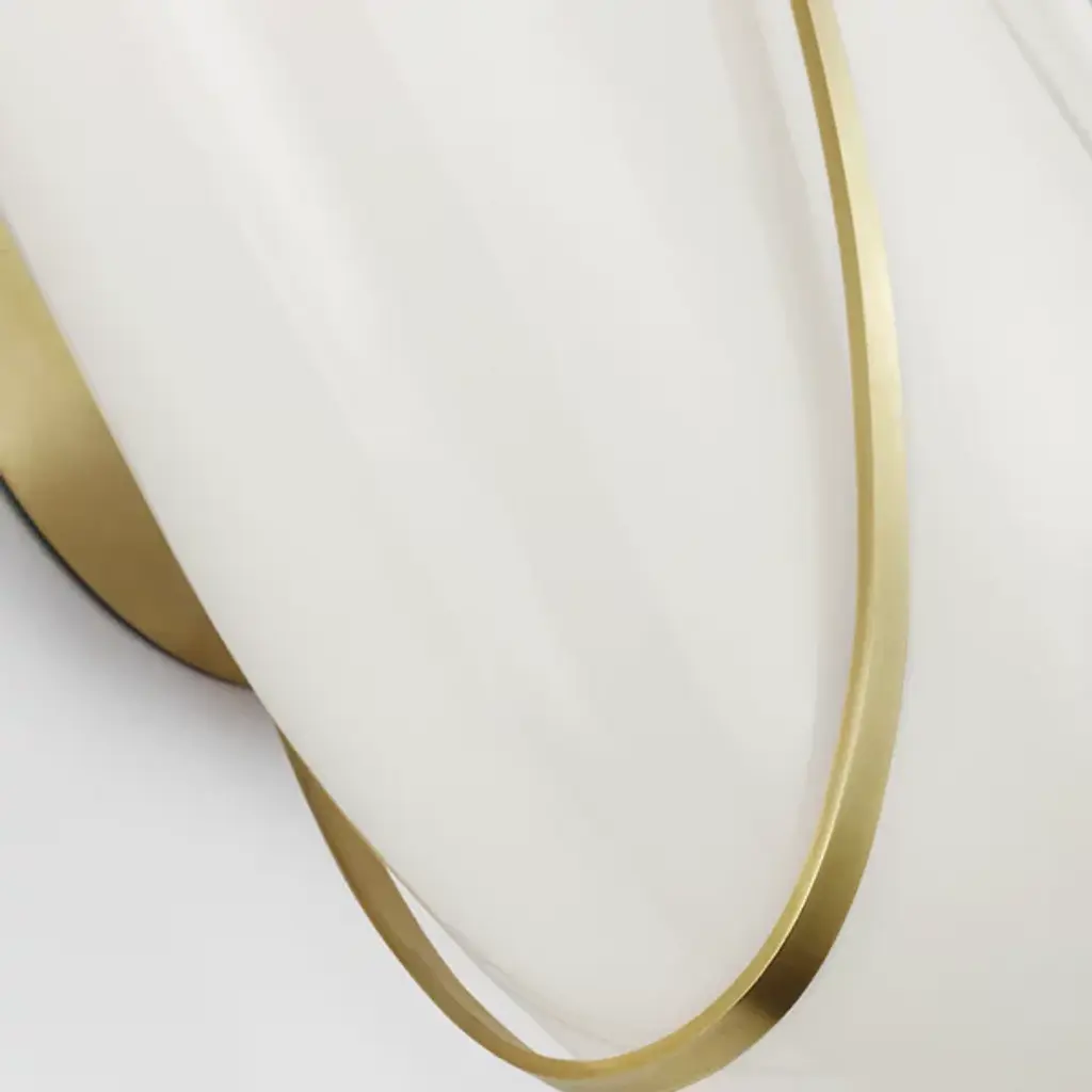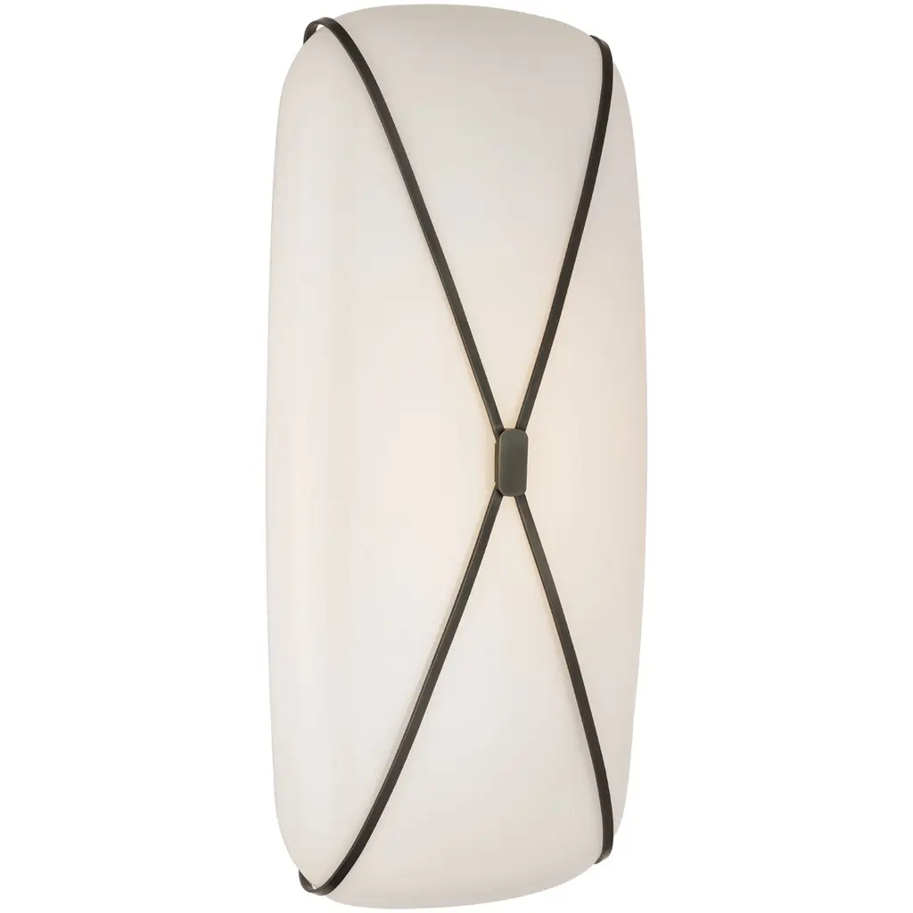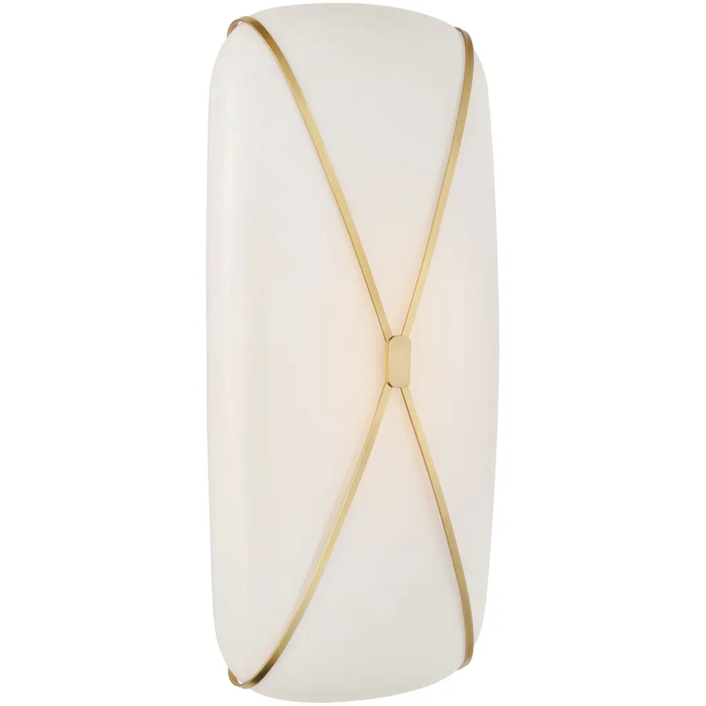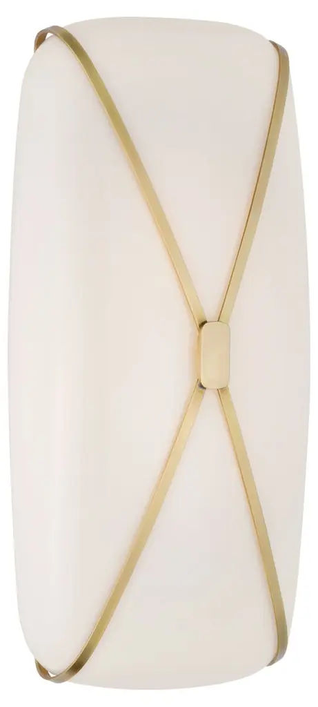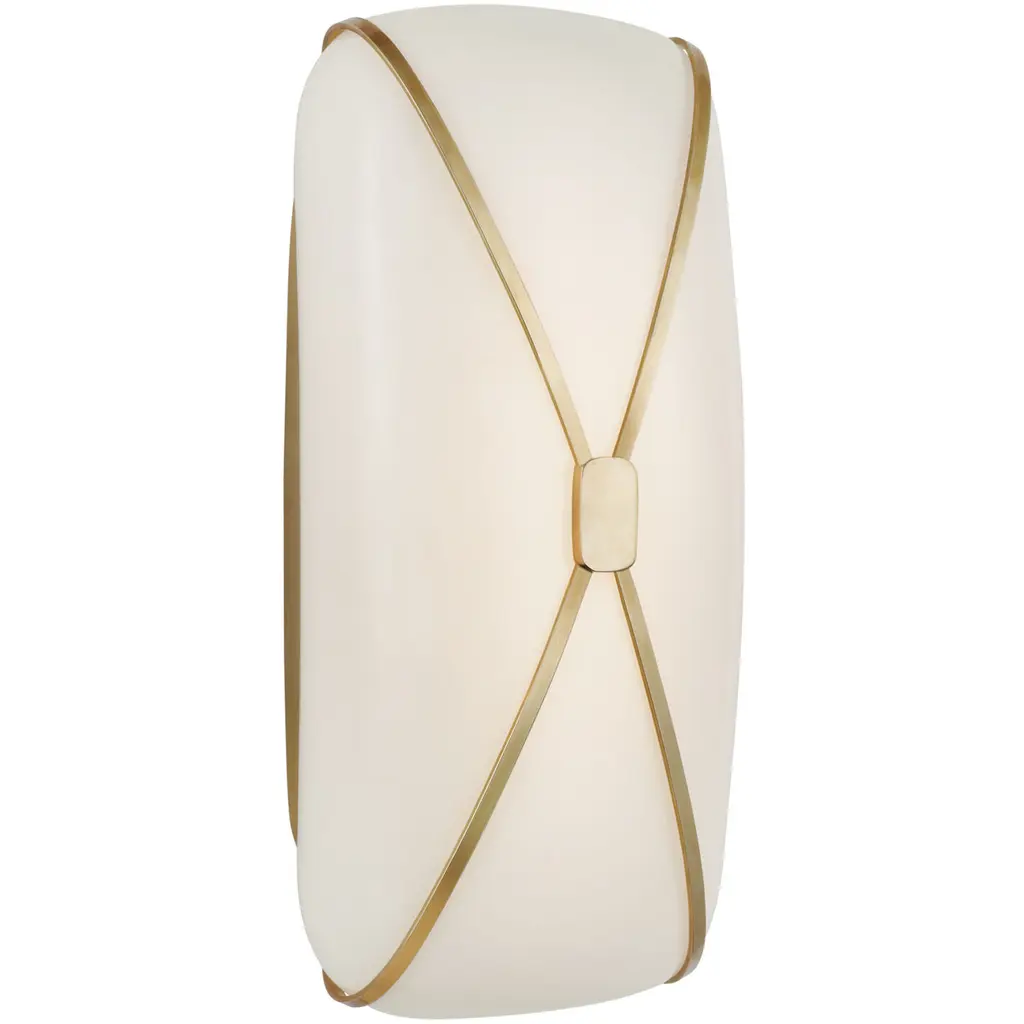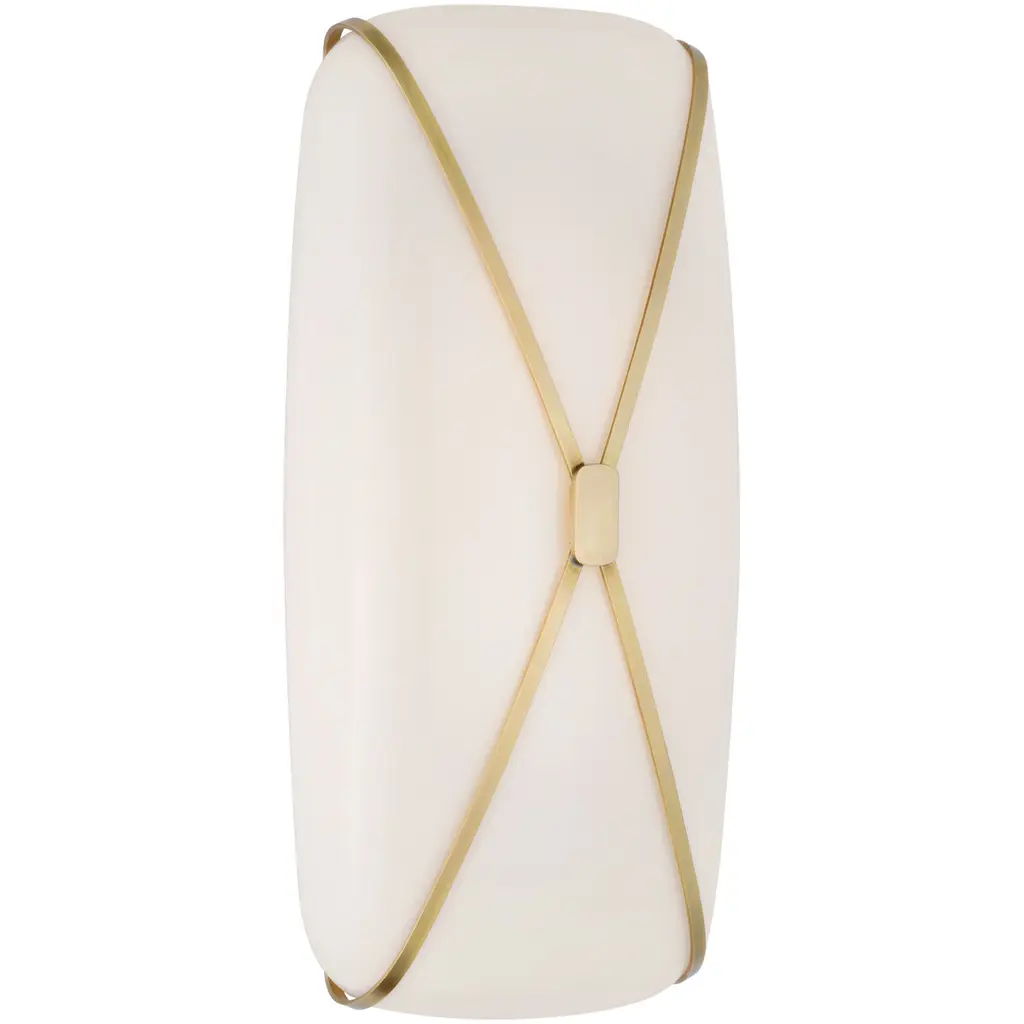 Evoking an intricately wrapped gift, the Fondant LED Bath Sconce from Visual Comfort creates an inviting tone in front of the mirror with softly filtered light. Designer Champalimaud presents an expressive yet refined piece suited for various home styles. The sconce gives off a floating appearance with a hidden backplate that slots in tight spaces. Brass hardware shaped like fine ribbons wrap across a rounded glass enclosure for a sculptural display. The ribbons create a graphic silhouette as a cozy light that filters through the glass.