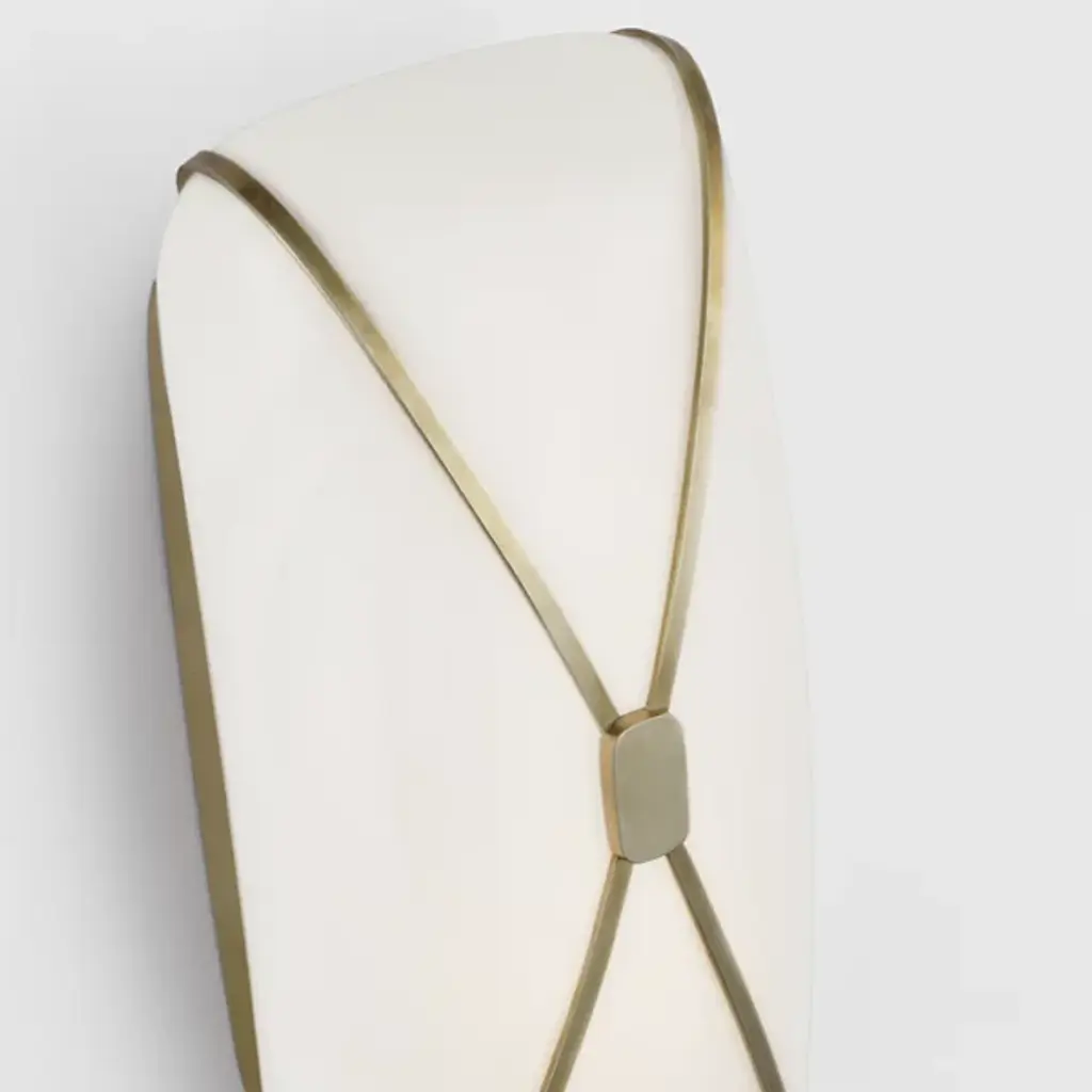 Evoking an intricately wrapped gift, the Fondant LED Bath Sconce from Visual Comfort creates an inviting tone in front of the mirror with softly filtered light. Designer Champalimaud presents an expressive yet refined piece suited for various home styles. The sconce gives off a floating appearance with a hidden backplate that slots in tight spaces. Brass hardware shaped like fine ribbons wrap across a rounded glass enclosure for a sculptural display. The ribbons create a graphic silhouette as a cozy light that filters through the glass.