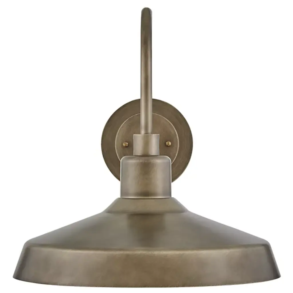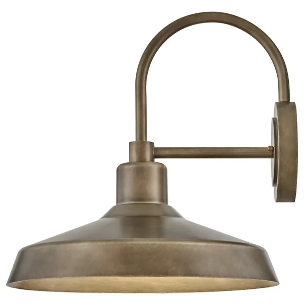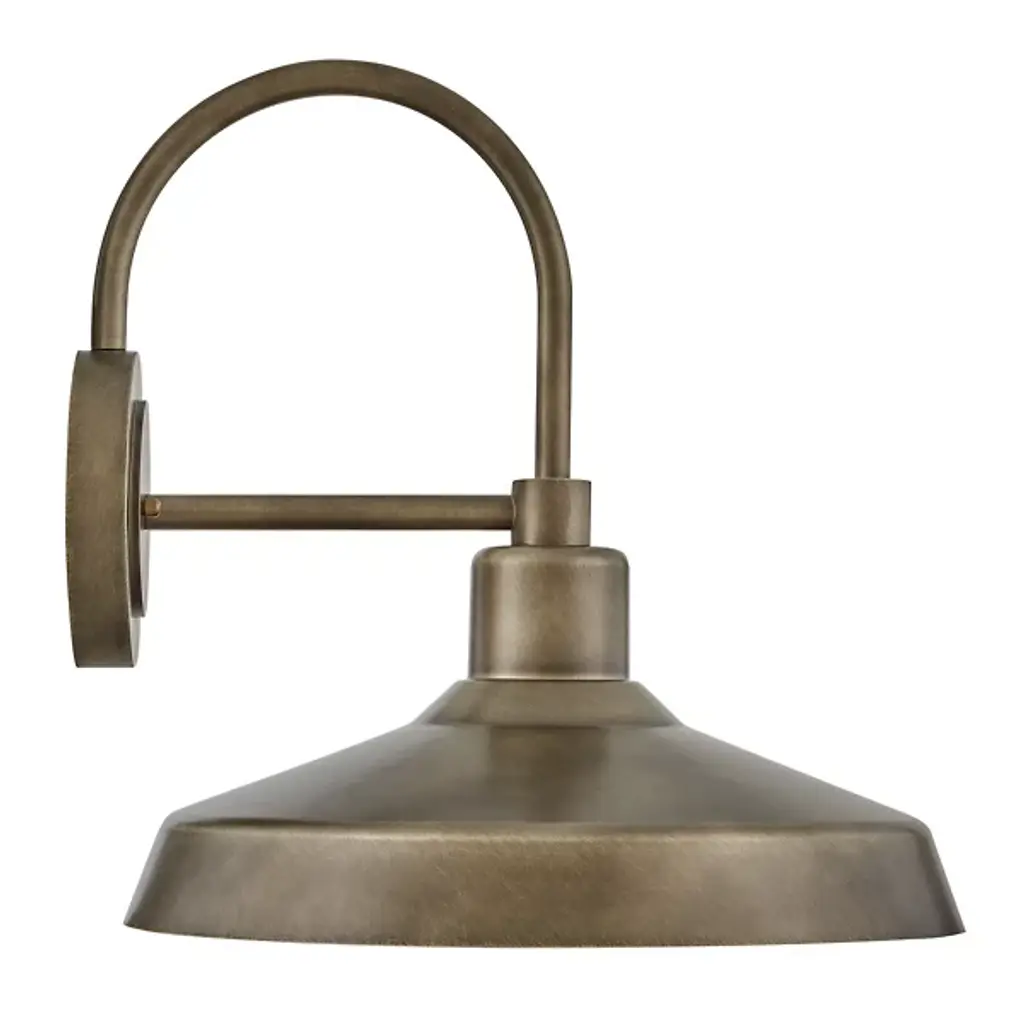 The Forge Outdoor Wall Sconce from Hinkley Lighting features a barn-inspired design with a refreshingly modern twist. This versatile fixture brings a touch of industrial flair through its stepped wall mount and curvaceous gooseneck arm. A classic lampshade rests at the end of the arm, hovering over a single bulb that casts a warm and inviting light downward. This durable fixture is designed to withstand the elements and is suitable for any outdoor setting.