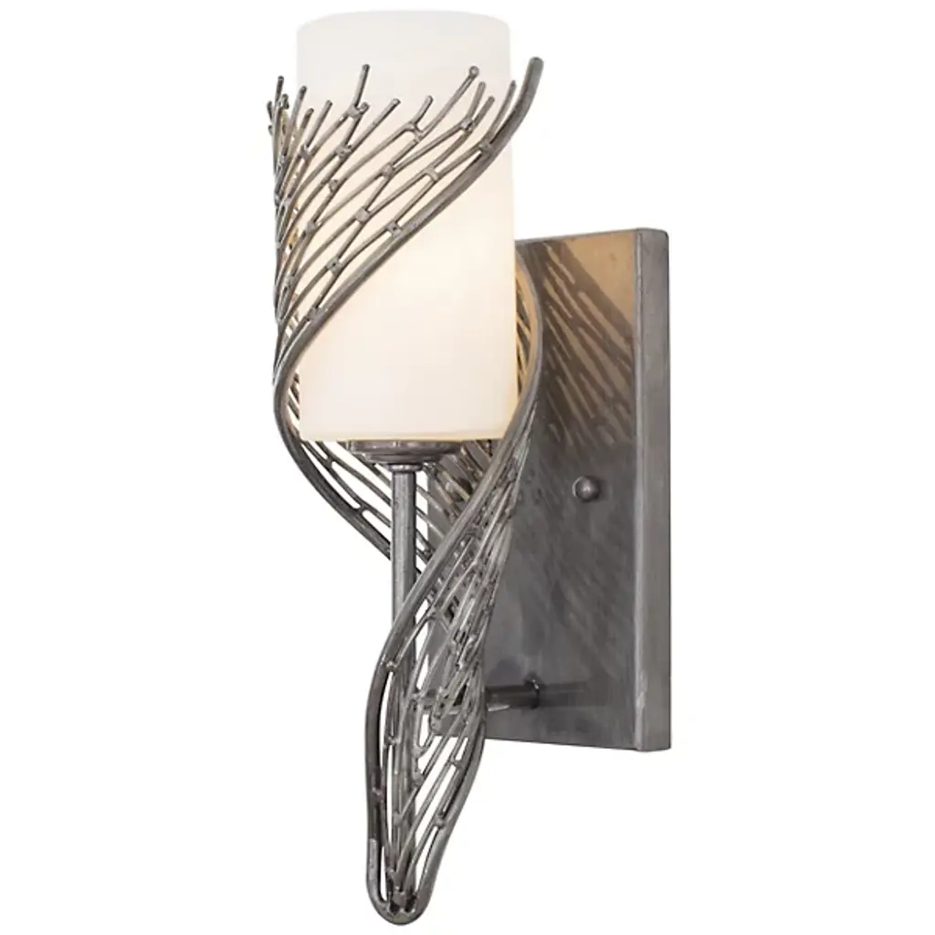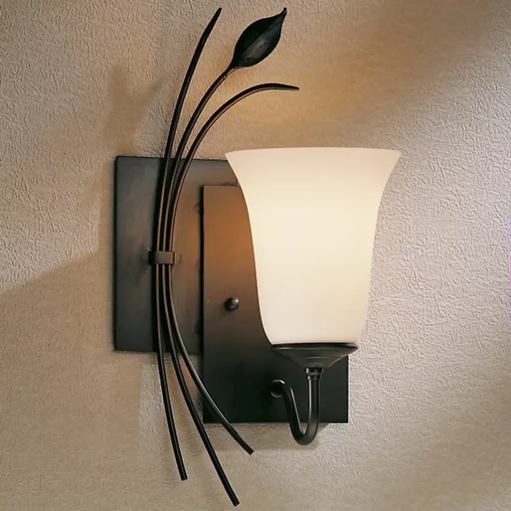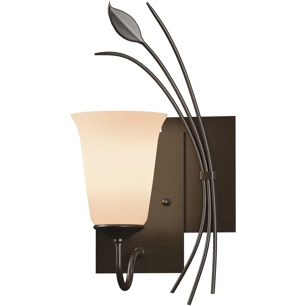 The Hubbardton Forge Forged Lead with Two Panels Wall Sconce adds an element of handcrafted luxury to interior decor and provides warm and engaging uplighting. The Two Panels With Forged Leaf Wall Sconce features hand-forged wrought iron, hand-blown glass and translucent finishes.