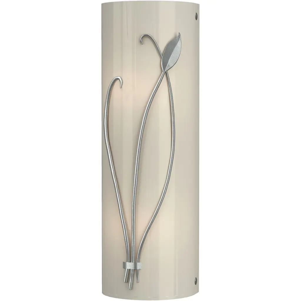 Minimal and refined, the Forged Leaf and Stem Wall Sconce by Hubbardton Forge brings the beauty of simple design into the home. Adding some elegance to a crisp half cylinder Glass shade, a hand forged Iron bundle of stems and a leaf are featured. While warmly diffusing light, the clean silhouette of the shade keeps this sconce classic and effortless. The graceful handcrafted elements of this piece are an excellent addition to entryways, hallways, and bathrooms.
