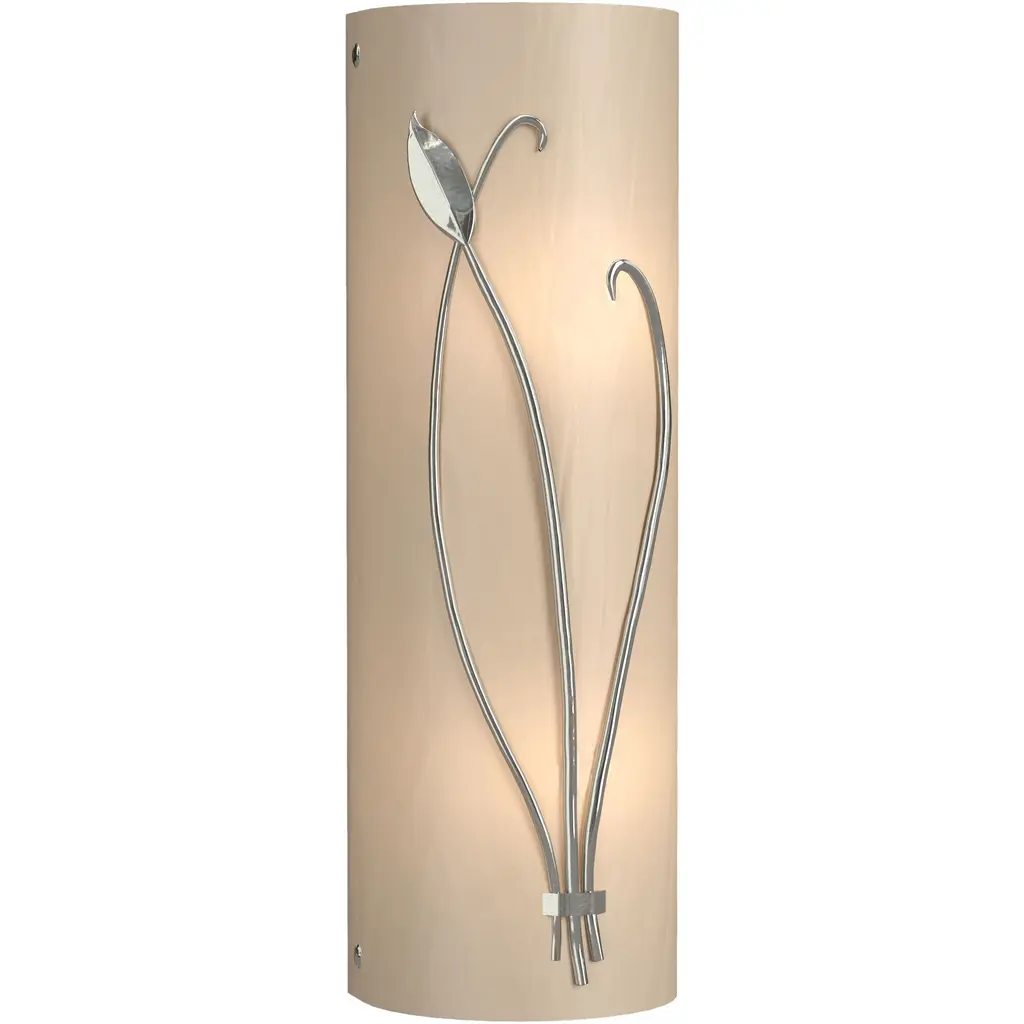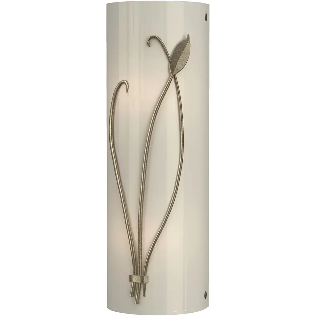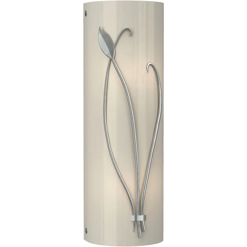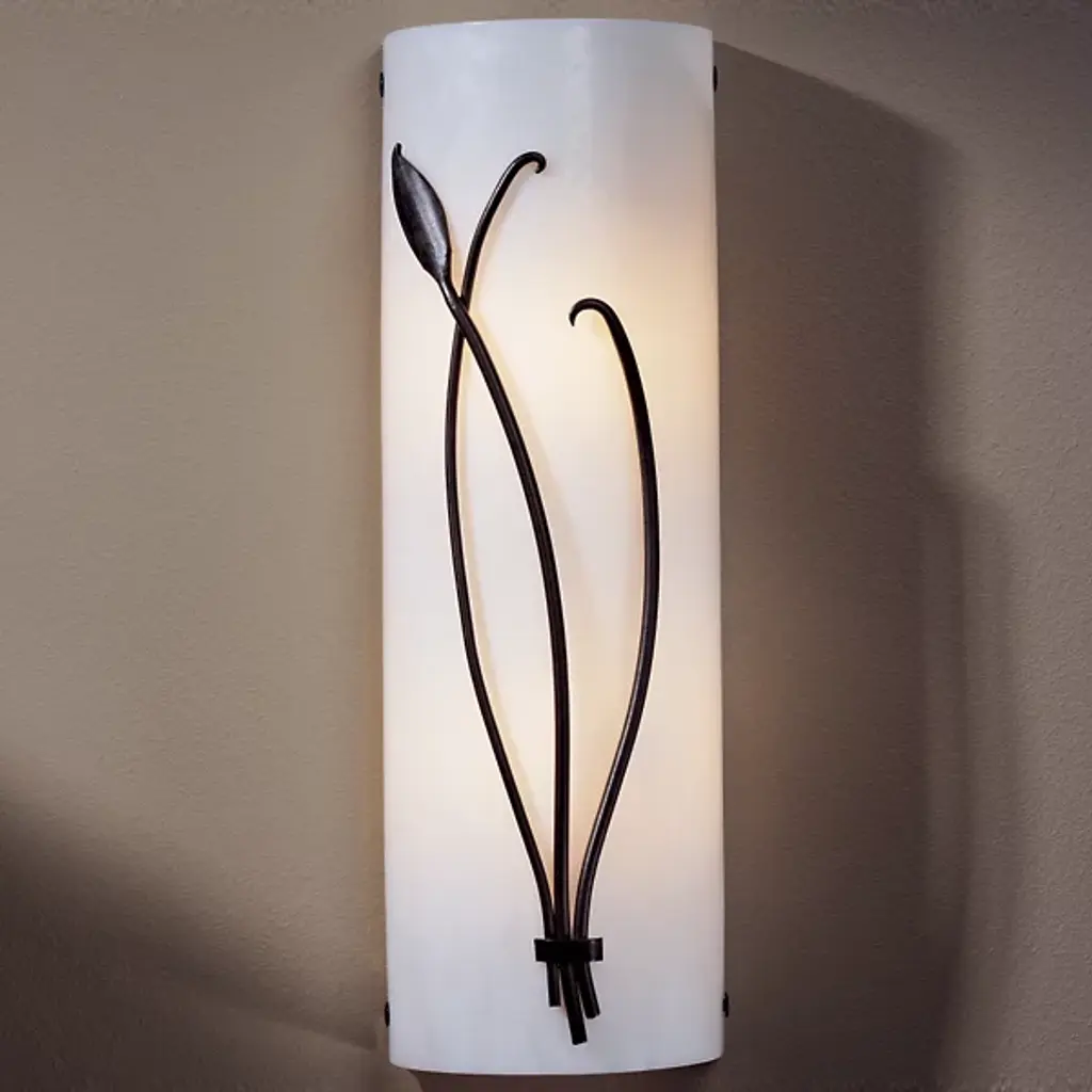 Minimal and refined, the Forged Leaf and Stem Wall Sconce by Hubbardton Forge brings the beauty of simple design into the home. Adding some elegance to a crisp half cylinder Glass shade, a hand forged Iron bundle of stems and a leaf are featured. While warmly diffusing light, the clean silhouette of the shade keeps this sconce classic and effortless. The graceful handcrafted elements of this piece are an excellent addition to entryways, hallways, and bathrooms.