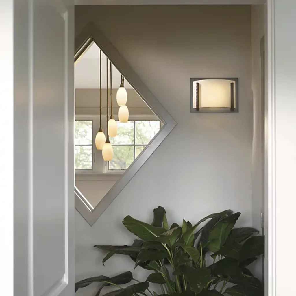 The Forged Vertical Bars Wall Sconce from Hubbardton Forge uses line and shape to highlight its slim and unassuming design. A composition of dark and light color is used to contrast the rectangular iron accents with the modesty of the lamp shade. With its translucent and slightly curved hand-blown glass shade, light fans upwards and downwards creating an elegant shadow play on walls. Paired with another Forged Vertical Bars Wall Sconce, the piece works wonderfully flanking a bed and large artworks to create an interesting framing effect.