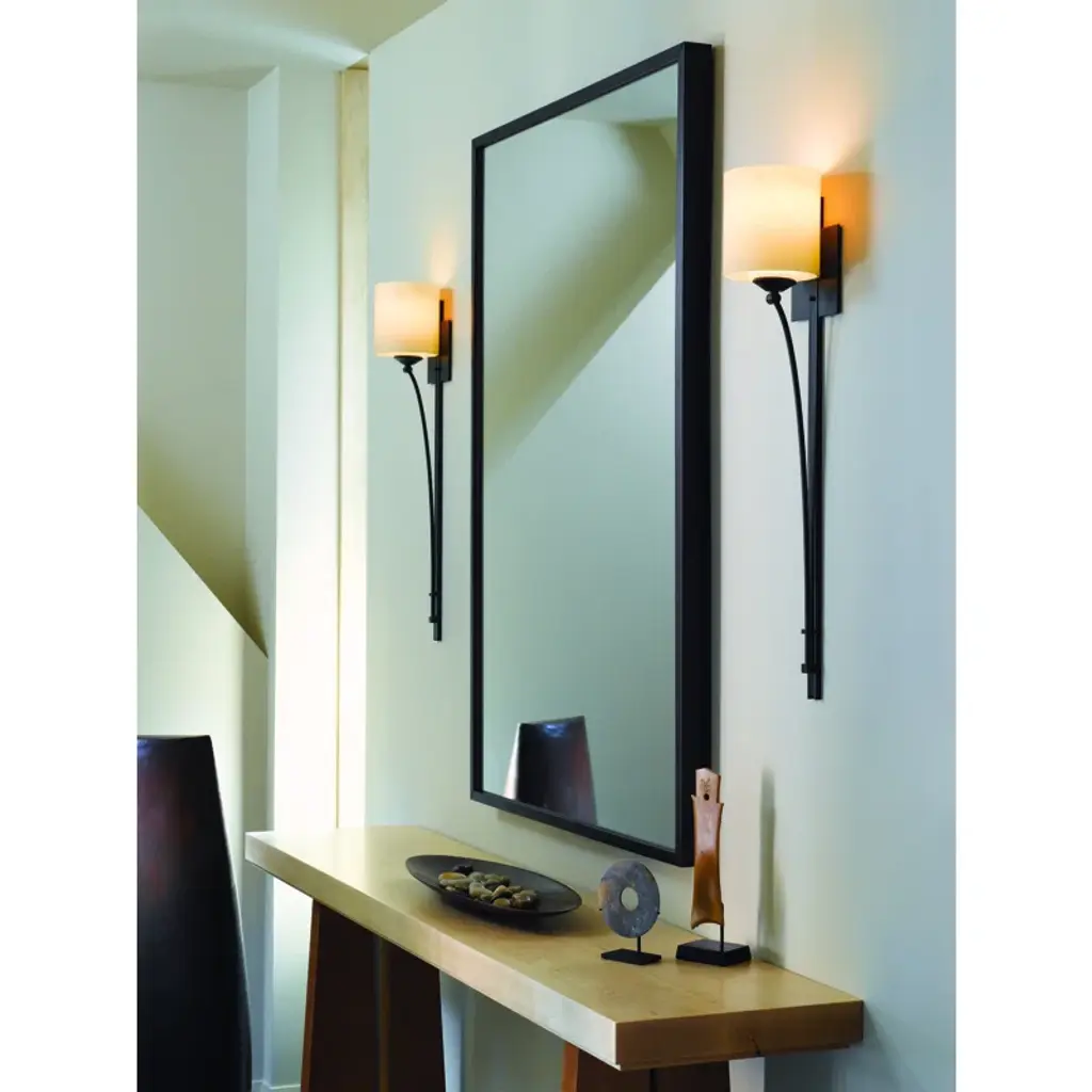 Our Formae Sconce offers a contemporary take on the traditional taper. A tube of curved steel slowly peals from the mounting plate to form a gentle arc under the glass of the cylinder. Forged and formed by our artisans, each piece is unique. All Hubbardton Forge products are hand-crafted to last one at a time in Vermont.