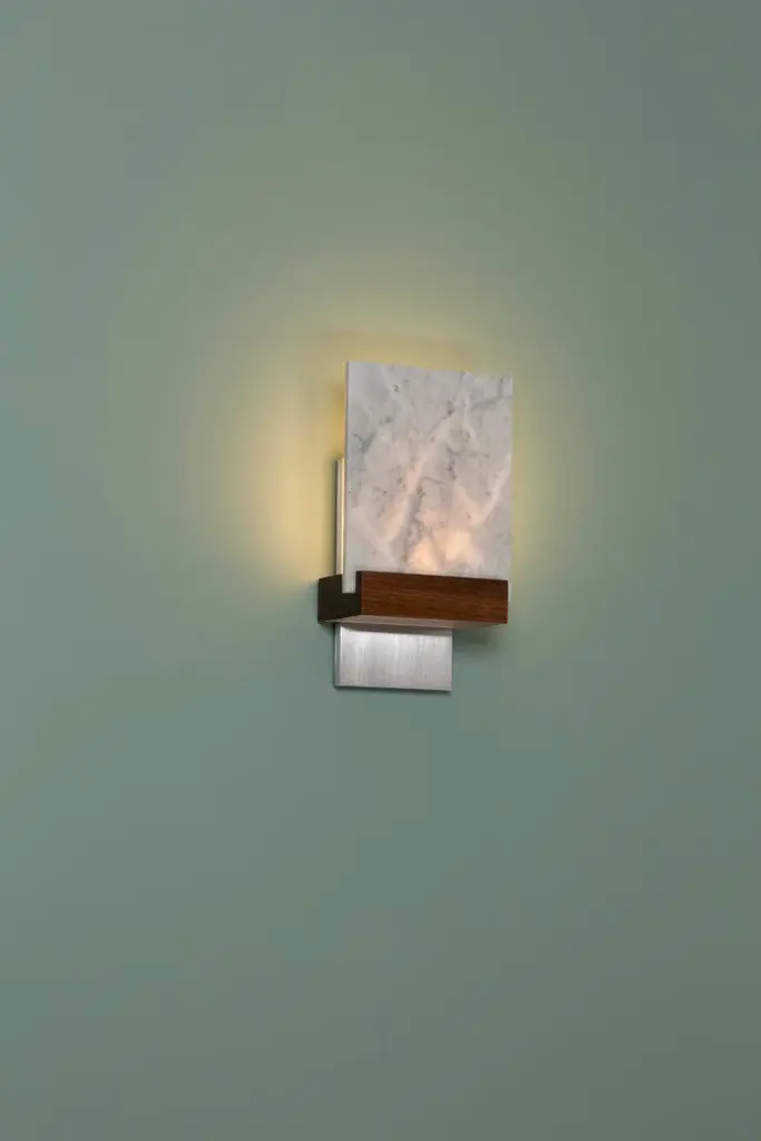 Fortis Led Wall Sconce, Dark Stained Walnut, Brushed Brass, Carrara Marble