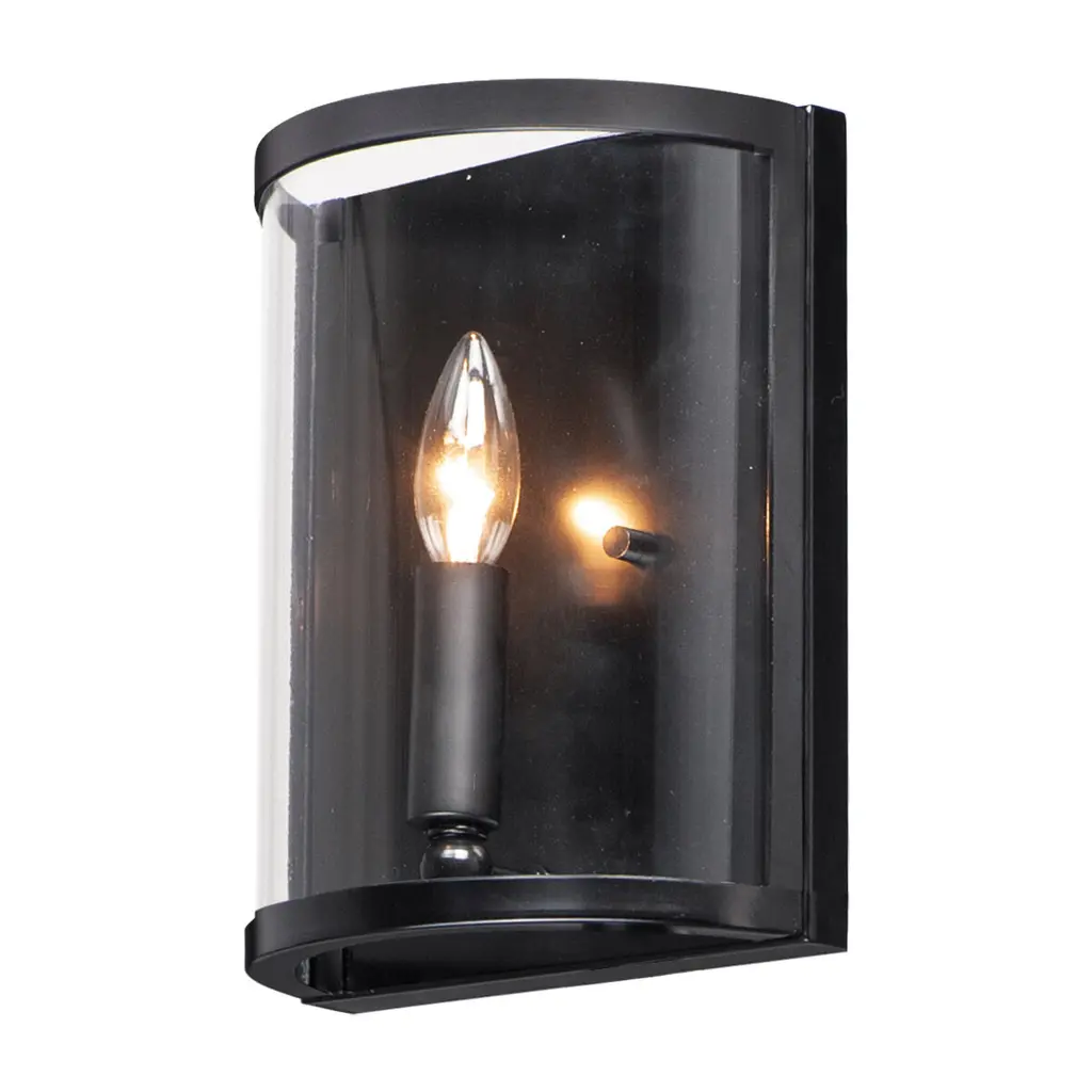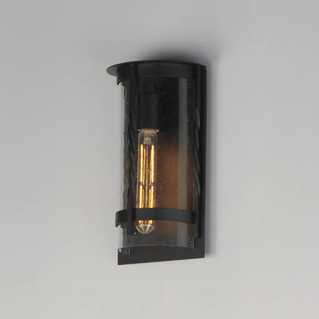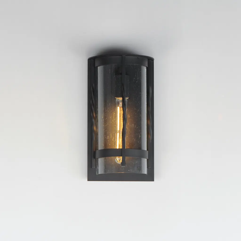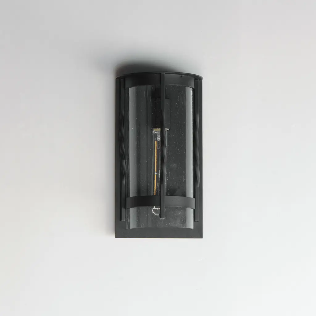 Forged iron spindles twist along the frame of a half round sconce. Transitional in design, they are finished in a Neutral Black outdoor rated powder coat and feature Clear Seeded glass. Use tubular lamps to accentuate the height of the sconces.