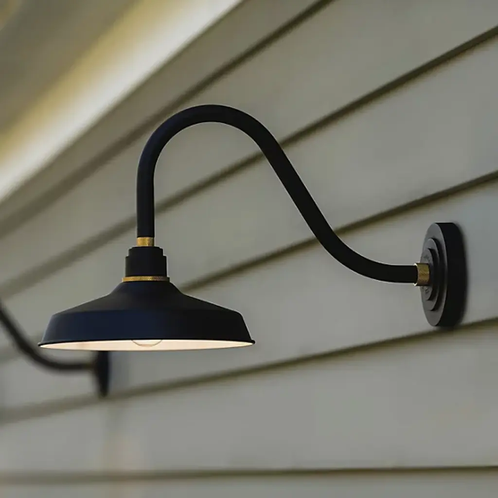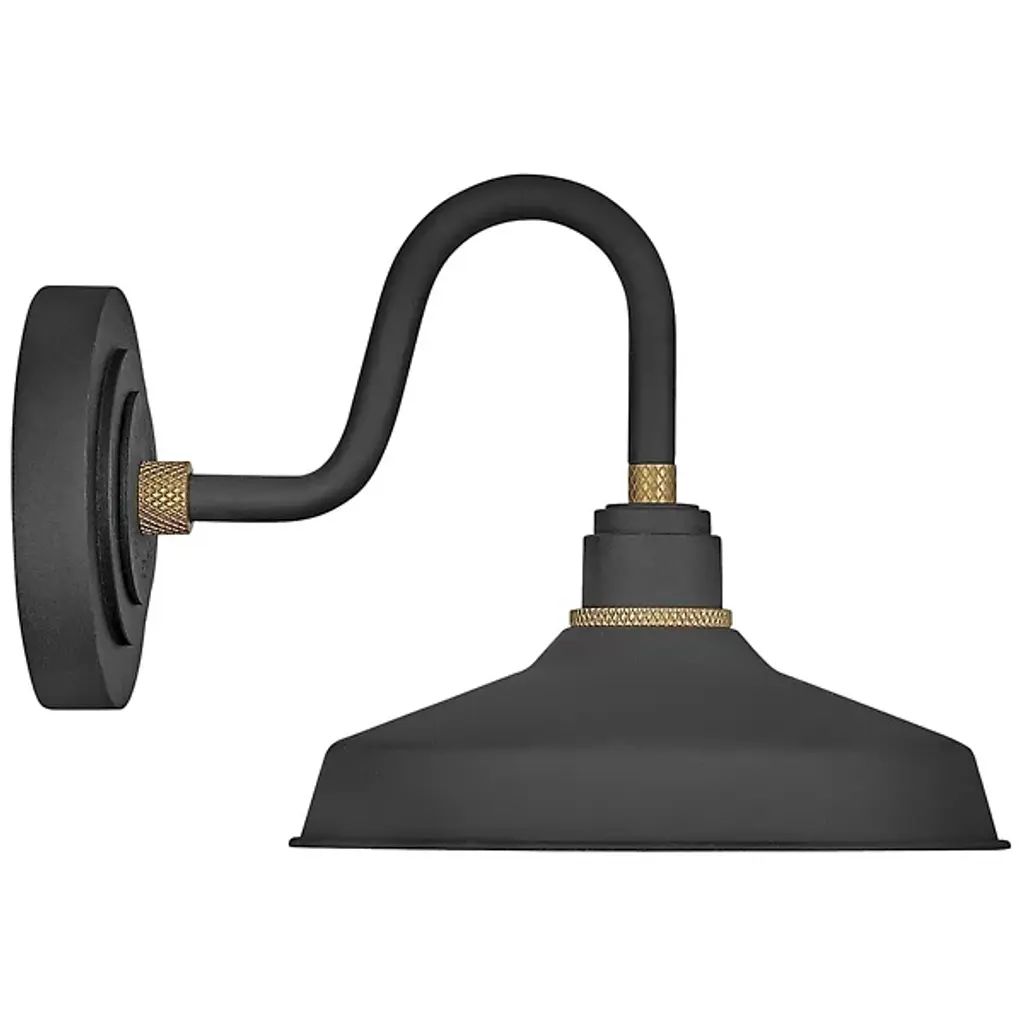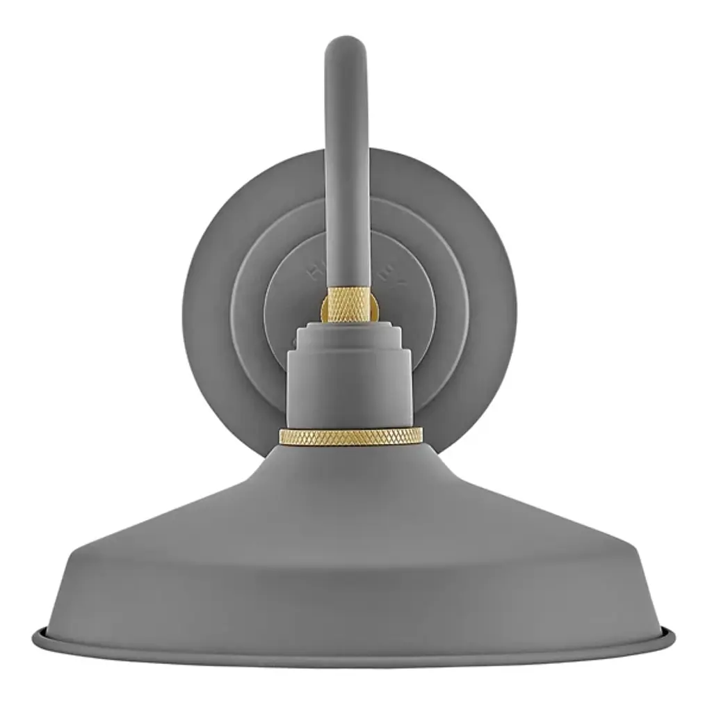 Eloquent and industrial, the Foundry Outdoor Wall Sconce and Hinkley Lighting leaves an indelible impression. Focused and direct, it sends out a single curving stem from a stepped circular wall mount, setting a sturdy aluminum dish shade around damp, Dark Sky-rated lamping. The knurled brass details offset the smooth surface of the rest of the fixture, pouring out a mix of direct downlight and diffused ambiance below.