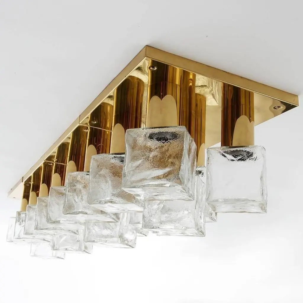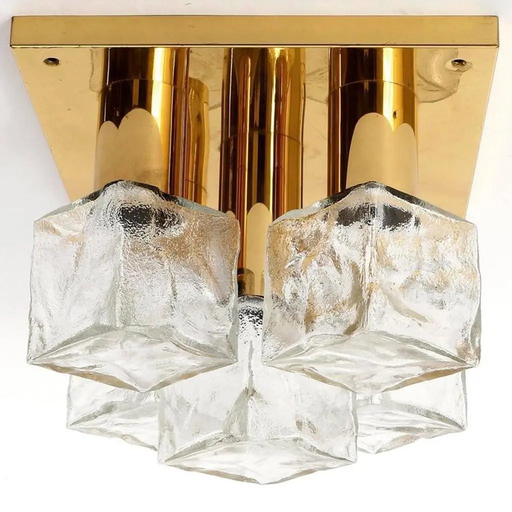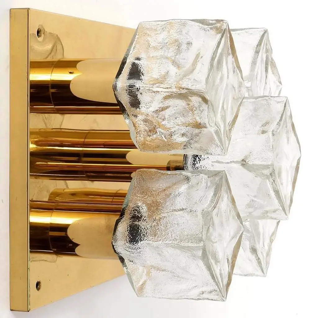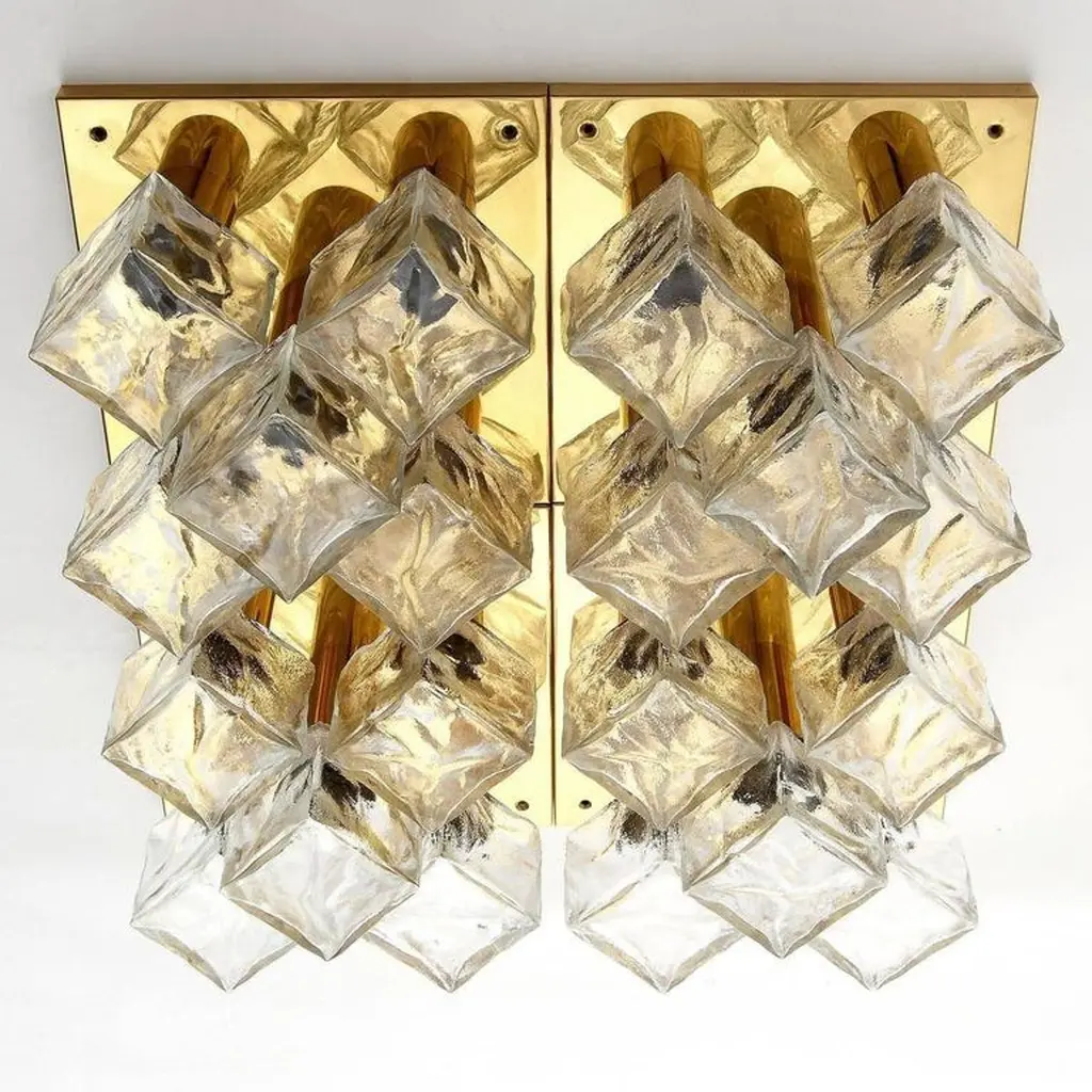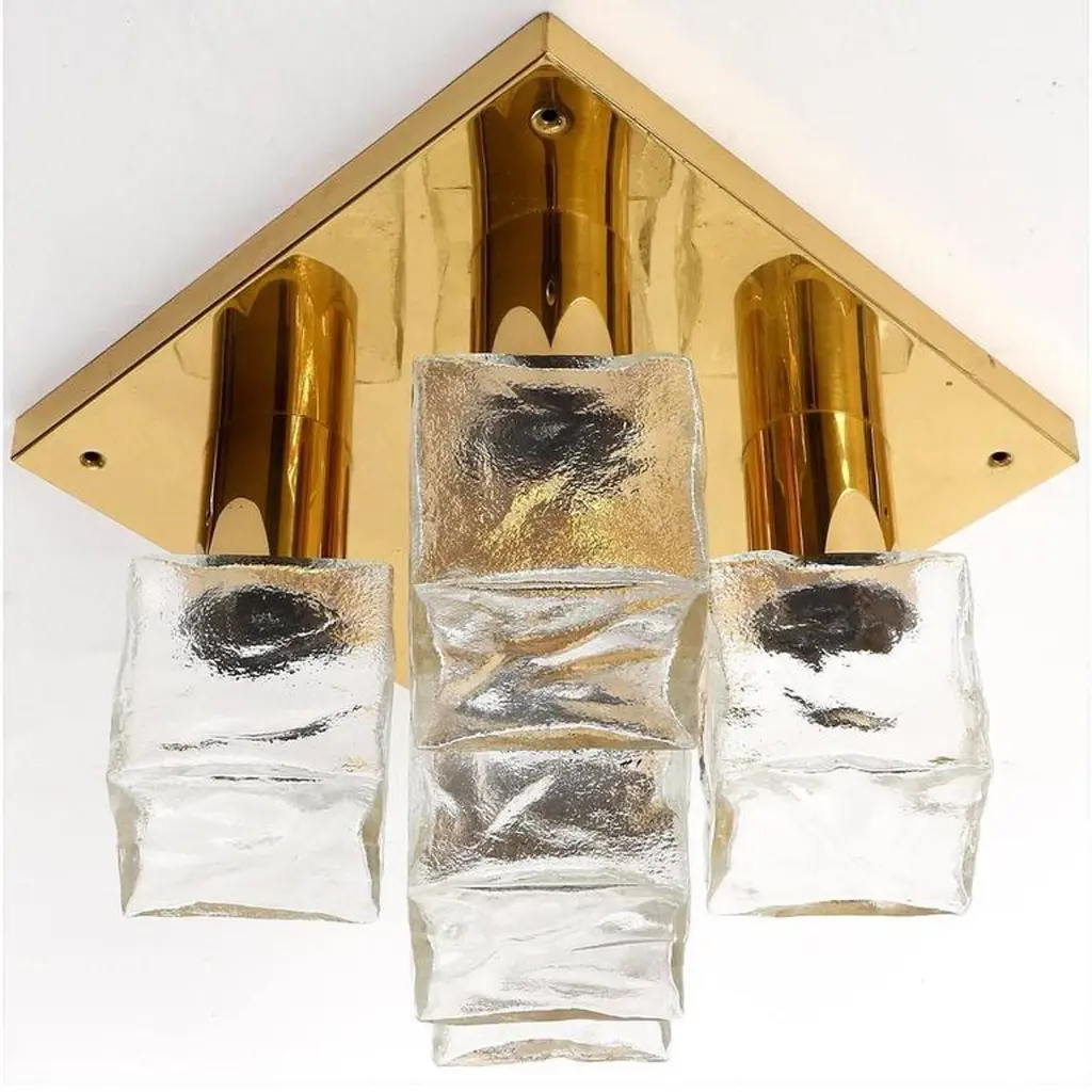 One of four modulare and square light fixtures model 'Cubus' (German 'Würfel') by Kalmar, Austria, manufactured in Mid-Century, circa 1970 (late 1960s or early 1970s).They are made of polished brass and frosted cubic glasses. Each fixture has five sockets for small base Edison LEDs or bulbs up to 40W per bulb which are covered with textured ice glass cubes. It is possible to install this fixture in all countries (US, UK, Europe, Asia, Canada,) although it may be necessary to purchase different light bulbs (e.g. LED or filament) suitable to local electricity. It also can be used with a dimmer.The fixtures are professionally cleaned and ready to use.The lamps can be used as wall or ceiling lights. They also can be grouped and arranged individually to larger light sculptures (please see images).Additionally there are three larger lights in the same manner with 13 glasses available (last image).The price is per lamp. They will be sold individually, as pair, or as set of three or four. Shipping cost depends on number ordered items.