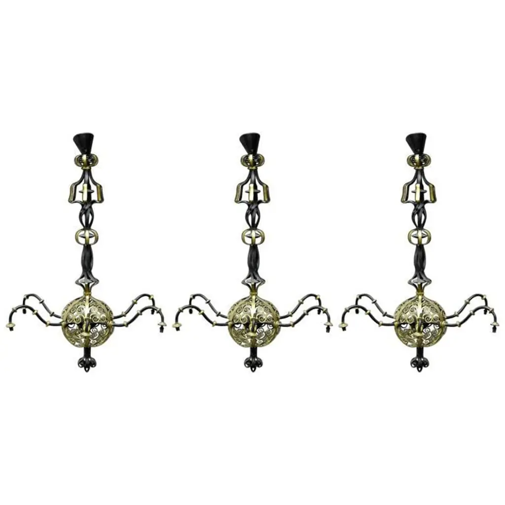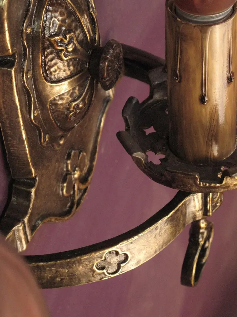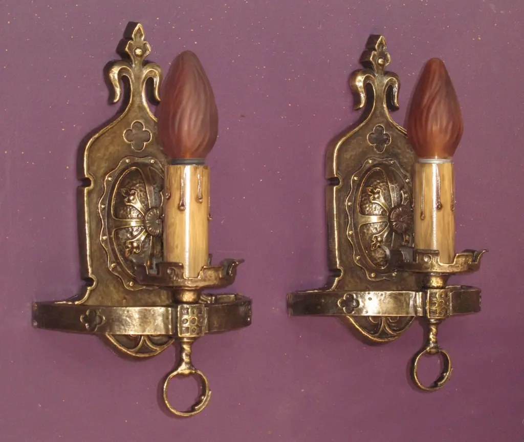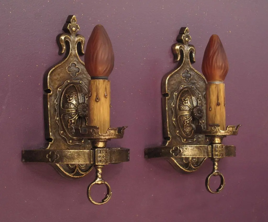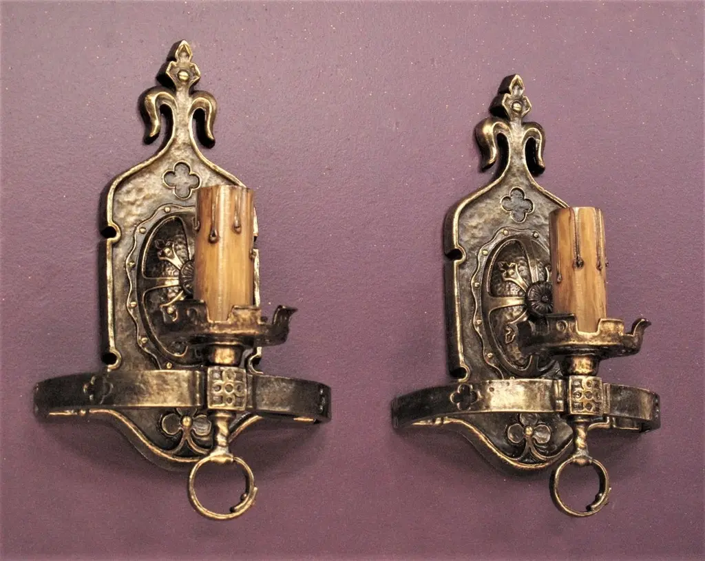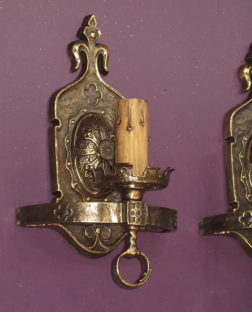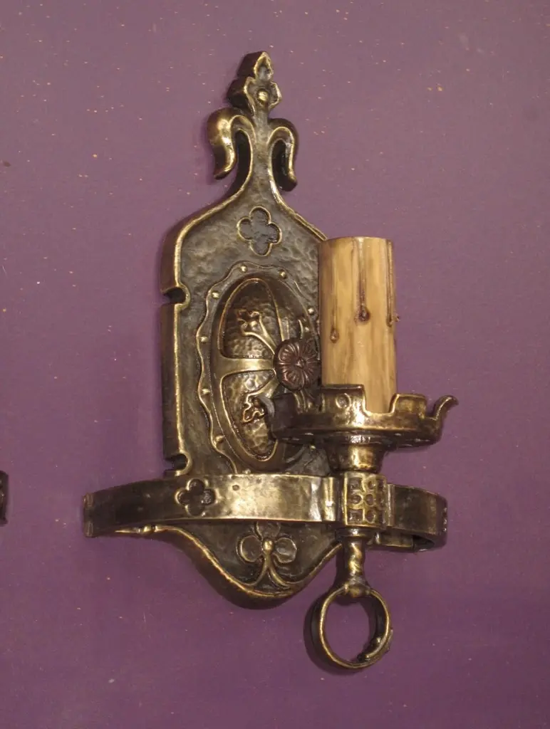 Priced per pair with two pair available.Manufacture by Lion, these are hefty in both weight and design. Restored to bring out the solid cast brass construction as well as all the elements incorporated into the design. With no paint used in their restoration, what you see is the patinated brass with a warm sealer coat which allows the brass highlights to remain.Embellished with trefoil, Fleur De Lis, battlements around the socket cups, and quatrefoil, these offer a stately presence indeed.The fleur de lis traditionally represents the virtues of perfection, light and life.A design unique to Lion, the socket is attached to a 1/2 round arm giving depth to the fixture.If you would like the bulbs to be included free please request them at time of purchase. We only have a limited supply of these bulbs and we no longer can find them.Measures: height: 12 1/2 incheswidth: 7 inchesProjection: 5 1/2 inches.