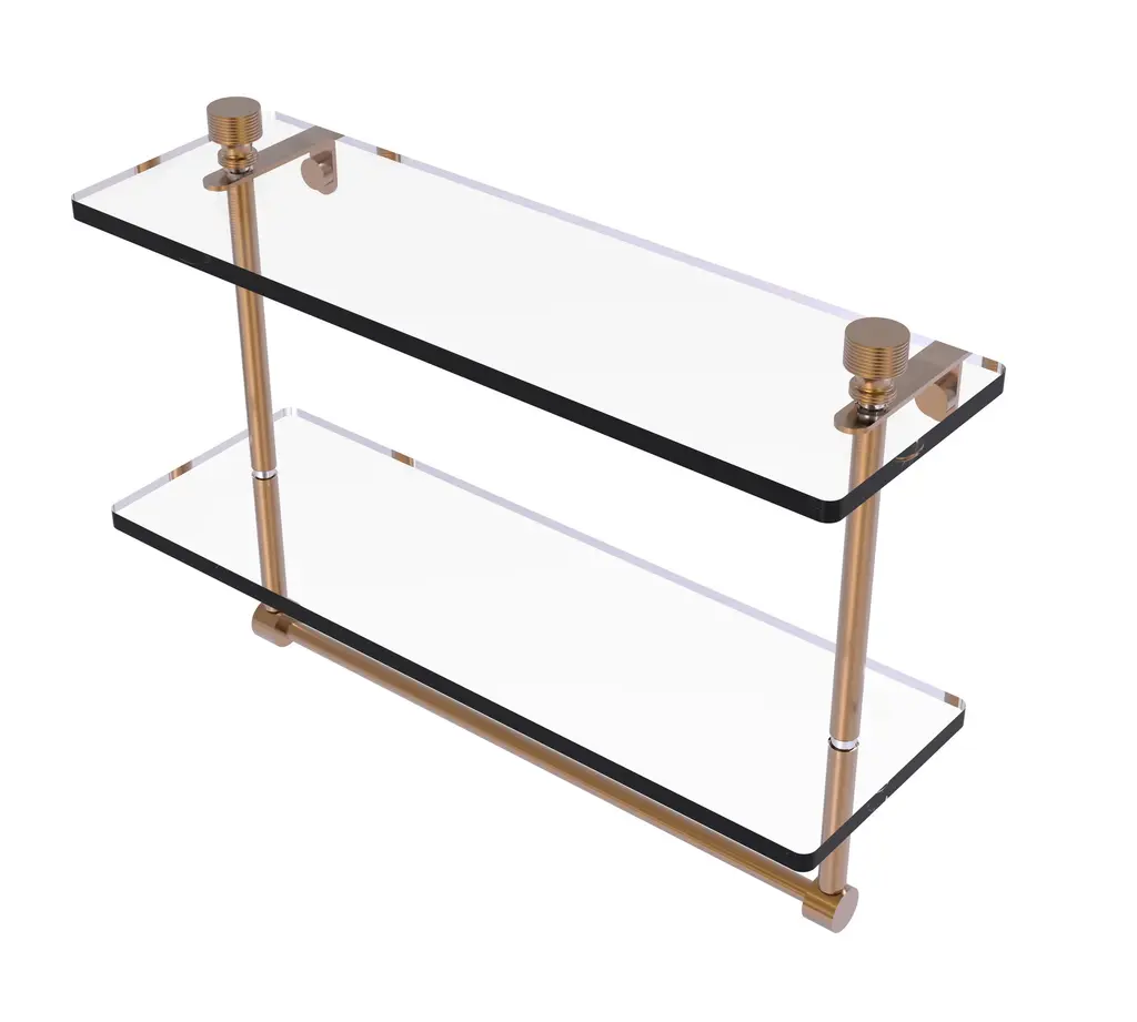 Add space and organization to your bathroom with this simple, contemporary style glass shelf. Featuring tempered, beveled-edged glass and solid brass hardware this shelf is crafted for durability, strength and style. Integrated towel bar provides space for your favorite decorative towels or for your everyday use. One of the many coordinating accessories in the Allied Brass Collection of products, this subtle glass shelf is the perfect complement to your bathroom decor.Brushed Bronze, a satin-like texture, metallic dark golden finishMade with 3/8" thick tempered glass for safety and strengthCrafted from the Finest Solid Brass MaterialsConcealed screw mounting hardware installs easilyDouble shelf is an ideal use of spaceGlass Dimension 16 Inches x 5 InchesClever design includes integrated towel bar
