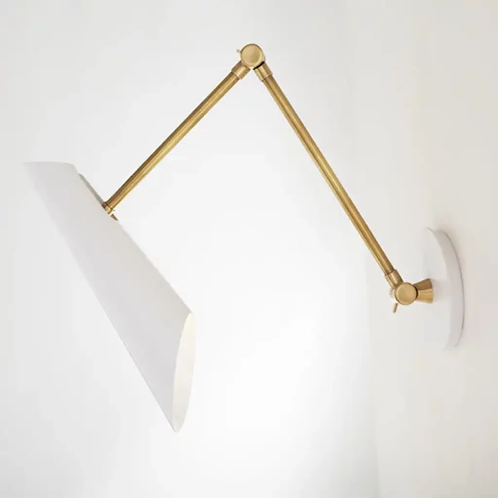 The Franca Adjustable Library Wall Sconce by Visual Comfort Signature, formerly known as Visual Comfort, brings an elegant touch to wall spaces and bedside tables within your home. An articulate, double-swing arm keeps light a reach away as this piece is anchored by a simple, circular backplate. With a sleek, contemporary sense of style, an adjustable, tapered, conical metal shade with angled ends directs and shapes the source of light within this wall sconce wherever needed. Completed with a dynamic two-tone finish, the clean lines of the extendable arm and minimalistic shapes of this piece are highlighted to lend spaces a handsome touch.