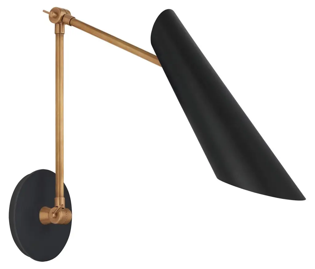 The Franca Adjustable Library Wall Sconce by Visual Comfort Signature, formerly known as Visual Comfort, brings an elegant touch to wall spaces and bedside tables within your home. An articulate, double-swing arm keeps light a reach away as this piece is anchored by a simple, circular backplate. With a sleek, contemporary sense of style, an adjustable, tapered, conical metal shade with angled ends directs and shapes the source of light within this wall sconce wherever needed. Completed with a dynamic two-tone finish, the clean lines of the extendable arm and minimalistic shapes of this piece are highlighted to lend spaces a handsome touch.