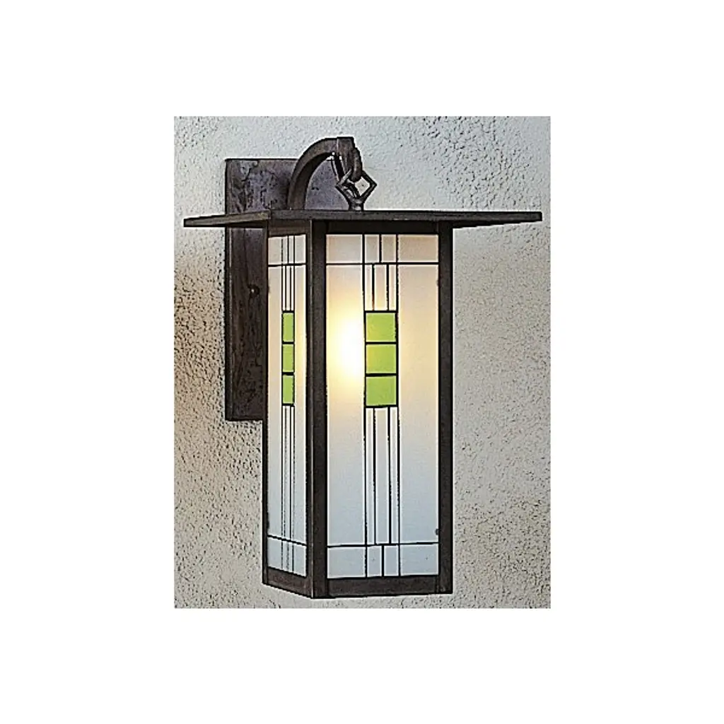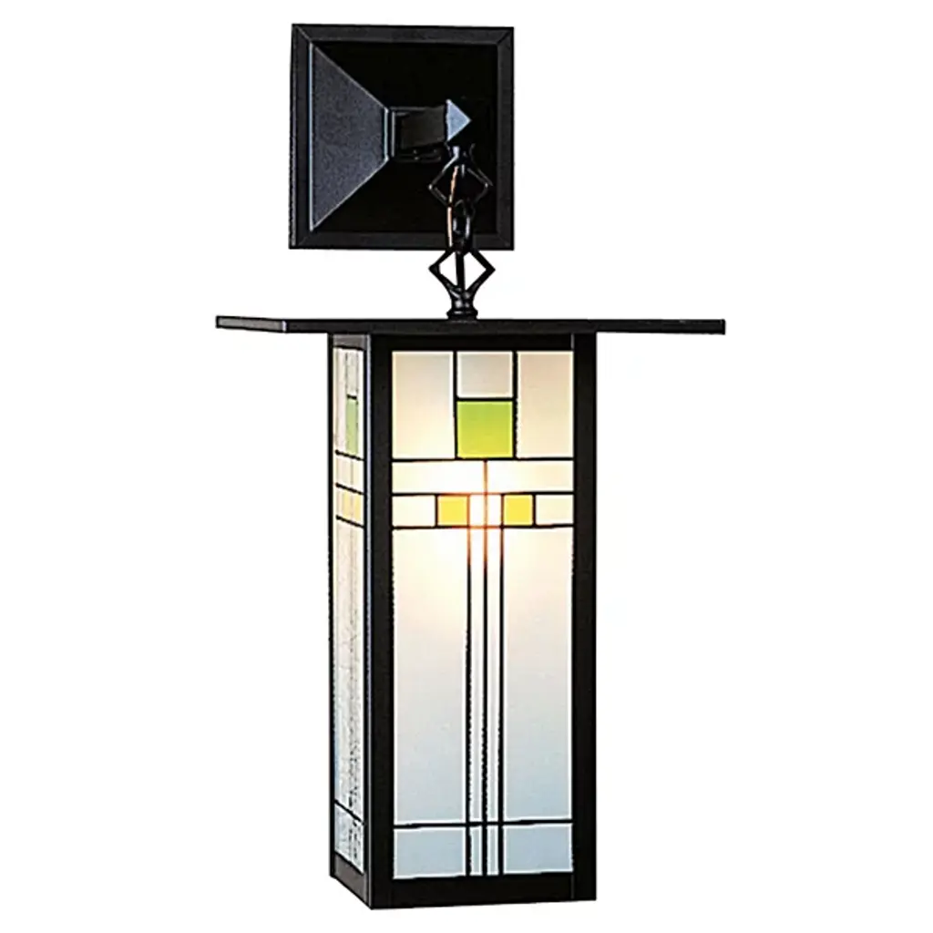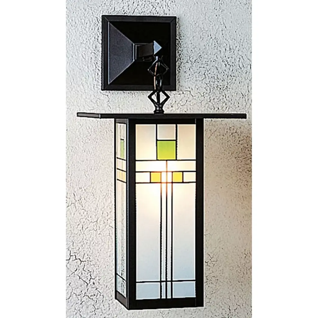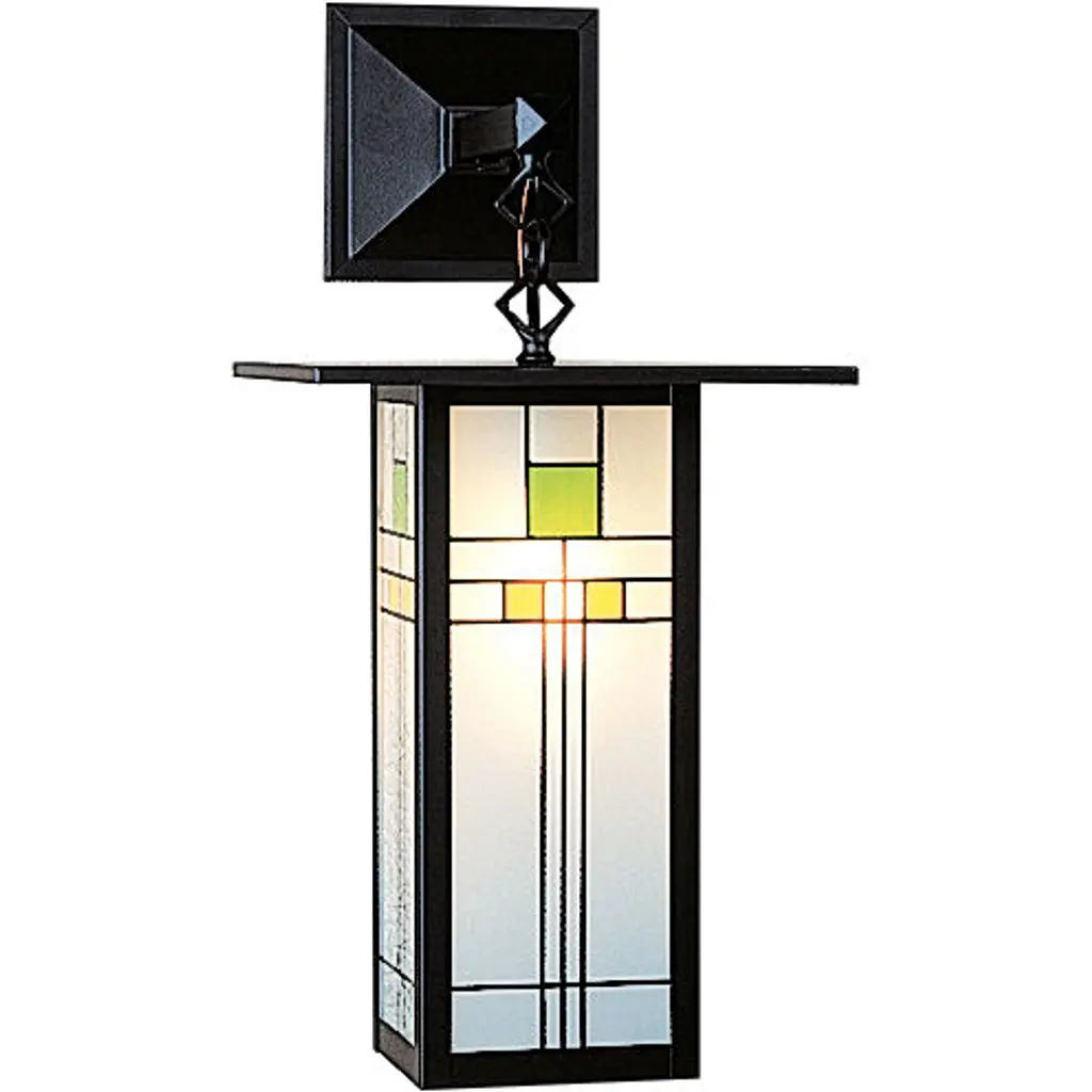 The Arroyo Craftsman Franklin Hanging Outdoor Wall Sconce is available in two distinct mounting options, both incorporating Arts and Crafts principles in their shape and design. Organic finishes and handmade, painted glass styles create a unique look for the front and back porch, perfect for adding welcoming illumination in true Frank Lloyd Wright fashion.