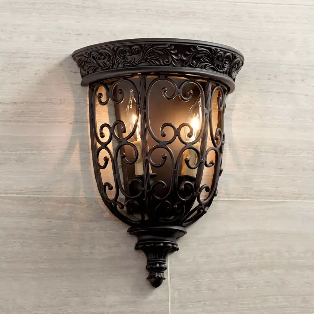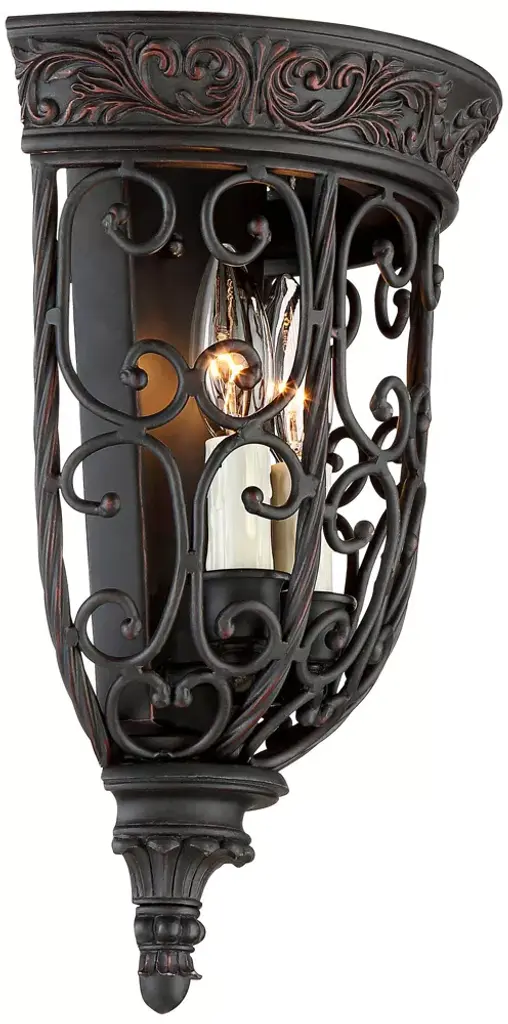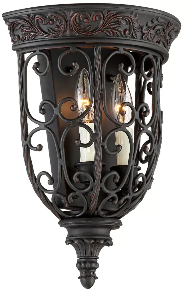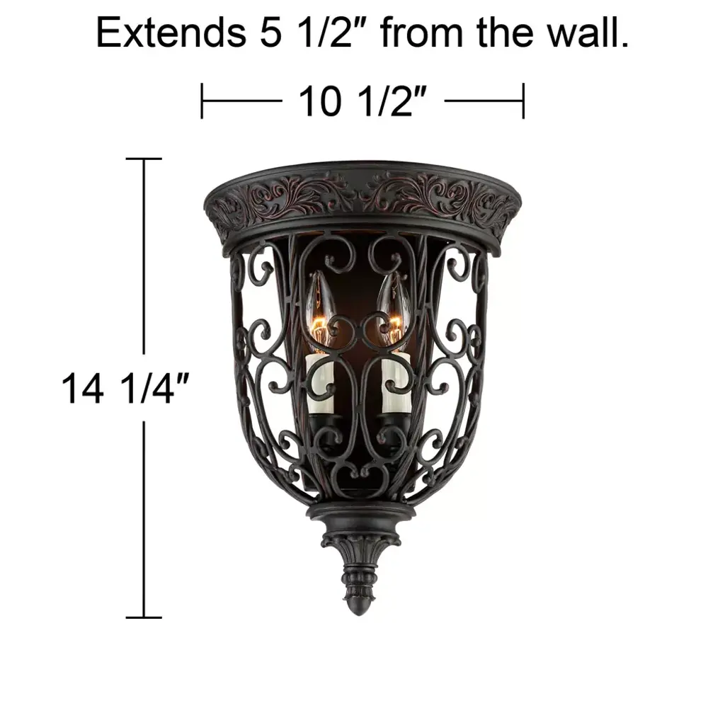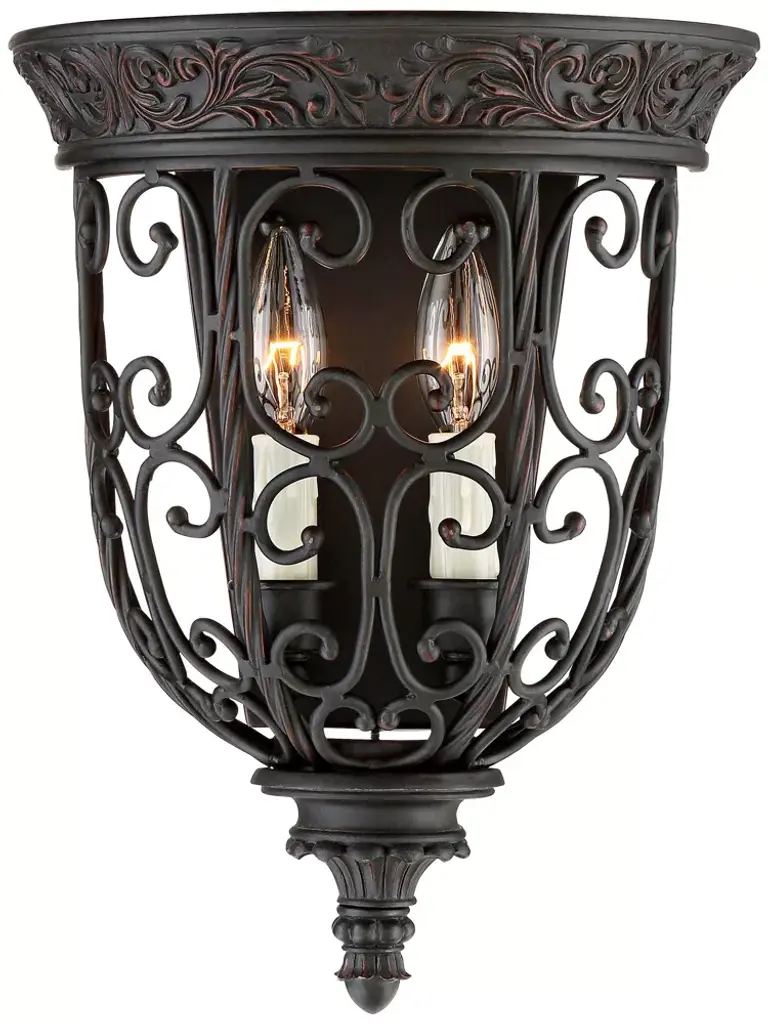 Add old world elegance and panache to your home with this design from the Franklin Iron Works™ collection. With elegant scrolls and an open look, this wall sconce lends beautiful style to hallways, living rooms and more. The sconce features a rubbed bronze ornate frame with a pair of lights standing side by side inside the open design.