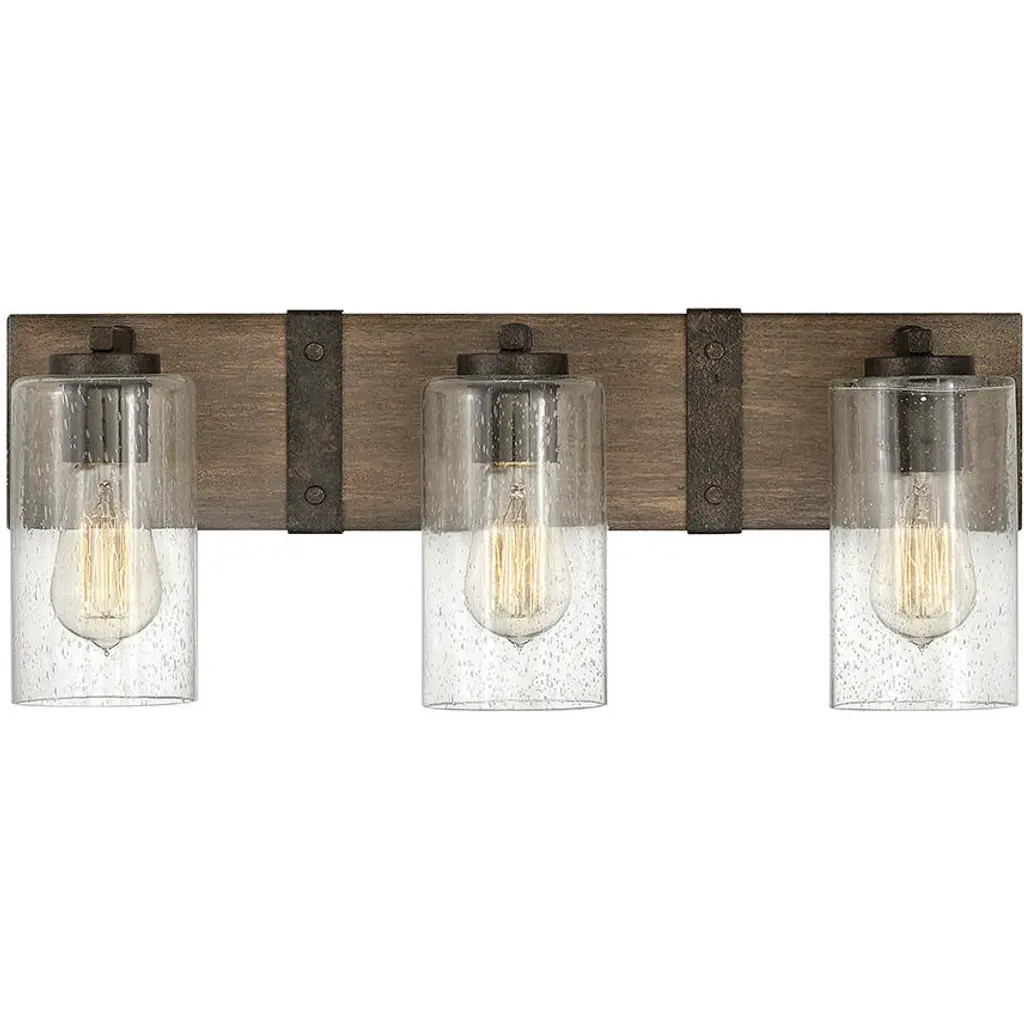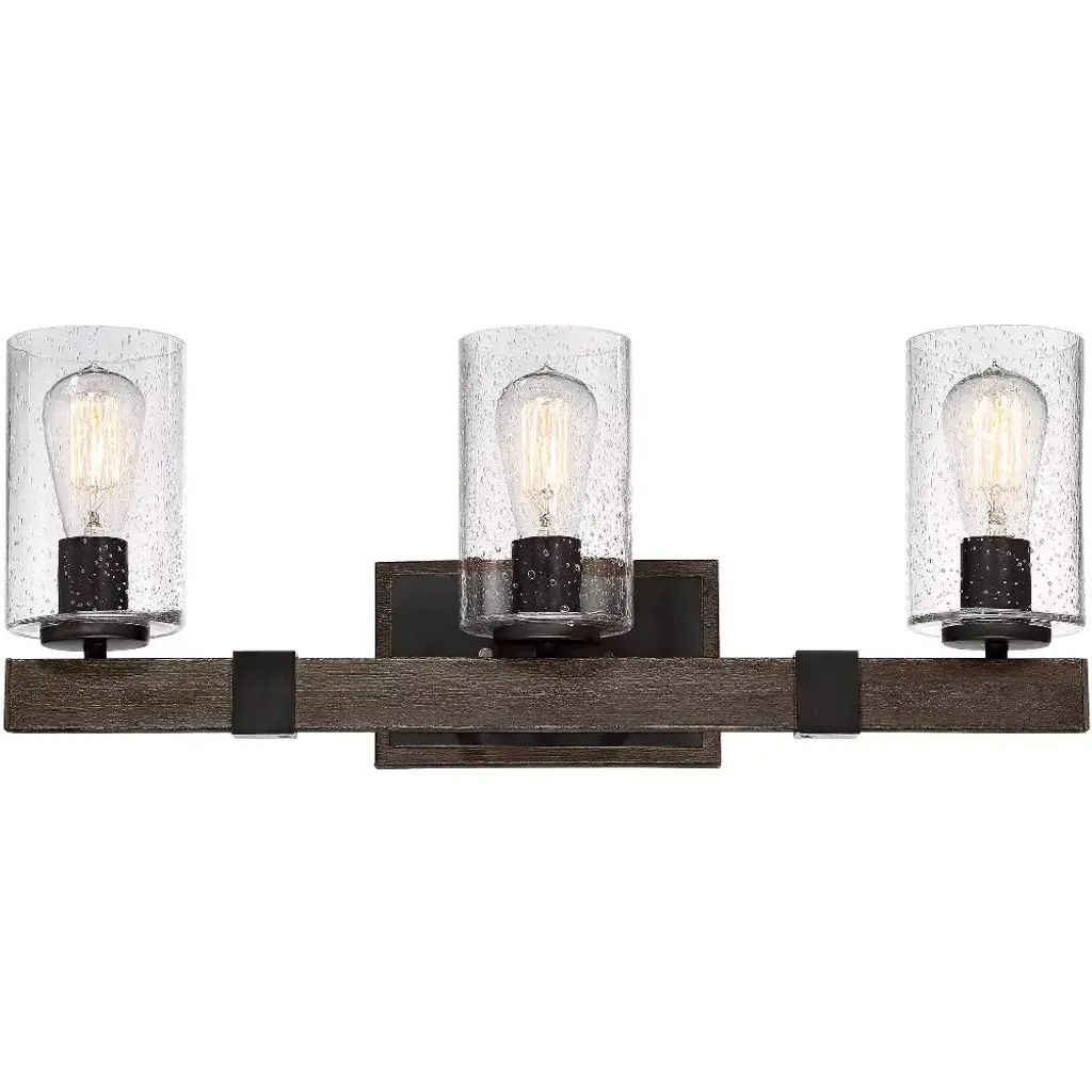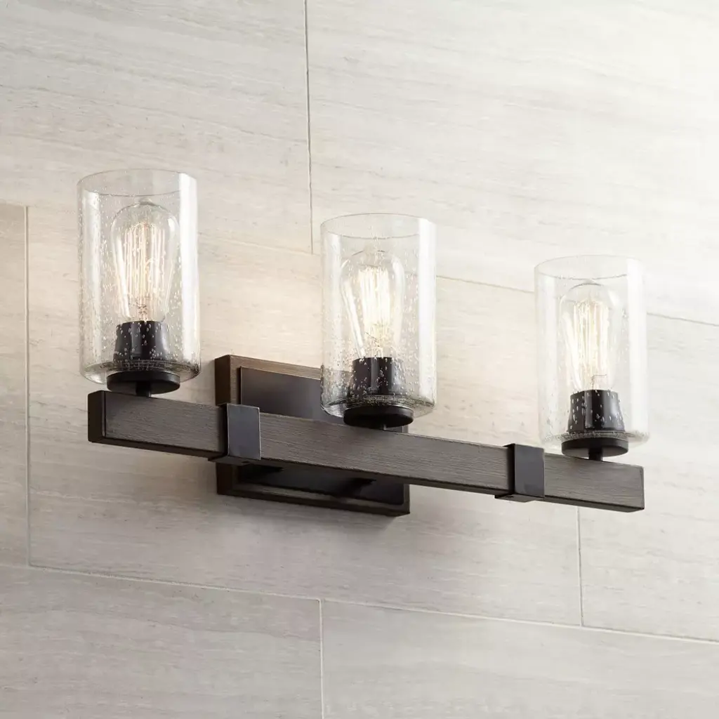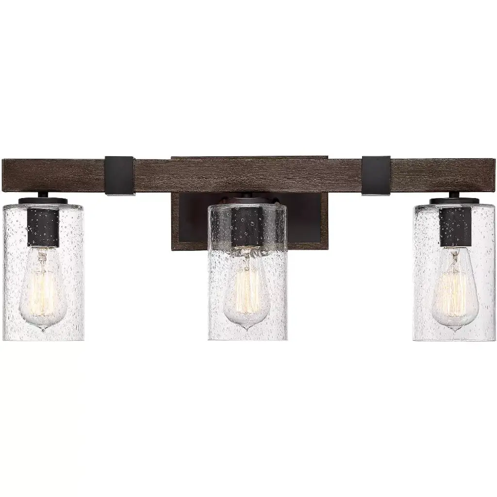 Part of the Poetry collection by Franklin Iron Works, this three-light bath bar is a wonderful blend of rustic and industrial tastes. The wood finish accents stand out against the smooth bronze finish of the backing and decorative pieces. Three clear seedy glass shades give a creative touch to this accent piece.