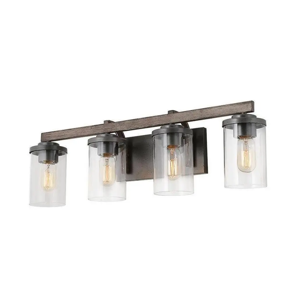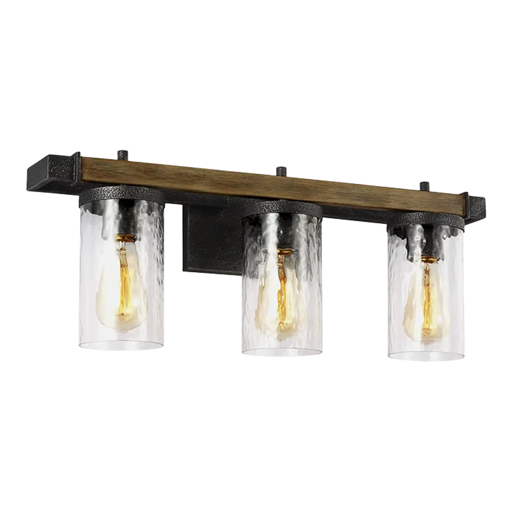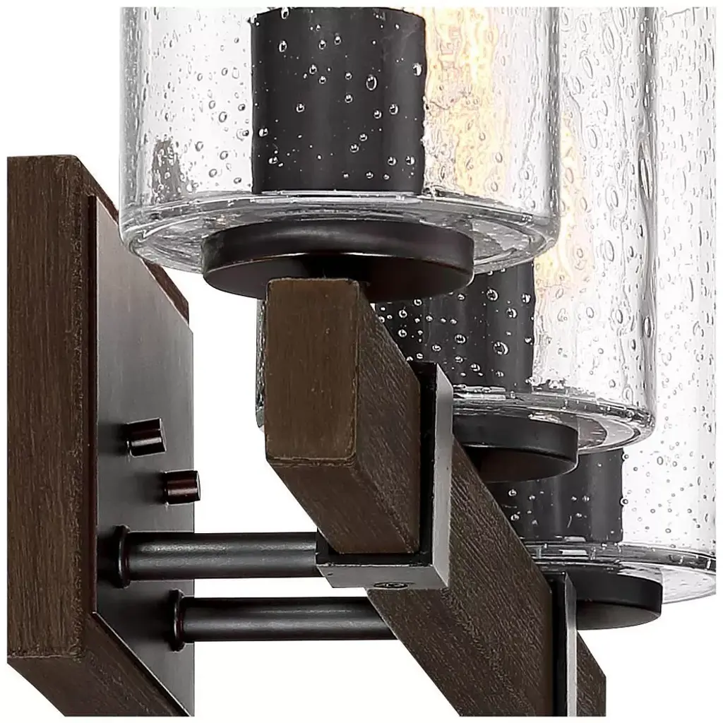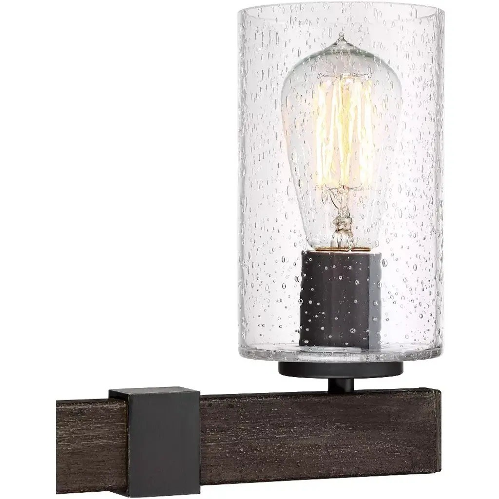 Part of the Poetry collection by Franklin Iron Works, this three-light bath bar is a wonderful blend of rustic and industrial tastes. The wood finish accents stand out against the smooth bronze finish of the backing and decorative pieces. Three clear seedy glass shades give a creative touch to this accent piece.