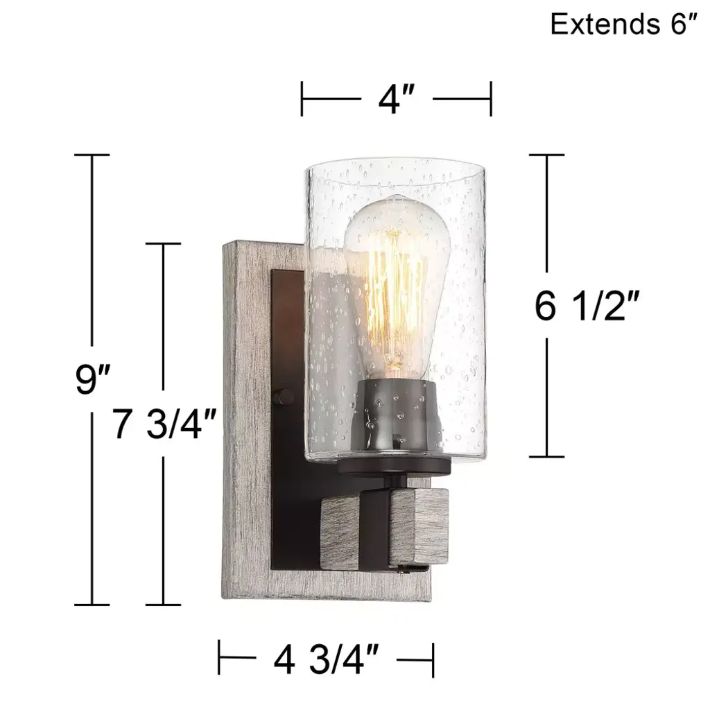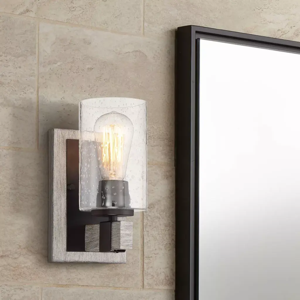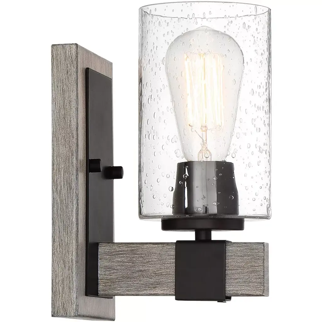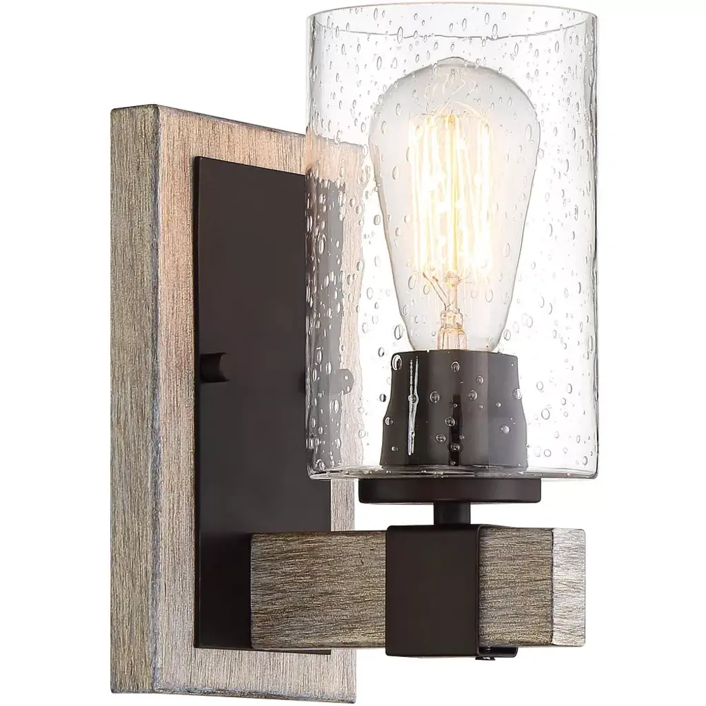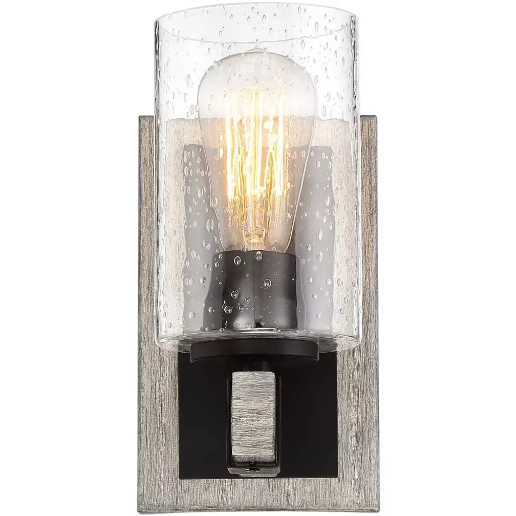 From the Poetry Collection by Franklin Iron Works, this single-light wall sconce is a wonderful blend of rustic and industrial tastes. The gray wood finish accents stand out against the smooth bronze finish of the backing and socket. A clear seedy glass shade gives a creative touch to this accent piece.