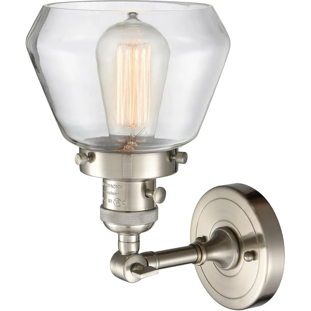 The Fulton 1 Light Sconce is part of the Franklin Restoration Collection. Solid Brass 180 Degree Adjustable Swivel with internal teeth that lock in at 5 degree intervals With Engraved Cast Cup. 3 Way (High-Low-Off) Switch Included on Socket