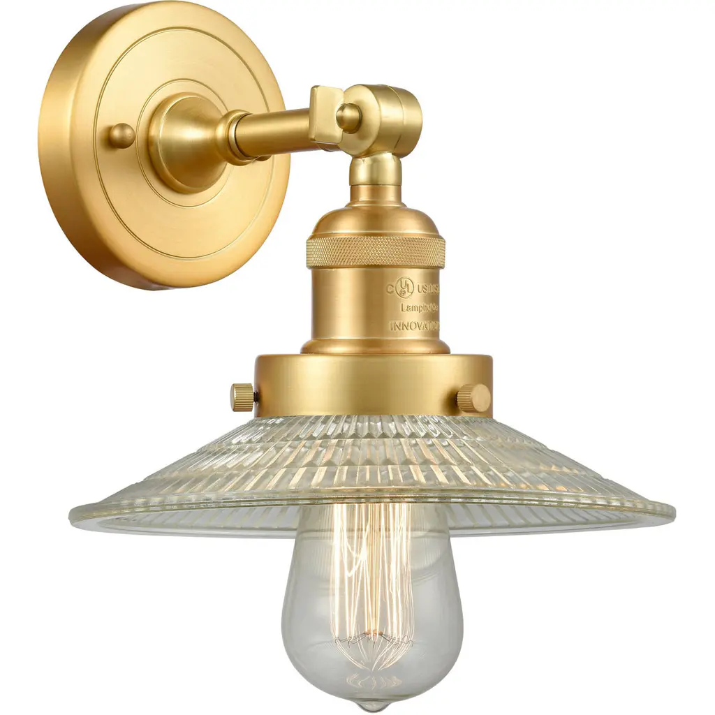 The Halophane 1 Light Sconce is part of the Franklin Restoration Collection. Solid Brass 180 Degree Adjustable Swivel with internal teeth that lock in at 5 degree intervals With Engraved Cast Cup
