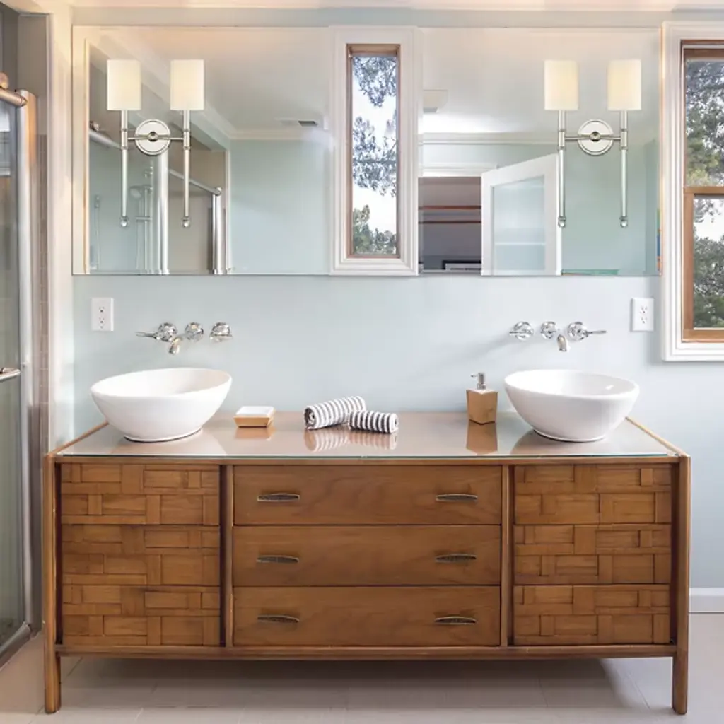 With its sleek, transitional form, the Fremont 2-Light Wall Sconce by Savoy House brings a clean aesthetic to today’s homes and businesses. Its streamlined silhouette features a pair of arms (with a shared circular wallplate) that are divided into a lower glass portion (capped by a rounded glass accent) and an upper metal portion. Both are topped with a Soft White Fabric shade that diffuses light for a warm, even ambiance.