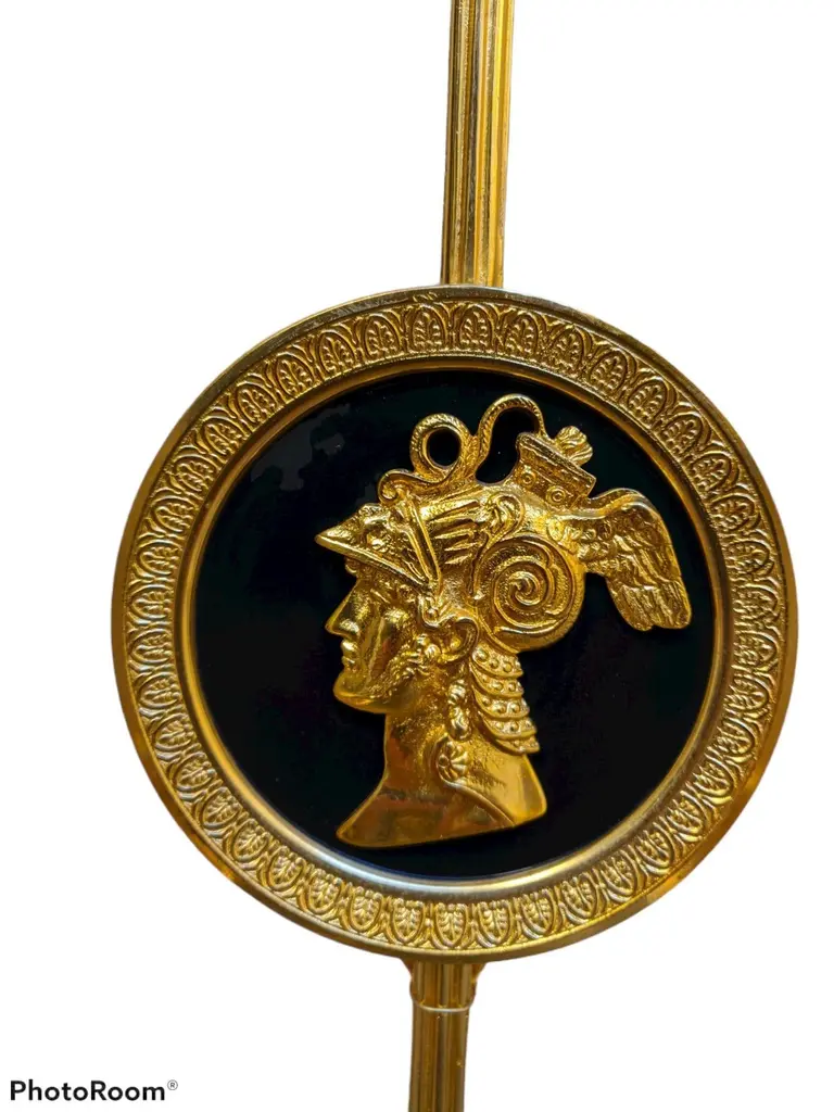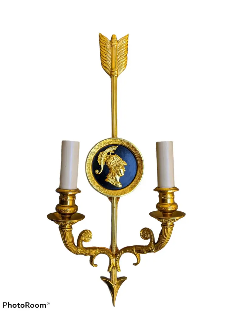 This French Empire style gilt bronze wall sconce by Gherardo Degli Albizzi features the best quality hand-chiselled details.The backplate of this sconce features a lacquered round plate and an arrow crossing from the top to the bottom. On the black paint, there is a gilt bronze hand-chiselled figure of a centurion. Possible right and left side facing each other. In the bottom part, there is the spike of the arrow.