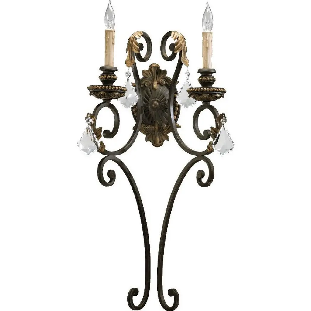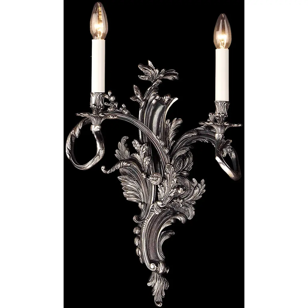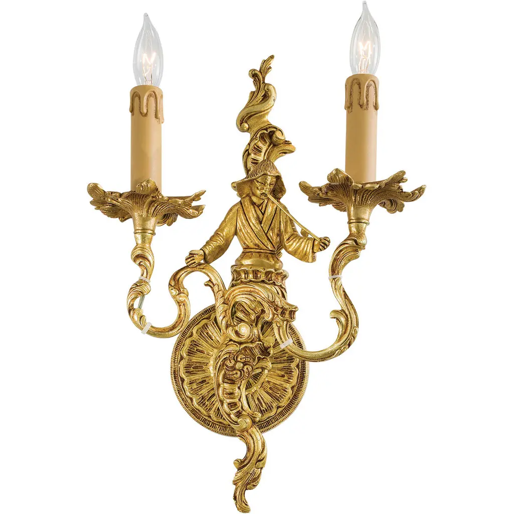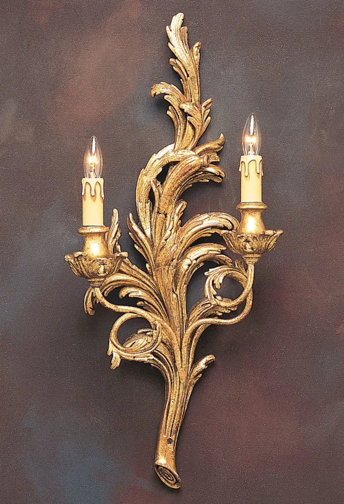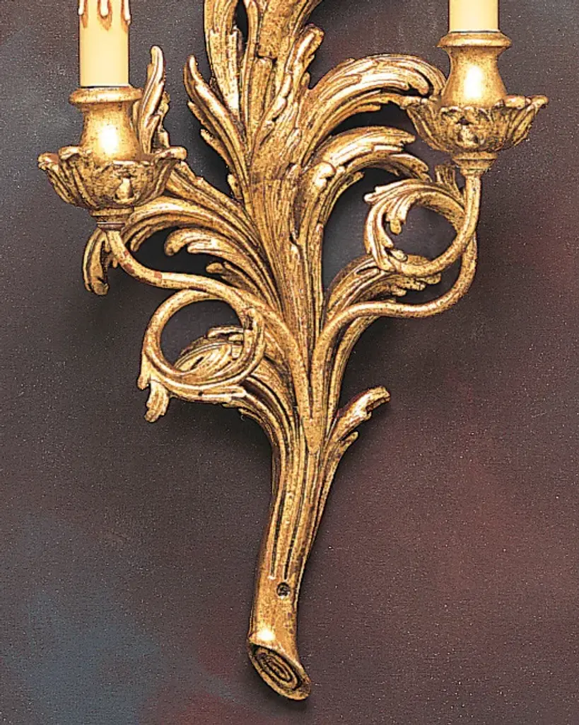 18th-century French style sconce in antiqued gold leaf; 12-1/2" x 25-1/2"H; hand-crafted in Italy; 18th-century French style wall sconce is hand crafted following antique artisan traditions. The most international source of design inspiration nature becomes the focal point for this wall sconce (also known as a wall bracket). This two-light electrified wall sconce is sculpted in leaf motif. The organic and graceful lines of the leaves create a three dimensional quality to the sconce that can be experience from any point in the interior. The distinct shape of uprising serpentine lines of the wall sconce arms are suggestive of natural movement. The sculptural quality of this sconce transcends the viewer from a visual experience to the desire to reach out and touch the graceful forms. The open lighting from the candelabra bulbs reflects upon the sconce emphasizing the various tones in the rich antiqued gold leaf finish. UL approved - dry location; hardwire; 2x 60W max. candelabra bulds; bulbs not included. Handcrafted in Italy.