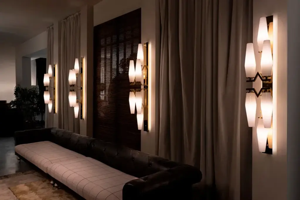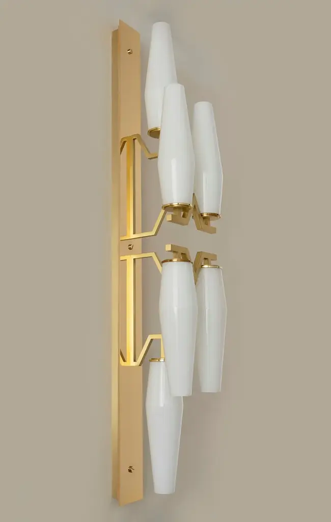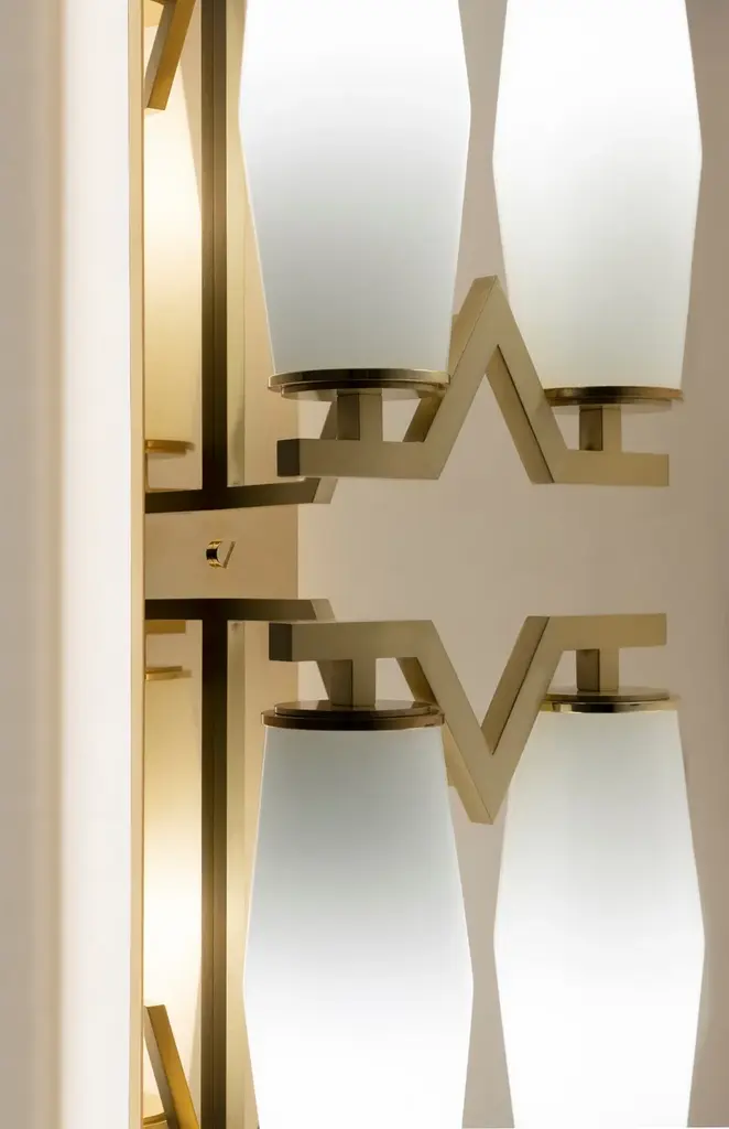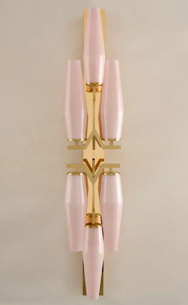 Frida 06 is a 6 lights wall lamp.6 x max. 28W E14 + LED StripFinishes: satin brass & polished brass details / satin nickel & polished nickel details / gunmetal & polished nickel detailsLampshades: clear blown glass / incamiciato white blown glass / incamiciato pink blown glass / incamiciato green blown glass.A collection with a sober and discreet elegance. Devoid of any concessions to decorations, hence capable of resonating both in classic and modern contexts. It combines strength and grace, with coexisting smooth and angular lines, just like Frida Kahlo, to whom it’s dedicated. FRIDA is handcrafted with rigorously blown glass, a feature which grants it with imperfection and beauty.
