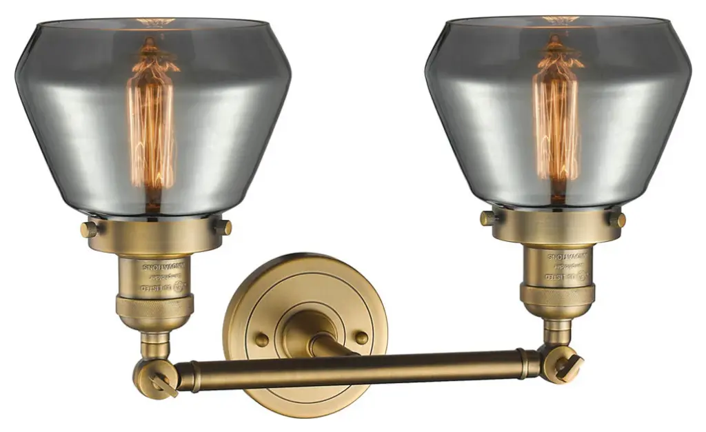 One of our largest and original collections, the Franklin Restoration is made up of a vast selection of heavy metal finishes and a large array of metal and glass shades that bring a touch of industrial into your home.Features:Solid brass 180 degree adjustable swivels with internal teeth that lock in at 5 degree intervalsFixture can be hung with bulbs facing up or down as a wall mount4.5 inch 2mm heavy cast backplateRated for 100 watt maximum per socketUL/CUL Damp RatedCompatible with Incandescent, LED, Fluorescent and Halogen bulbsNumber of Bulbs: 2Bulb Wattage: 100Bulb Type: IncandescentBulb Included: NoVoltage: 120Finish: Antique Copper Finish Shade Finish: Plated Smoke Shade