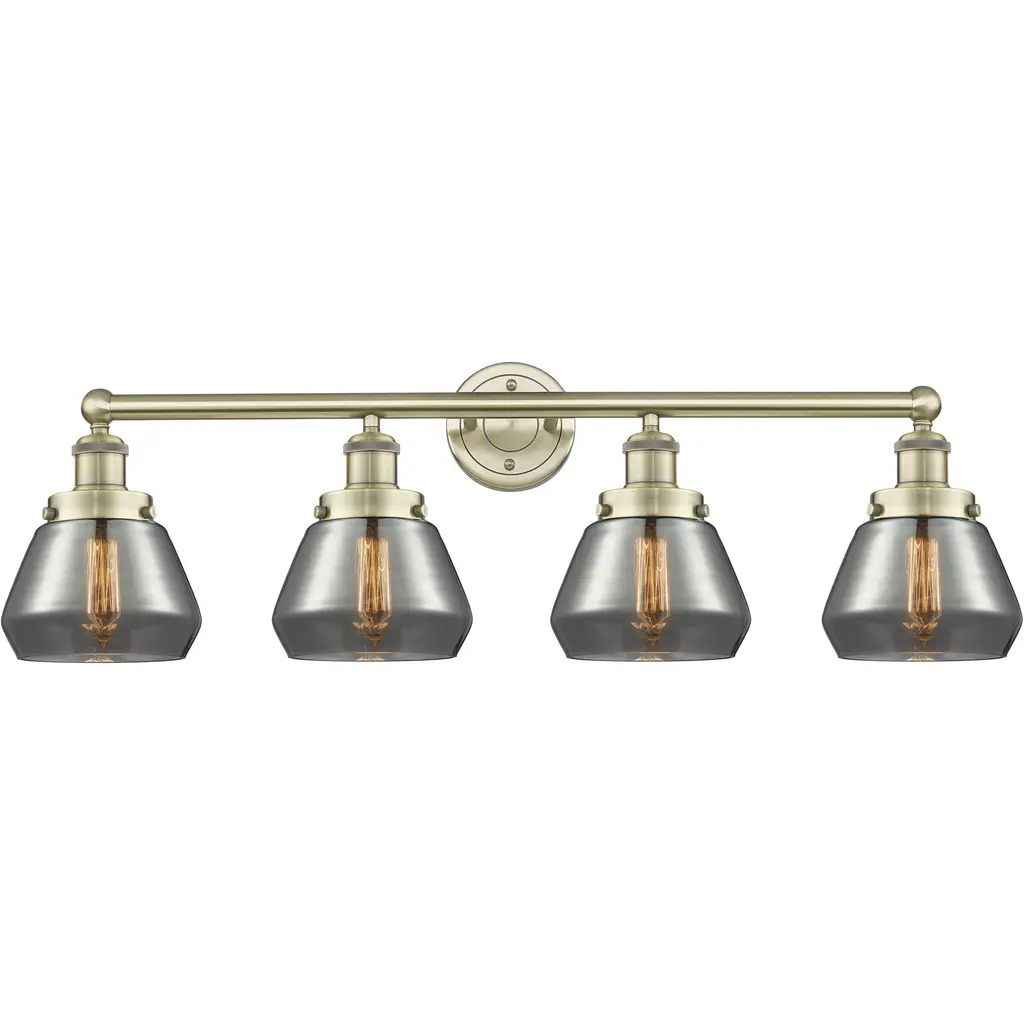 INNOVATIONS 616-4W-BAB-G173 Fulton 4 33.5 inch Bath Vanity Light Black Antique Brass. Style: Art Nouveau, Industrial, Restoration-Vintage, Transitional . Collection Name: Edison. Metal Finish(Body): Black Antique Brass. Metal Finish(Canopy/Backplate): Matte Black. Material: Steel, Cast Brass, Glass. Dimension(in): 10.75(H) x 34(W) x 8(Ext). Bulb: (4)60W Medium Base Incandescent(Not Included). Voltage: 120. Dimmable: Yes. Color Temperature (Kelvin): 2200. Color Rendering Index (CRI): 99.9. Lumens: 220. Life Expectancy (Hours): 2000. Glass Shade Description: Plated Smoke Fulton. Glass Type: Colorful; Ribbed. Shade Shape: Bowl. Glass or Metal Shade Color: Plated Smoke. Shade Material: Glass. Shade Dimension(in): 7(W) x 5.5(H). Fitter Measurement (Glass Or Metal Shade Fitter Size): 3.25 inch Fitter. Backplate Dimension(in): 4.5(W) x 0.75(Depth). ADA Compliant: No. California Proposition 65 Warning Required: Yes. UL/ETL Certification Type: Damp Location.