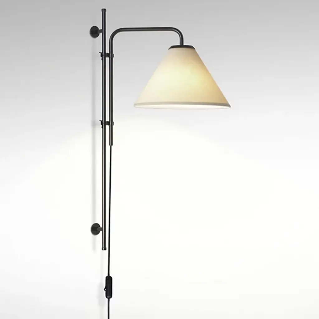 A purist form with a timeless aesthetic. The Funiculi A Fabric Wall Lamp designed by Lluis Porqueras for Marset complements both traditional and contemporary spaces. While Porqueras stays true to his original 1979 design, the addition of a tapered Fabric lamp shade softens the wall lamp’s sleek, functional form and directs the warm white LED light outwards and downwards. Made of lacquered Iron, 2 clamps on the rod allow a height adjustment of up to 10 inches for optimal lighting. An easy to reach on/off switch on the cable makes for practical bedside lighting. Equip this wall lamp with an E12 LED bulb and it becomes a sophisticated reading lamp in a library or sitting room.
