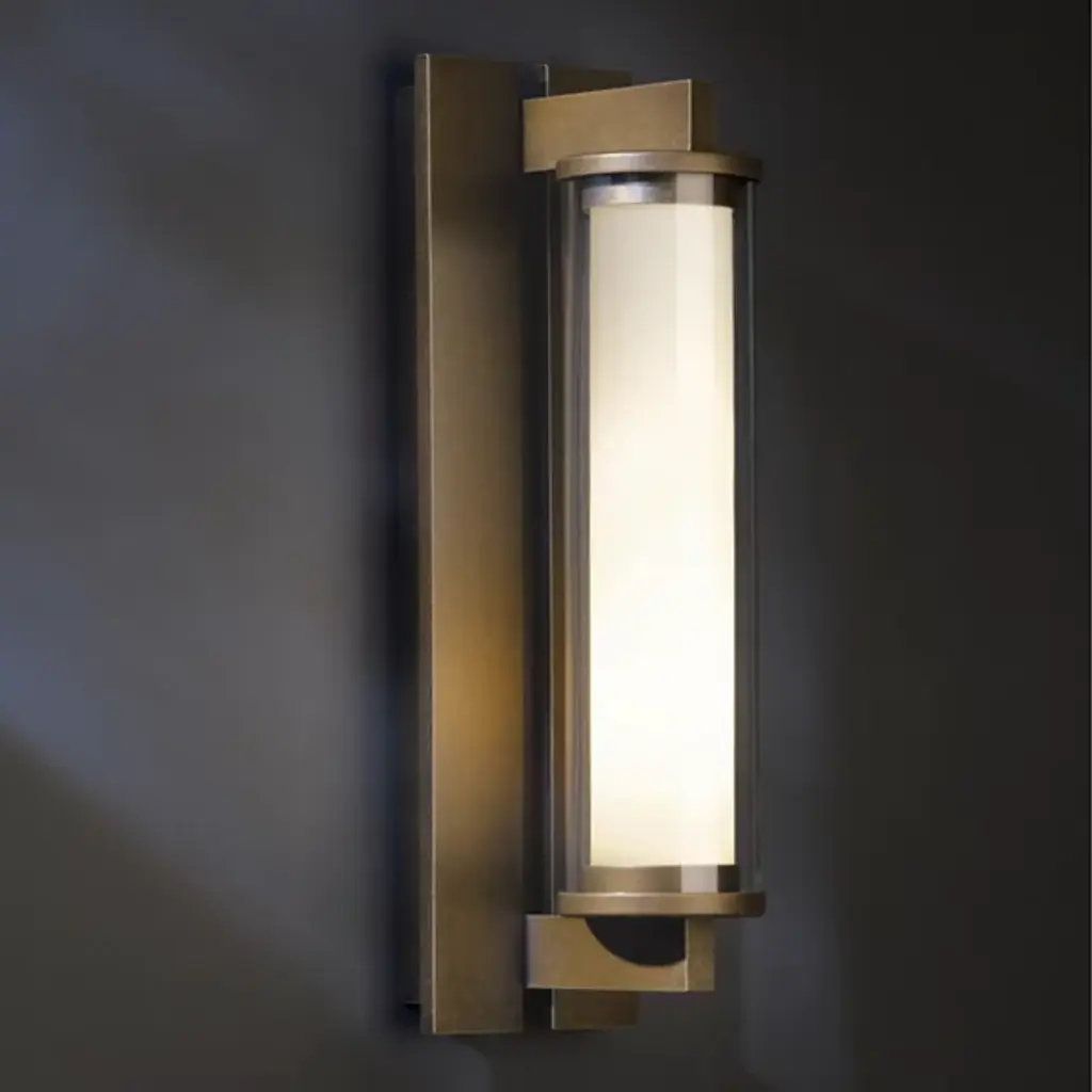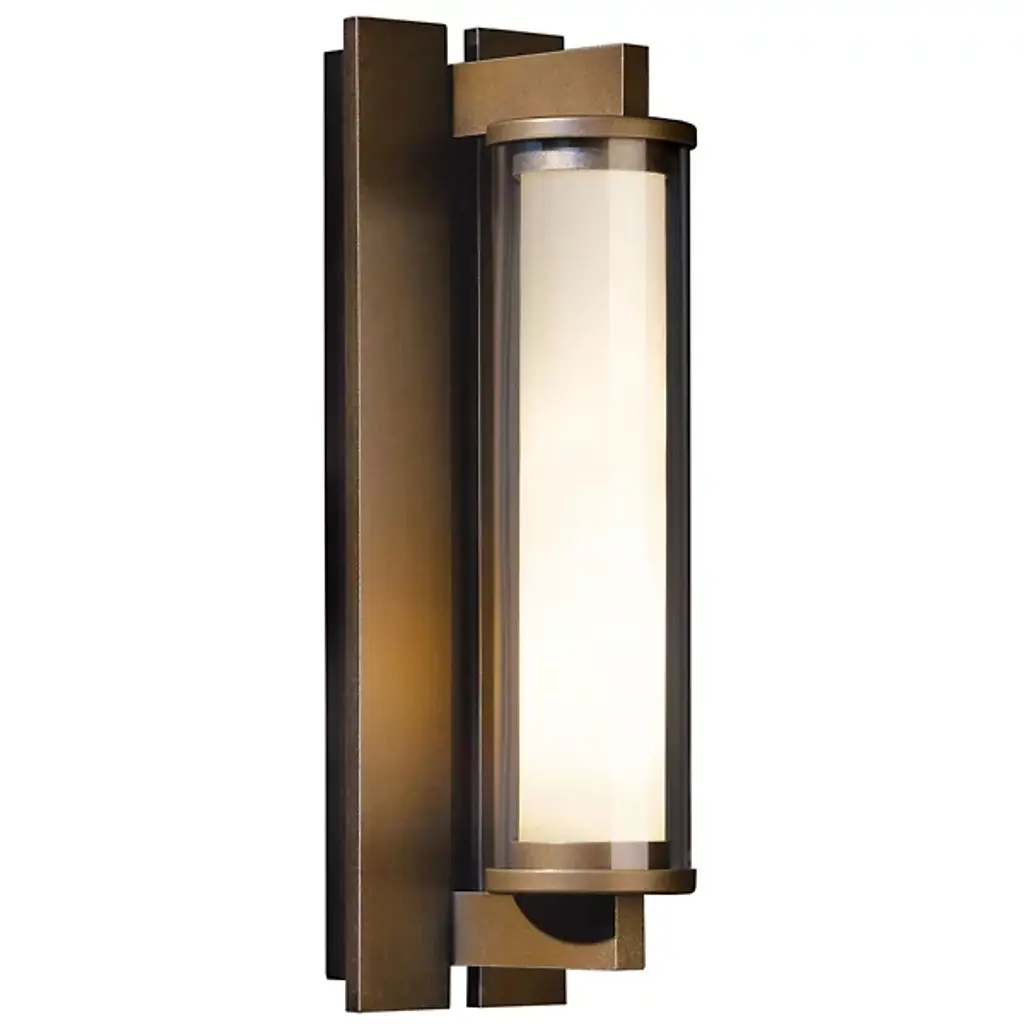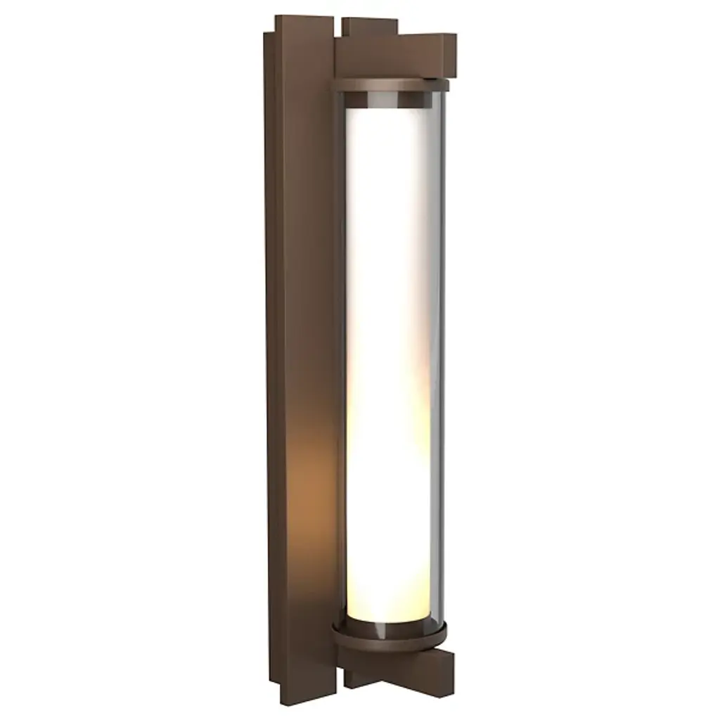 Refined, elegant, and simple without being boring. The Fuse Outdoor Wall Sconce from Hubbardton Forge uses shape and line to create a sophisticated modern piece. In a frontal view, the lampshade and enclosure appear embedded in the rectangular mount, in a side view, one sees the dimensionality of the piece, with identical rectangular segments holding up the lampshade. The opaque lamp shade is enclosed with clear glass adding a modest, reflective quality while producing an ambient glow. Either along your backyard patio or framing your front door, the piece provides gentle, sophisticated lighting.