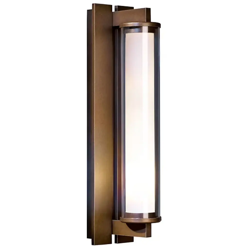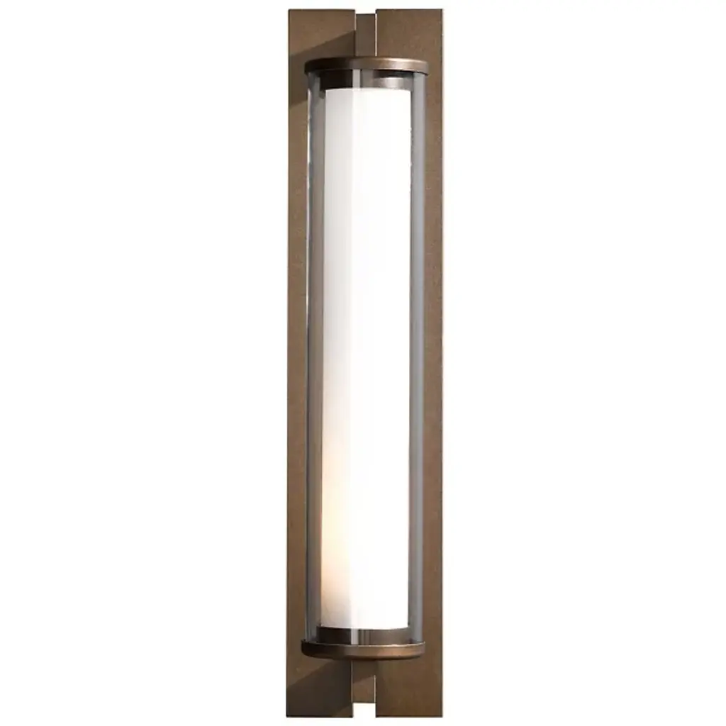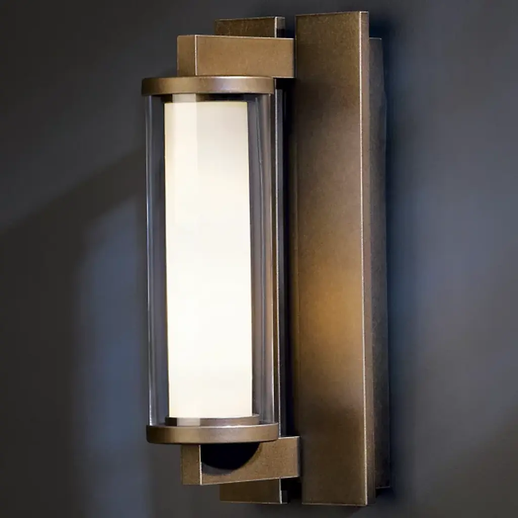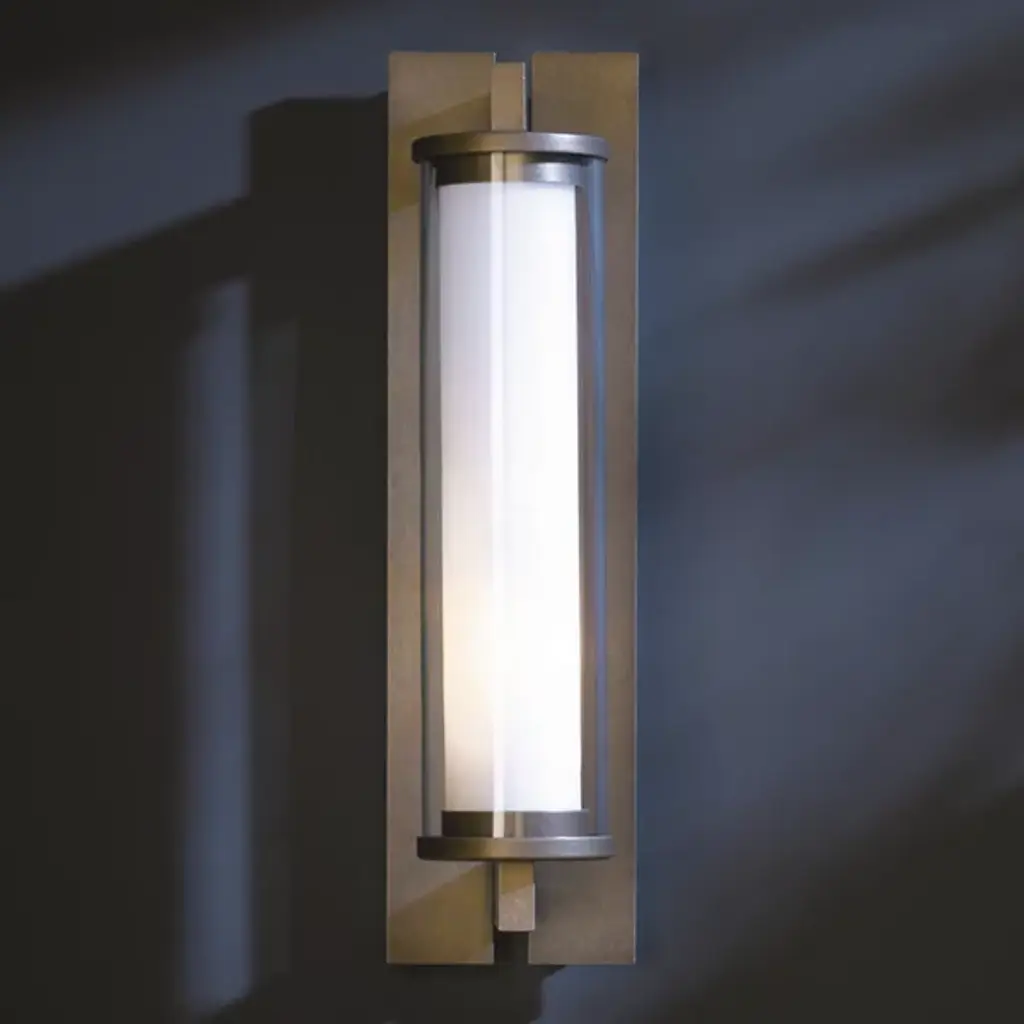 Refined, elegant, and simple without being boring. The Fuse Outdoor Wall Sconce from Hubbardton Forge uses shape and line to create a sophisticated modern piece. In a frontal view, the lampshade and enclosure appear embedded in the rectangular mount, in a side view, one sees the dimensionality of the piece, with identical rectangular segments holding up the lampshade. The opaque lamp shade is enclosed with clear glass adding a modest, reflective quality while producing an ambient glow. Either along your backyard patio or framing your front door, the piece provides gentle, sophisticated lighting.