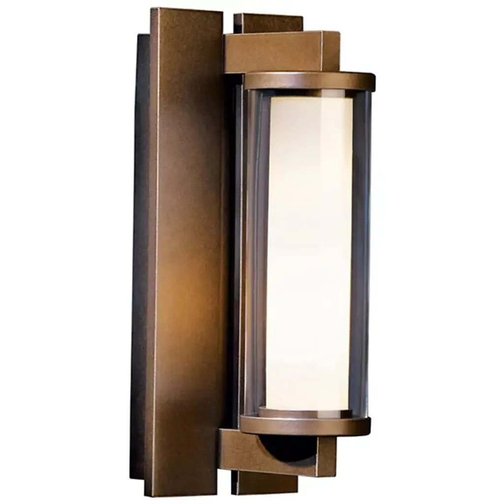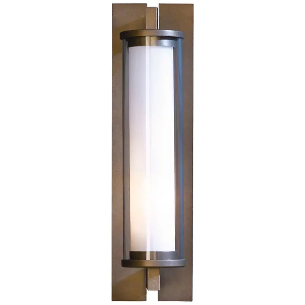 Refined, elegant, and simple without being boring. The Fuse Outdoor Wall Sconce from Hubbardton Forge uses shape and line to create a sophisticated modern piece. In a frontal view, the lampshade and enclosure appear embedded in the rectangular mount, in a side view, one sees the dimensionality of the piece, with identical rectangular segments holding up the lampshade. The opaque lamp shade is enclosed with clear glass adding a modest, reflective quality while producing an ambient glow. Either along your backyard patio or framing your front door, the piece provides gentle, sophisticated lighting.