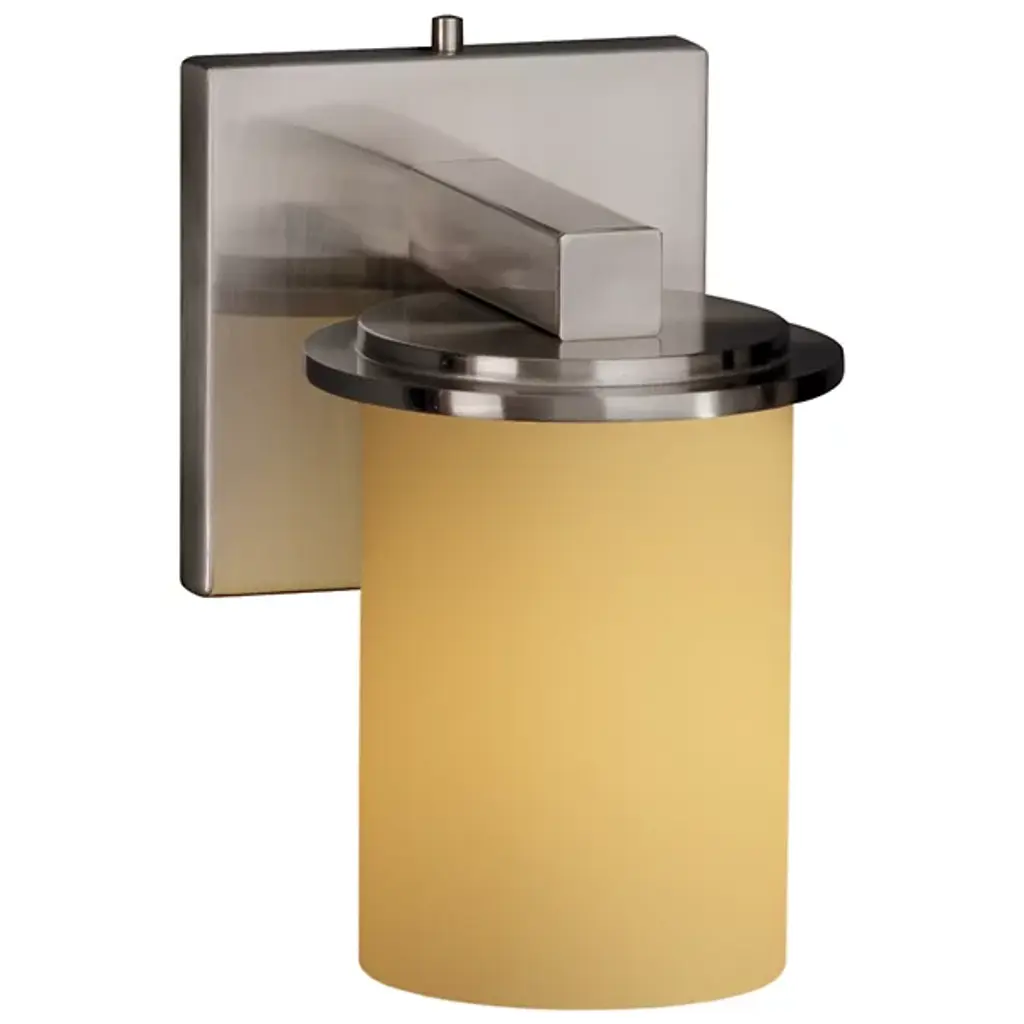 As its name would imply, the Fusion Dakota Wall Sconce by Justice Design Group is a creative union of artisan glass and polished metal into one stunning design. Its glass body has a classic cylindrical shape that stands on a stepped, metal-finished base which then connects to a square wall plate. Whether installed as an uplight or downlight, the fixture’s open top (or bottom) allows light to have a direct, undiffused spill in addition to a refractive glow from the surrounding shade.
