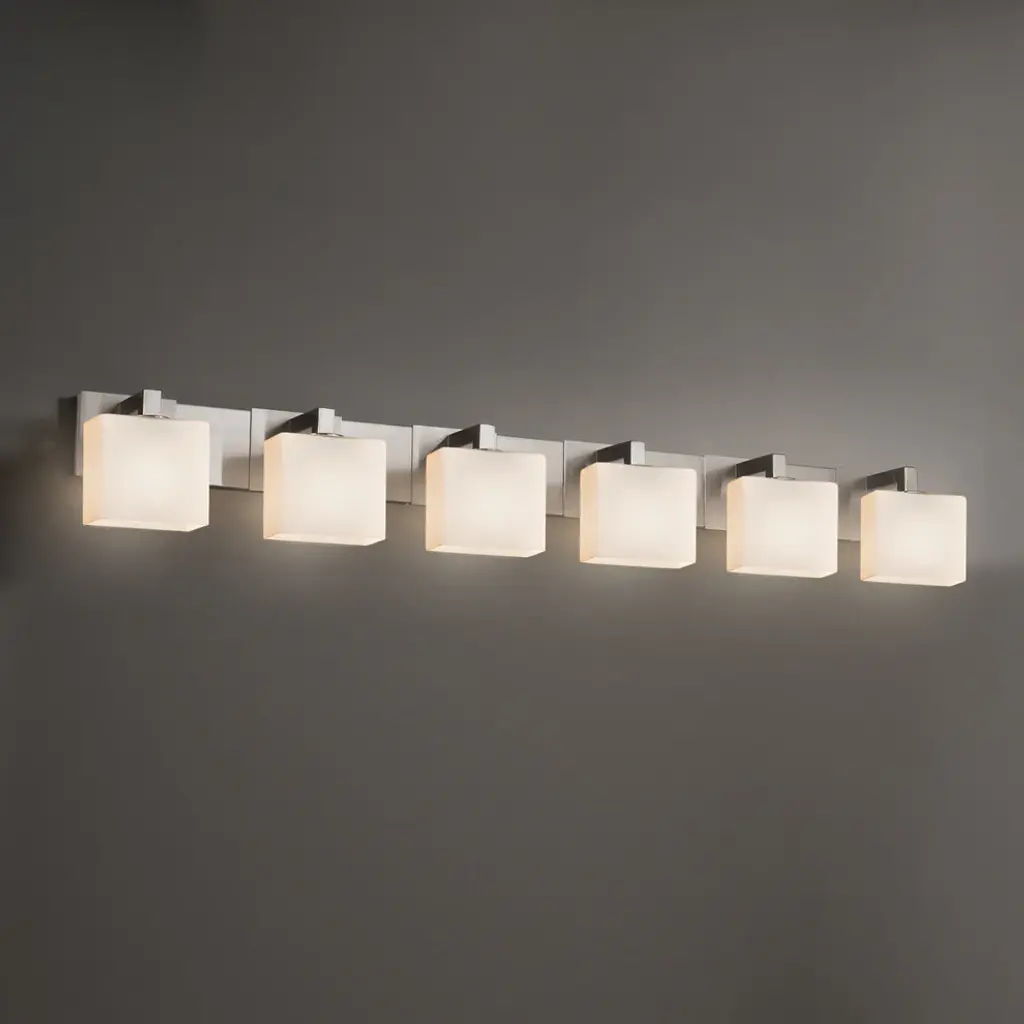 Fusion - Modular 6-Light Bath Bar - Rectangle - Brushed Nickel Finish - Opal Shade - LEDThe Fusion Collection offers a wide selection of handcrafted artisan glass shades. These beautiful artisan glass finishes complement the clean designs of the Justice Design fixtures.Features:This fixture can be installed as an uplight or downlightDimming is compatible with Incandescent/Triac or ELV dimmersLocation Rating: DampUL CertifiedSpecifications:Wattage: 9Bulb Type: LEDVoltage: 120Lumens: 4200CRI: 80Bulb Included: YesBulb Count: 6