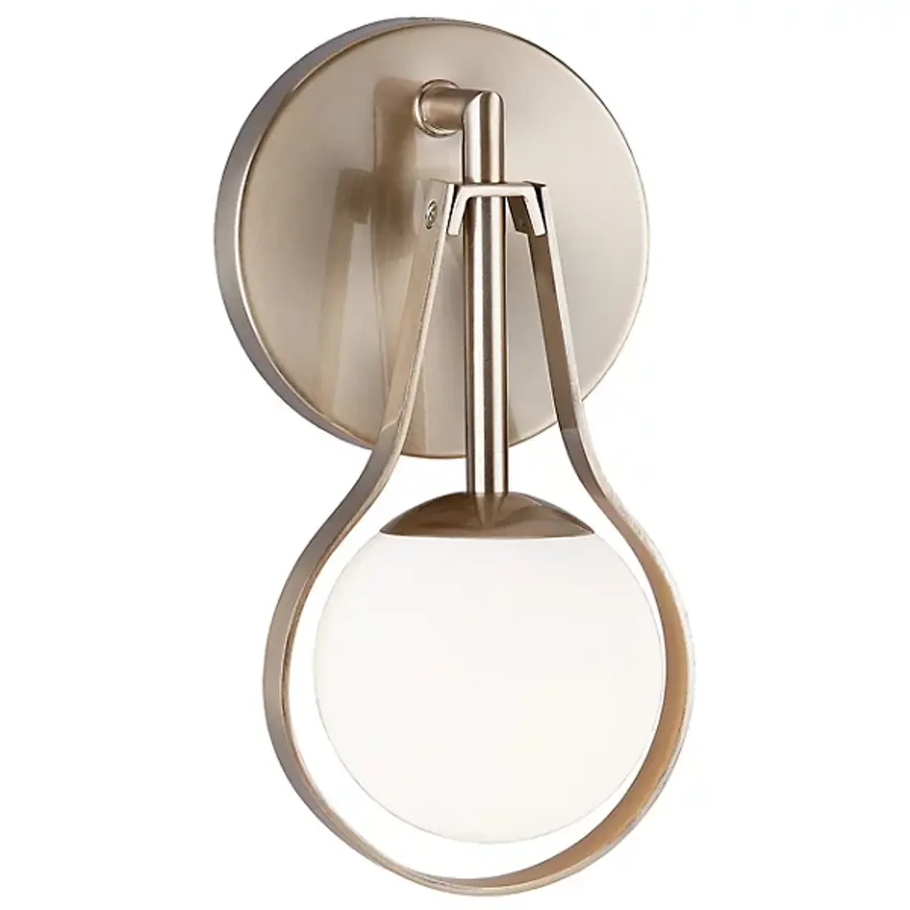 An intriguing design with modern appeal. The Fusion Pearl Wall Sconce features a Metal frame that outlines the light source, resulting in a contemporary lighting addition that will add visual interest to any setting. Complete with an Artisan Glass shade that diffuses the light in a soft, glowing manner, this wall fixture is sure to be a hit with modern decorators. A round backplate grounds the look and lets the rest of the design truly shine. This piece is perfect for flanking wall decor or other home features, and can also be used as accent lighting in the living room, bedroom and more.