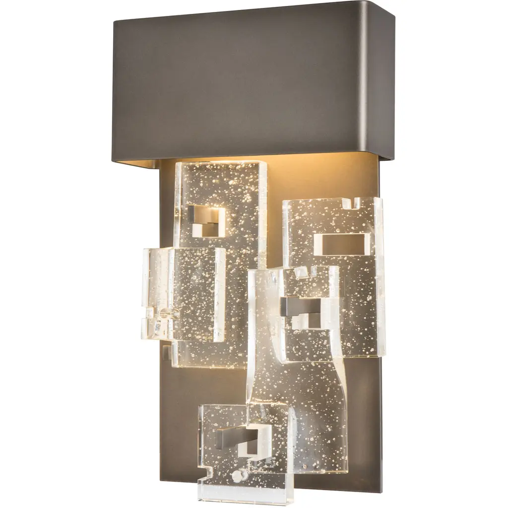 Add a touch of luxury to any room with the Fusion Small LED Sconce, part of ART + ALCHEMY by Hubbardton Forge. It offers elegant and functional wall lighting at a versatile height of 16.4". Staggered layers of thick, clear, seeded, fused glass are displayed in a geometric pattern, on the fixture's aluminum backplate.