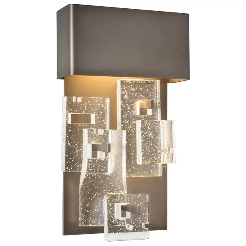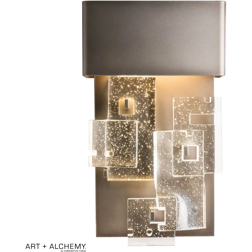 Fusion Large LED Sconce, a member of ART + ALCHEMY by Hubbardton Forge, is both elegant and functional, at over 25" in height. The staggered layers of clear, seeded, fused glass are displayed in a geometric pattern, set off by the lighting fixture's aluminum backplate. LED lighting is both economic and environmentally friendly, making for a stunning addition to any space.