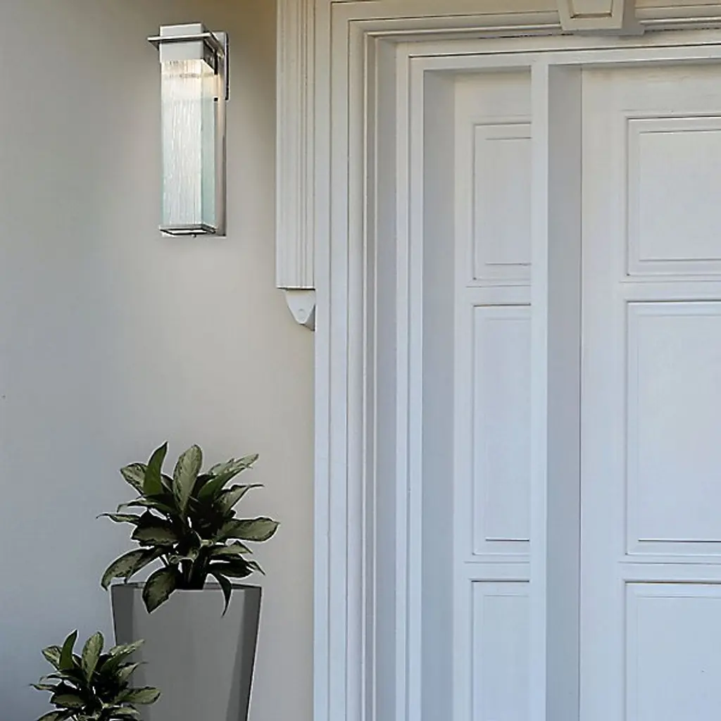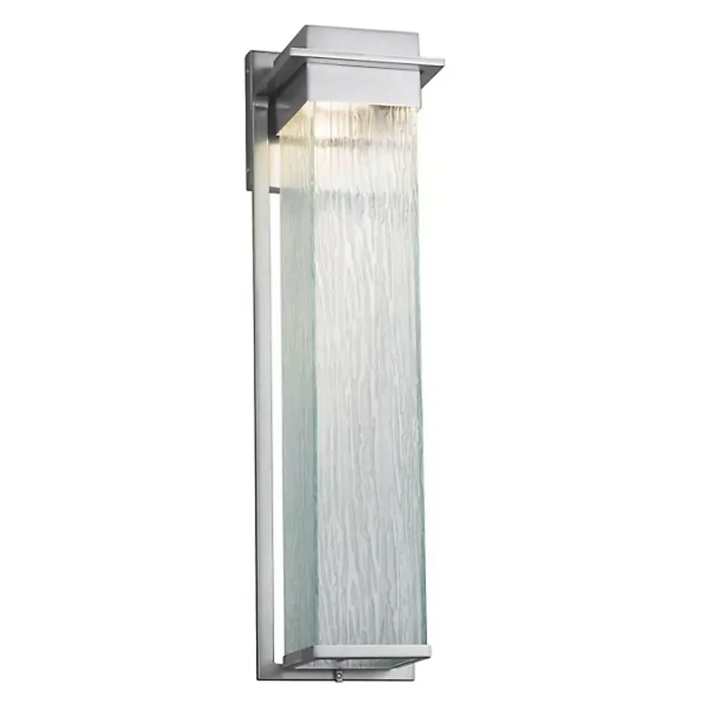 A striking and unique example of contemporary design. The Fusion Pacific LED Outdoor Wall Sconce by Justice Design is a tall and impressive piece that combines the finest grade materials into an exterior fixture that will help to define your aesthetic. Most notable in this composition is its tall square Glass shade, which has been made by the hand of a skilled artisan. To bring out the natural beauty of its Glass elements, this fixture is framed in rugged Metal that is accented with a square rod piece and matching backplate. Perfect for flanking a front door or placed in the corner of a dark patio.