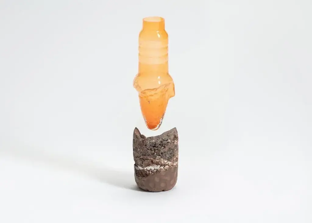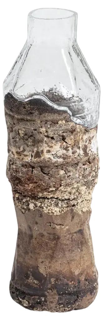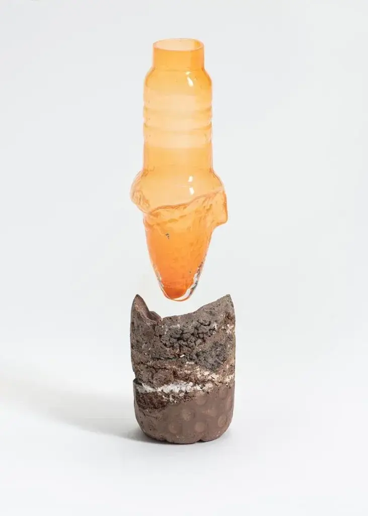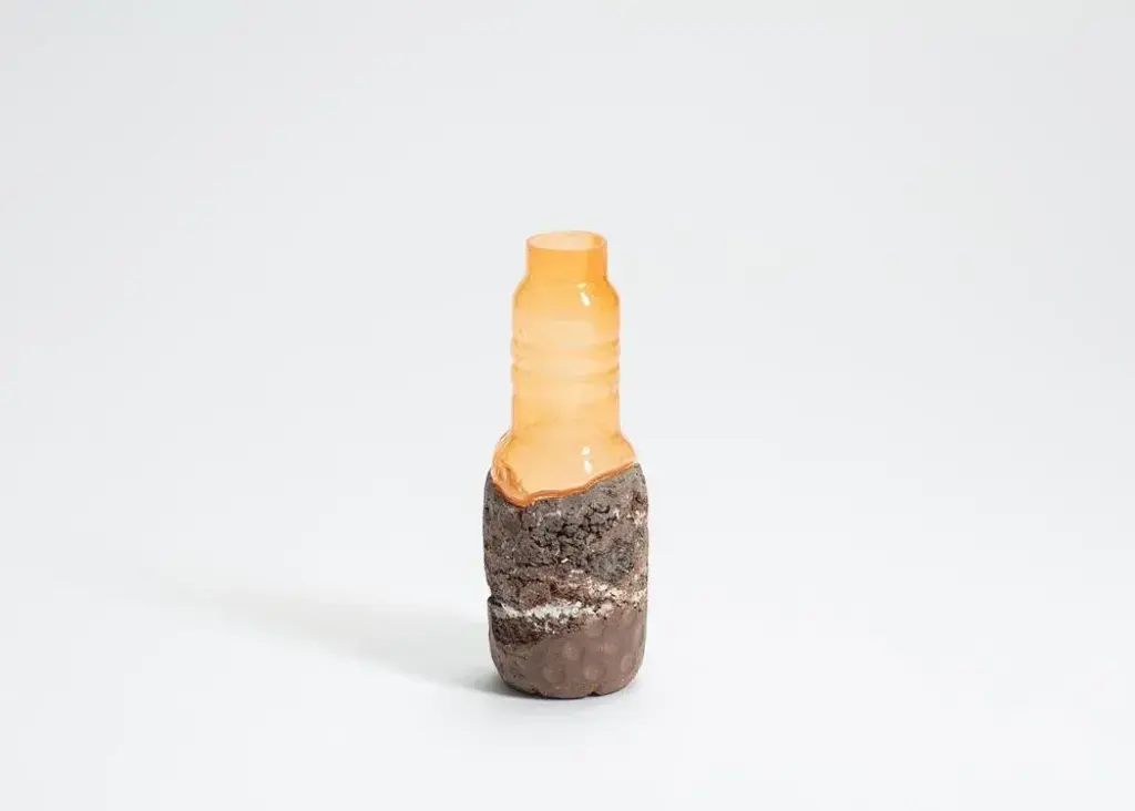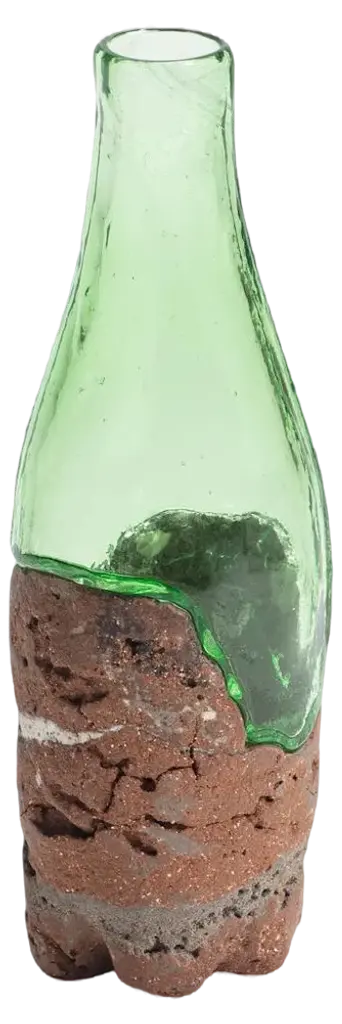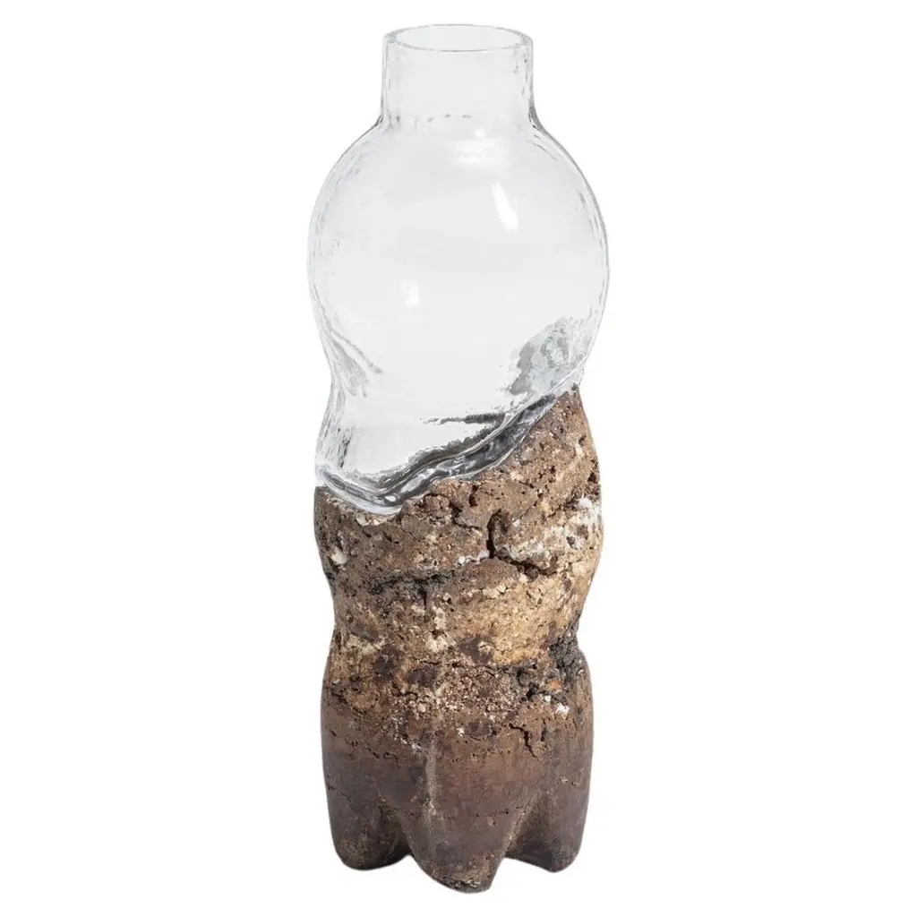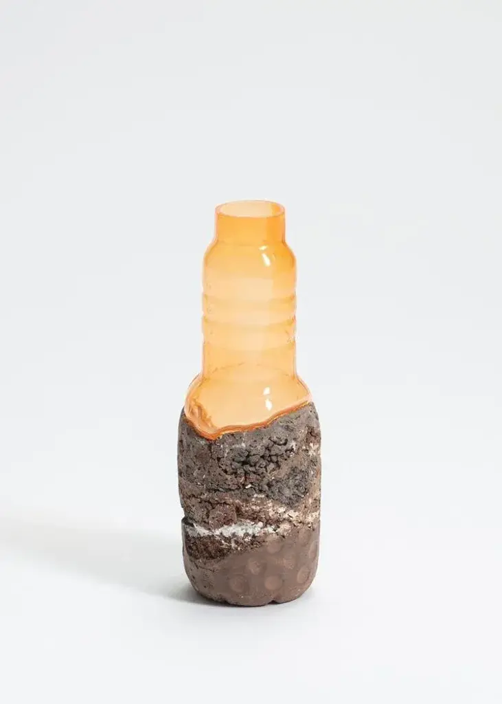 Fuwa fuwa, no 12 bottle by yusuke´ y. Offhause one of a kind, the work is in two parts (ceramic and glass). Dimensions: d 8.8 x w 8.8 x h 23 cm. Materials: stoneware, porcelain, glass. Yusuke´ y. Offhause: "my work often deals with a reformulation of trivial objects from everyday life, which i give, by a series of operations, transformations, and disconcerting appearances. It is based on pre-existing forms, such as plastic bottle and packaging for snacks, salads, cakes etc., found in supermarkets. These forms with such singular structures designed to be rigid with minimal plastic have inspired me to use them to generate new objects by changing the material that constitutes them. Instead of transparent plastic, i introduce a heterogeneous material, granular, composite, reminiscent of oxidized iron or archaeological remains underwater. The plastic shell is taken as a mold in which i blend material that i prepared by mixing various clays crushed to different degrees. Two firings and a glaze which solidifies completes the object. I replace the transparent plastic with noble materials, ceramic and glass. The ceramic element evokes an archeological piece and the glass element sketches the missing piece as a fantom object of the consumption of our times. Plastic has become for me an important subject of research because it symbolises the speed of our current society. This takes on the strange appearance of an object difficult to date, archaic and futuristic at the same time. This ambiguity of temporality, the false archaeological appearance interests me with its universal and contemporary resonance."