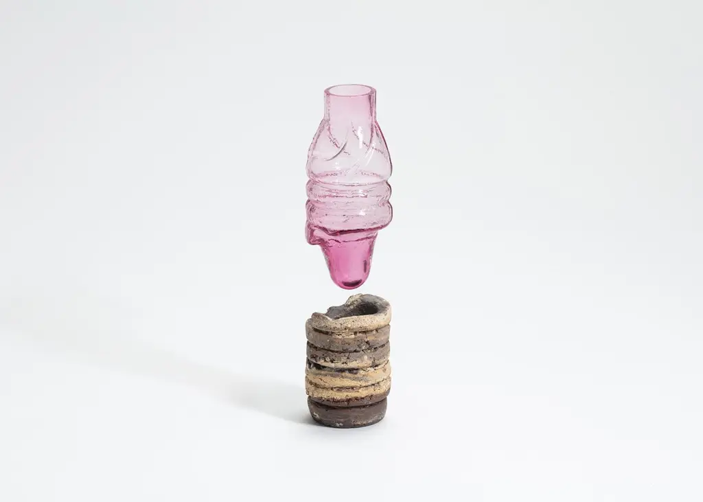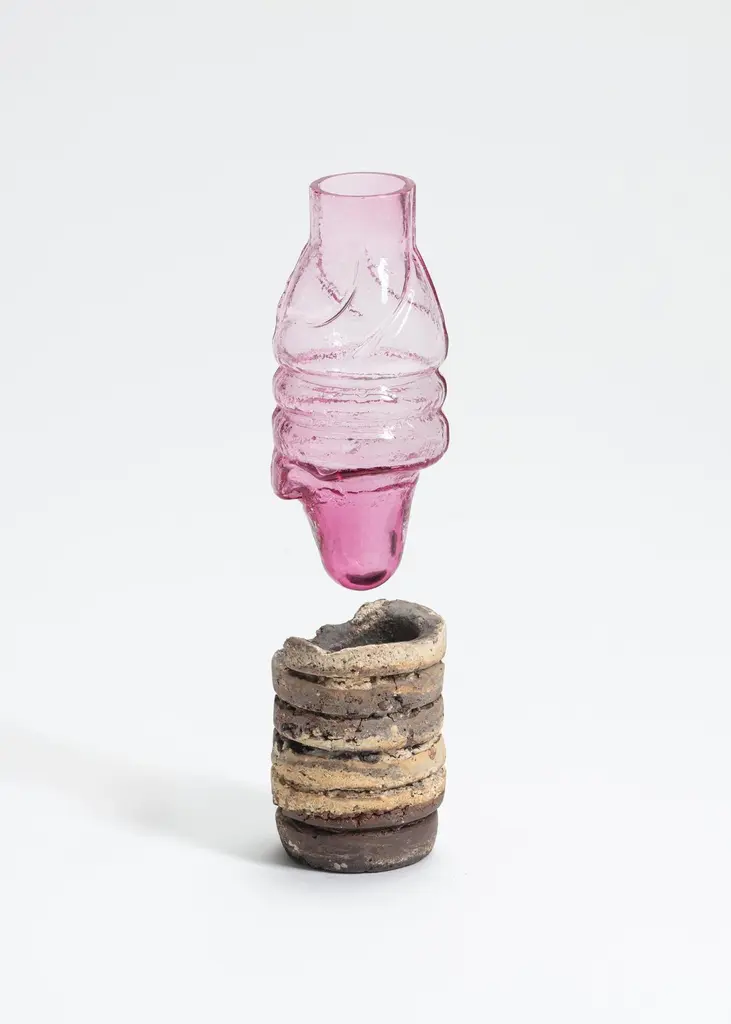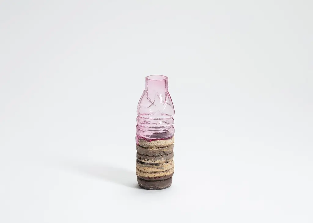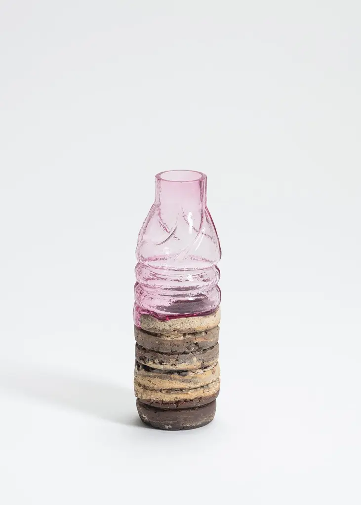 FUWA FUWA, No 13 bottle by Yusuke´ Y. OffhauseOne of a Kind, the work is in two parts (ceramic and glass).Dimensions: D 7.5 x W 7.5 x H 19.5 cm.Materials: stoneware, porcelain, glass.Yusuke´ Y. Offhause:"My work often deals with a reformulation of trivial objects from everyday life, which I give, by a series of operations, transformations, and disconcerting appearances. It is based on pre-existing forms, such as plastic bottle and packaging for snacks, salads, cakes etc., found in supermarkets. These forms with such singular structures designed to be rigid with minimal plastic have inspired me to use them to generate new objects by changing the material that constitutes them. Instead of transparent plastic, I introduce a heterogeneous material, granular, composite, reminiscent of oxidized iron or archaeological remains underwater. The plastic shell is taken as a mold in which I blend material that I prepared by mixing various clays crushed to differentdegrees. Two firings and a glaze which solidifies completes the object.I replace the transparent plastic with noble materials, ceramic and glass. The ceramic element evokes an archeological piece and the glass element sketches the missing piece as a fantom object of the consumption of our times. Plastic has become for me an important subject of research because it symbolises the speed of our current society. This takes on the strange appearance of an object difficult to date, archaic and futuristic at the same time. This ambiguity of temporality, the false archaeological appearance interests me with its universal and contemporary resonance."