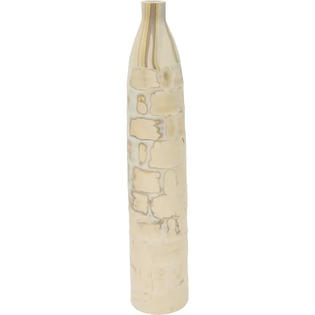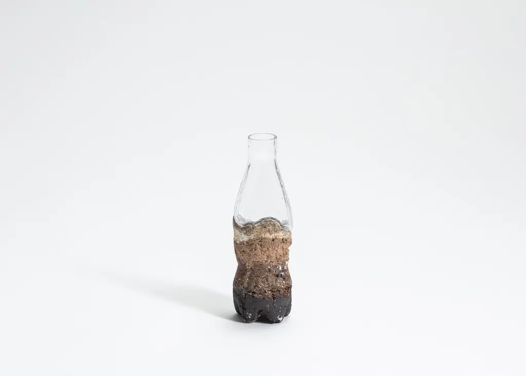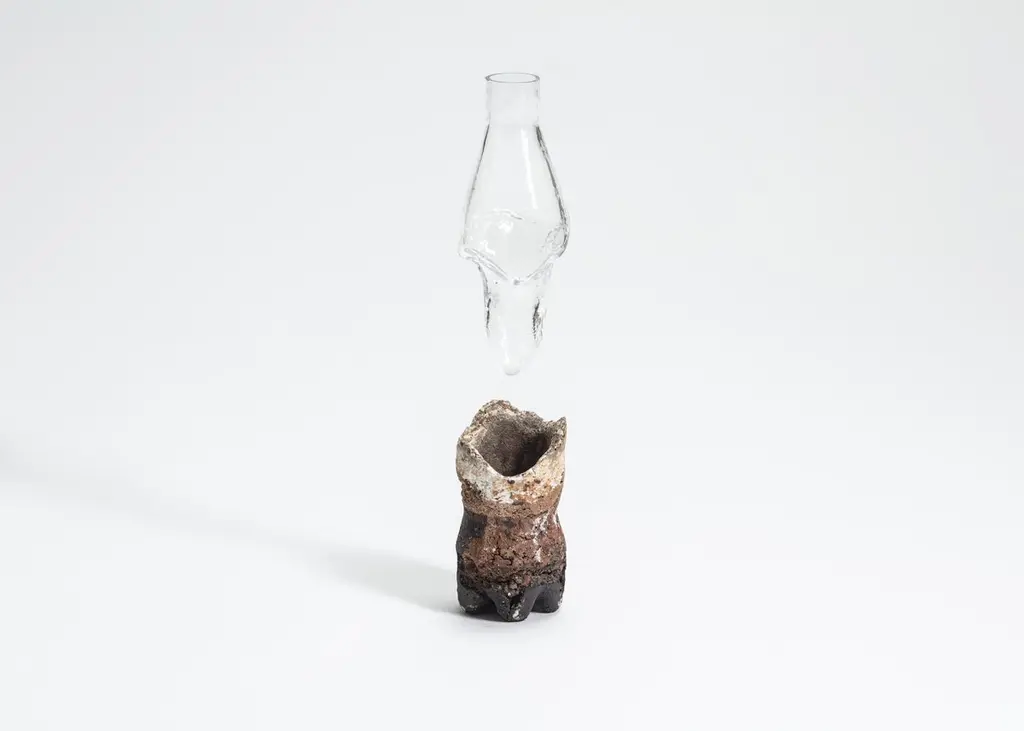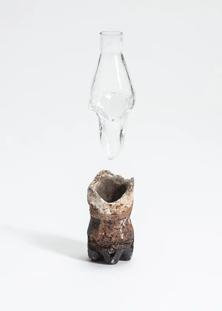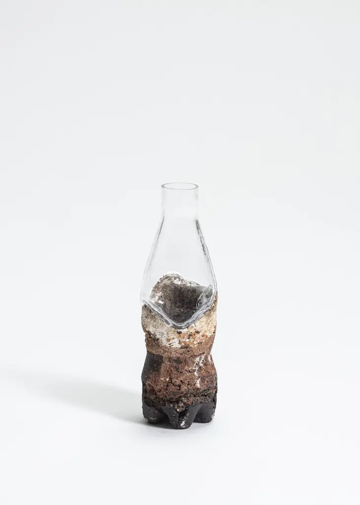 FUWA FUWA, No 2 bottle by Yusuke´ Y. OffhauseOne of a Kind, the work is in two parts (ceramic and glass).Dimensions: D 6.5 x W 6.5 x H 21 cm.Materials: stoneware, porcelain, glass.Yusuke´ Y. Offhause:"My work often deals with a reformulation of trivial objects from everyday life, which I give, by a series of operations, transformations, and disconcerting appearances. It is based on pre-existing forms, such as plastic bottle and packaging for snacks, salads, cakes etc., found in supermarkets. These forms with such singular structures designed to be rigid with minimal plastic have inspired me to use them to generate new objects by changing the material that constitutes them. Instead of transparent plastic, I introduce a heterogeneous material, granular, composite, reminiscent of oxidized iron or archaeological remains underwater. The plastic shell is taken as a mold in which I blend material that I prepared by mixing various clays crushed to differentdegrees. Two firings and a glaze which solidifies completes the object.I replace the transparent plastic with noble materials, ceramic and glass. The ceramic element evokes an archeological piece and the glass element sketches the missing piece as a fantom object of the consumption of our times. Plastic has become for me an important subject of research because it symbolises the speed of our current society. This takes on the strange appearance of an object difficult to date, archaic and futuristic at the same time. This ambiguity of temporality, the false archaeological appearance interests me with its universal and contemporary resonance.".