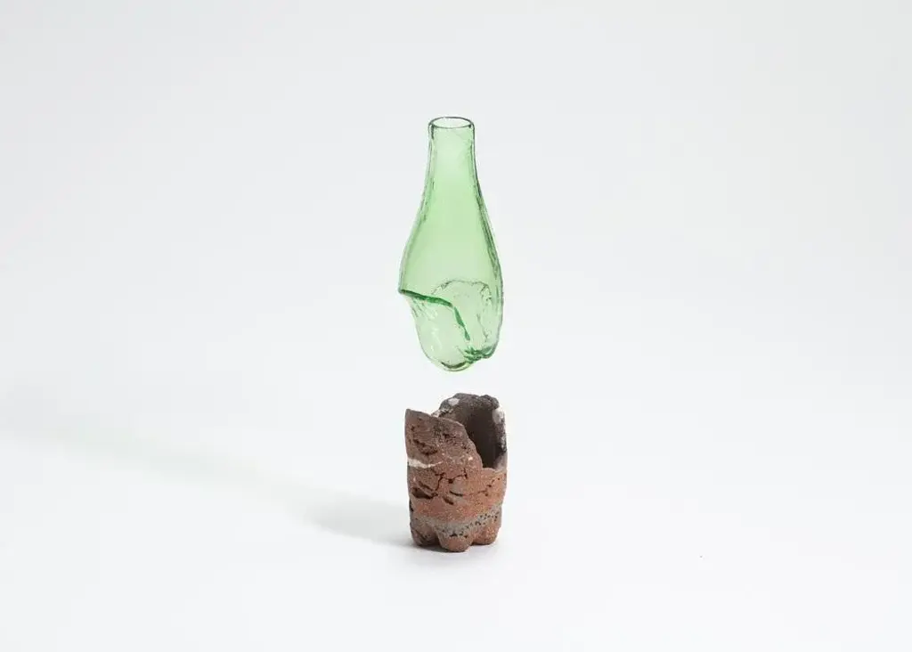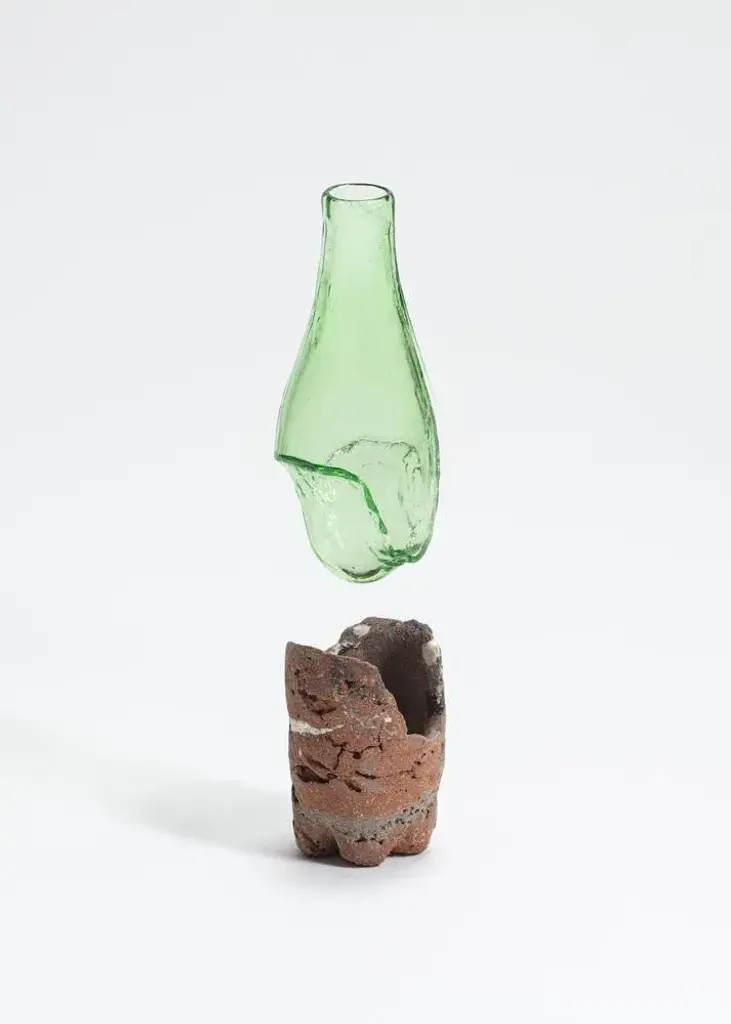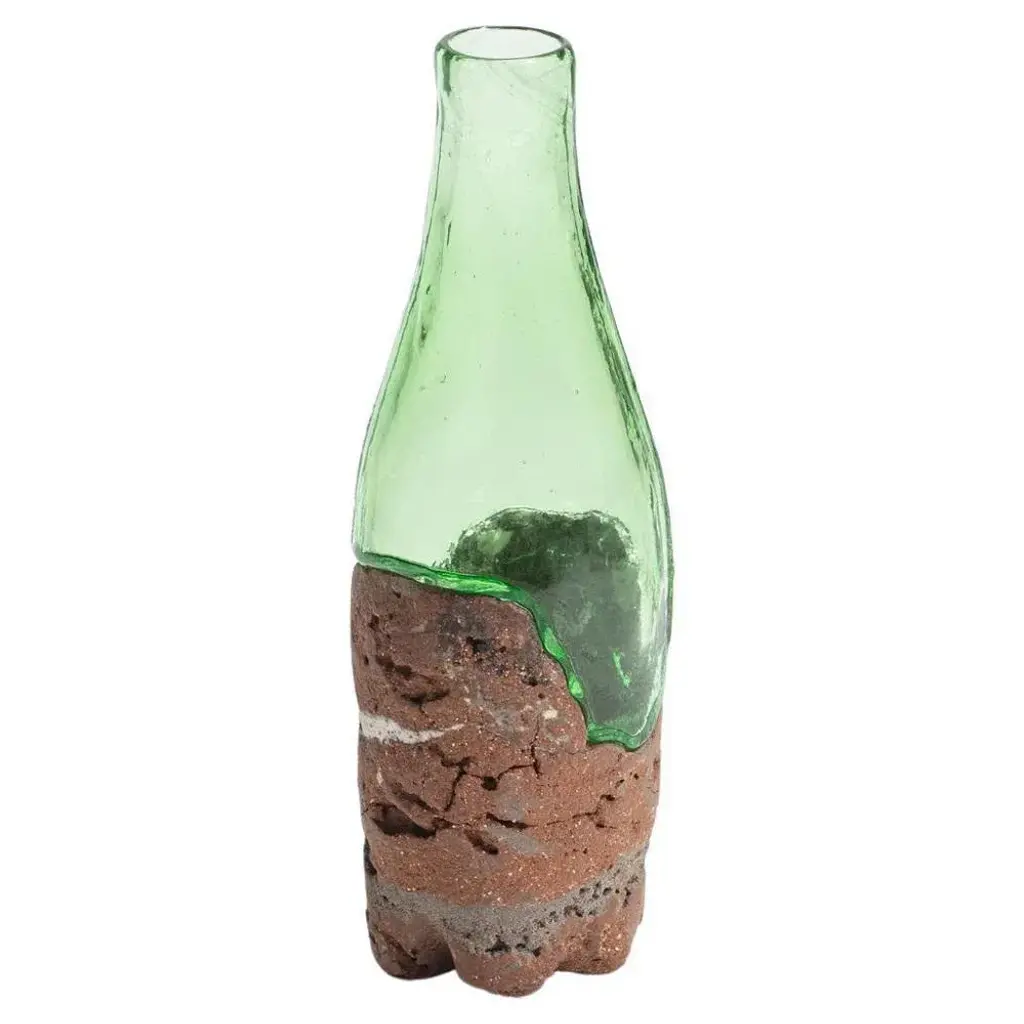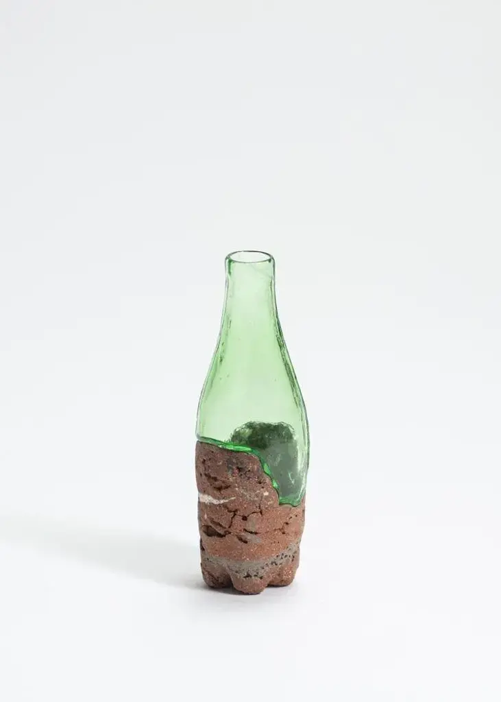 Fuwa fuwa, no 3 bottle by yusuke´ y. Offhause one of a kind, the work is in two parts (ceramic and glass). Dimensions: d 6.5 x w 6.5 x h 20 cm. Materials: stoneware, porcelain, glass. Yusuke´ y. Offhause: "my work often deals with a reformulation of trivial objects from everyday life, which i give, by a series of operations, transformations, and disconcerting appearances. It is based on pre-existing forms, such as plastic bottle and packaging for snacks, salads, cakes etc., found in supermarkets. These forms with such singular structures designed to be rigid with minimal plastic have inspired me to use them to generate new objects by changing the material that constitutes them. Instead of transparent plastic, i introduce a heterogeneous material, granular, composite, reminiscent of oxidized iron or archaeological remains underwater. The plastic shell is taken as a mold in which i blend material that i prepared by mixing various clays crushed to different degrees. Two firings and a glaze which solidifies completes the object. I replace the transparent plastic with noble materials, ceramic and glass. The ceramic element evokes an archeological piece and the glass element sketches the missing piece as a fantom object of the consumption of our times. Plastic has become for me an important subject of research because it symbolises the speed of our current society. This takes on the strange appearance of an object difficult to date, archaic and futuristic at the same time. This ambiguity of temporality, the false archaeological appearance interests me with its universal and contemporary resonance."