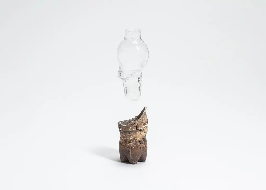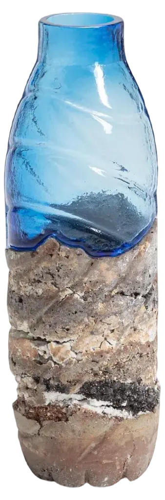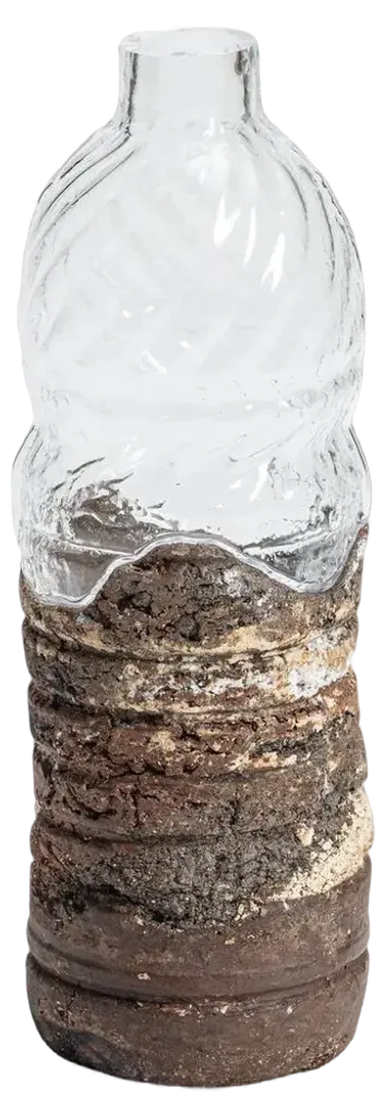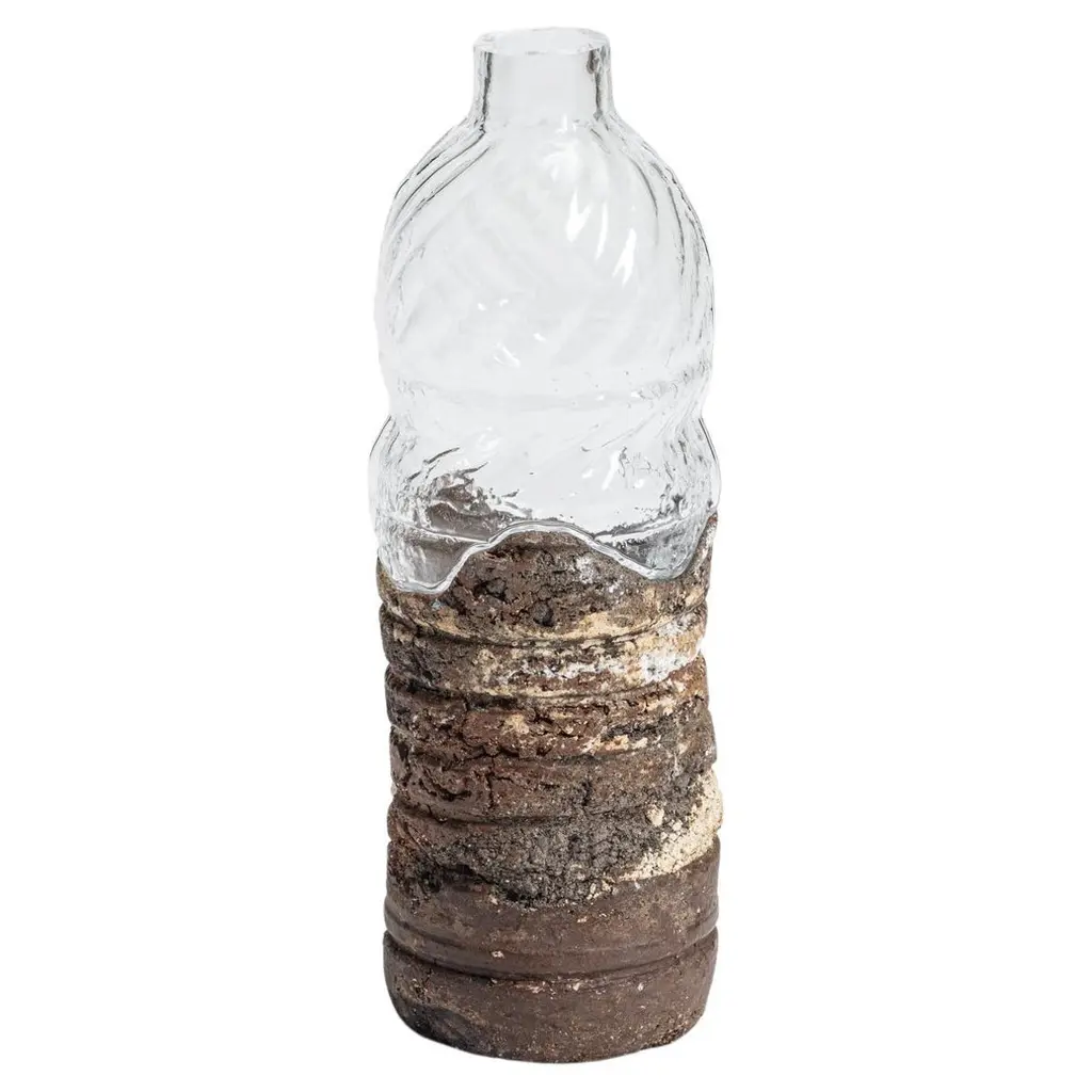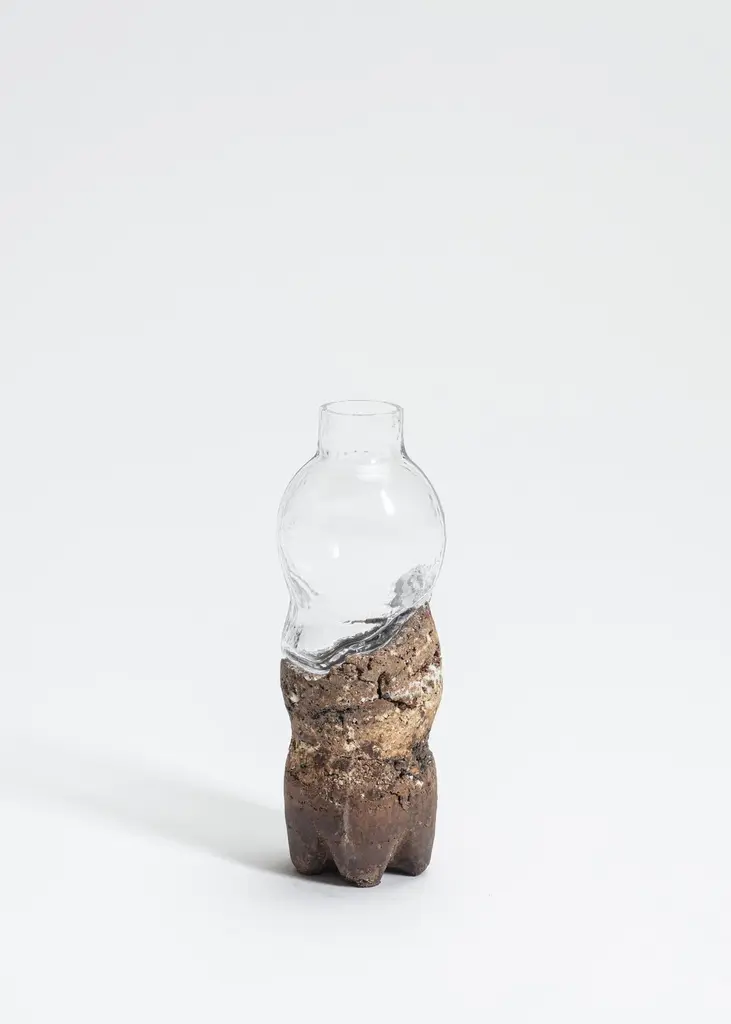 FUWA FUWA, No 7 Bottle by Yusuke´ Y. OffhauseOne of a Kind, the work is in two parts (ceramic and glass).Dimensions: D 6.5 x W 6.5 x H 18 cm.Materials: stoneware, porcelain, glass.Yusuke´ Y. Offhause:"My work often deals with a reformulation of trivial objects from everyday life, which I give, by a series of operations, transformations, and disconcerting appearances. It is based on pre-existing forms, such as plastic bottle and packaging for snacks, salads, cakes etc., found in supermarkets. These forms with such singular structures designed to be rigid with minimal plastic have inspired me to use them to generate new objects by changing the material that constitutes them. Instead of transparent plastic, I introduce a heterogeneous material, granular, composite, reminiscent of oxidized iron or archaeological remains underwater. The plastic shell is taken as a mold in which I blend material that I prepared by mixing various clays crushed to differentdegrees. Two firings and a glaze which solidifies completes the object.I replace the transparent plastic with noble materials, ceramic and glass. The ceramic element evokes an archeological piece and the glass element sketches the missing piece as a fantom object of the consumption of our times. Plastic has become for me an important subject of research because it symbolises the speed of our current society. This takes on the strange appearance of an object difficult to date, archaic and futuristic at the same time. This ambiguity of temporality, the false archaeological appearance interests me with its universal and contemporary resonance."