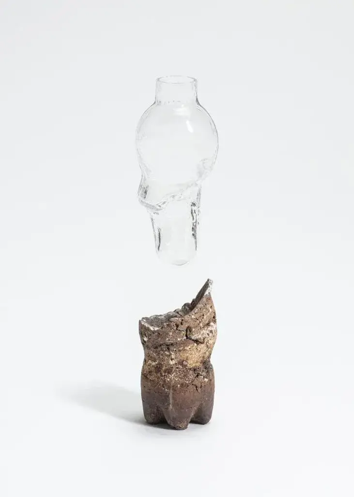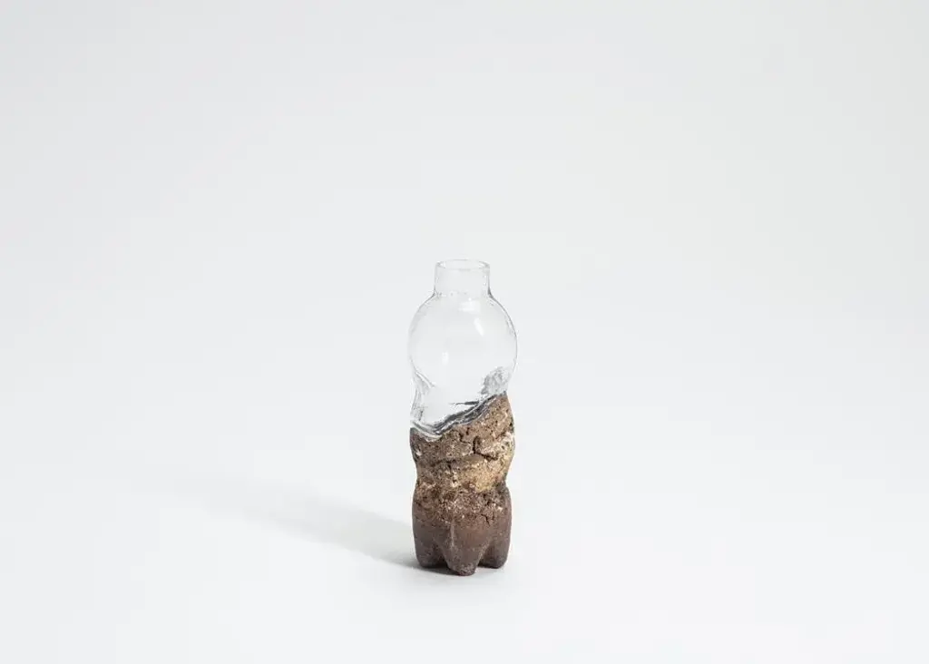Fuwa fuwa, no 7 bottle by yusuke´ y. Offhause one of a kind, the work is in two parts (ceramic and glass). Dimensions: d 6.5 x w 6.5 x h 18 cm. Materials: stoneware, porcelain, glass. Yusuke´ y. Offhause: "my work often deals with a reformulation of trivial objects from everyday life, which i give, by a series of operations, transformations, and disconcerting appearances. It is based on pre-existing forms, such as plastic bottle and packaging for snacks, salads, cakes etc., found in supermarkets. These forms with such singular structures designed to be rigid with minimal plastic have inspired me to use them to generate new objects by changing the material that constitutes them. Instead of transparent plastic, i introduce a heterogeneous material, granular, composite, reminiscent of oxidized iron or archaeological remains underwater. The plastic shell is taken as a mold in which i blend material that i prepared by mixing various clays crushed to different degrees. Two firings and a glaze which solidifies completes the object. I replace the transparent plastic with noble materials, ceramic and glass. The ceramic element evokes an archeological piece and the glass element sketches the missing piece as a fantom object of the consumption of our times. Plastic has become for me an important subject of research because it symbolises the speed of our current society. This takes on the strange appearance of an object difficult to date, archaic and futuristic at the same time. This ambiguity of temporality, the false archaeological appearance interests me with its universal and contemporary resonance."
