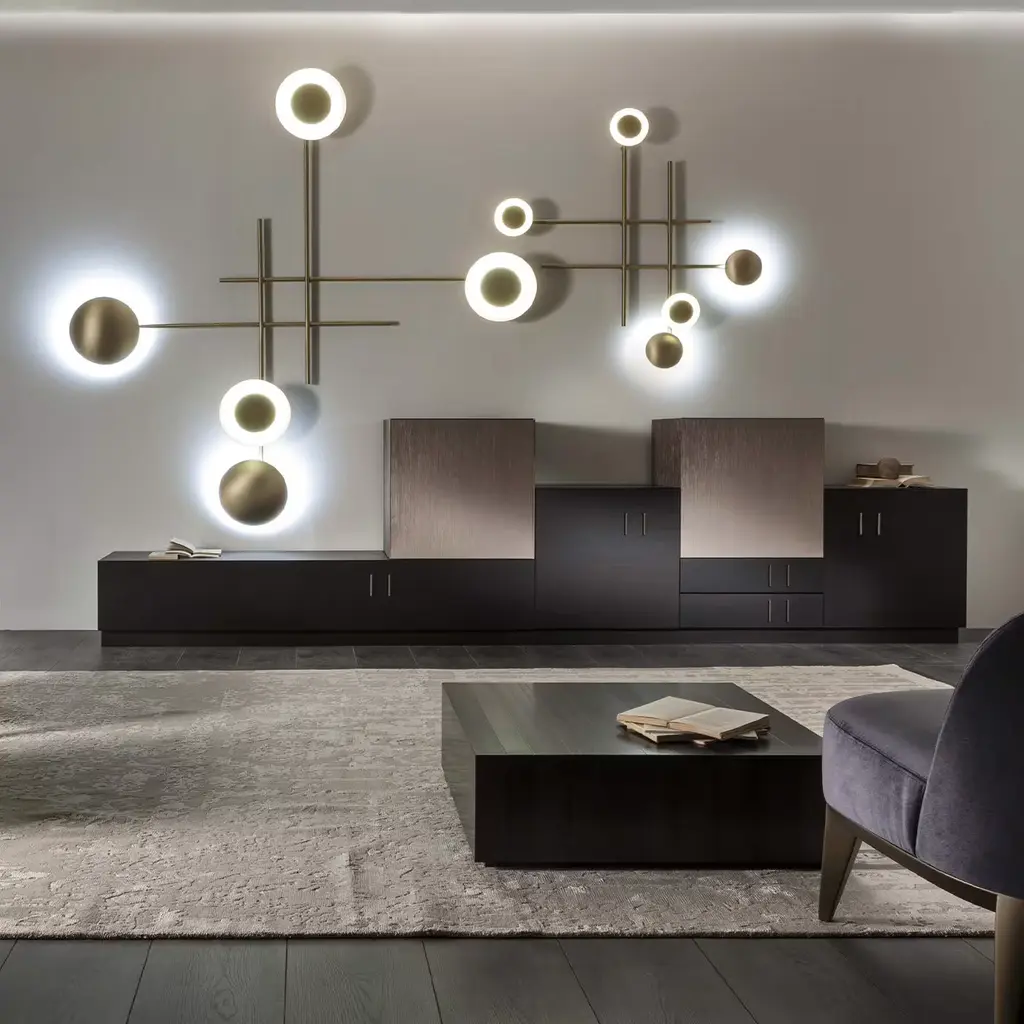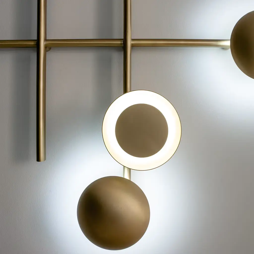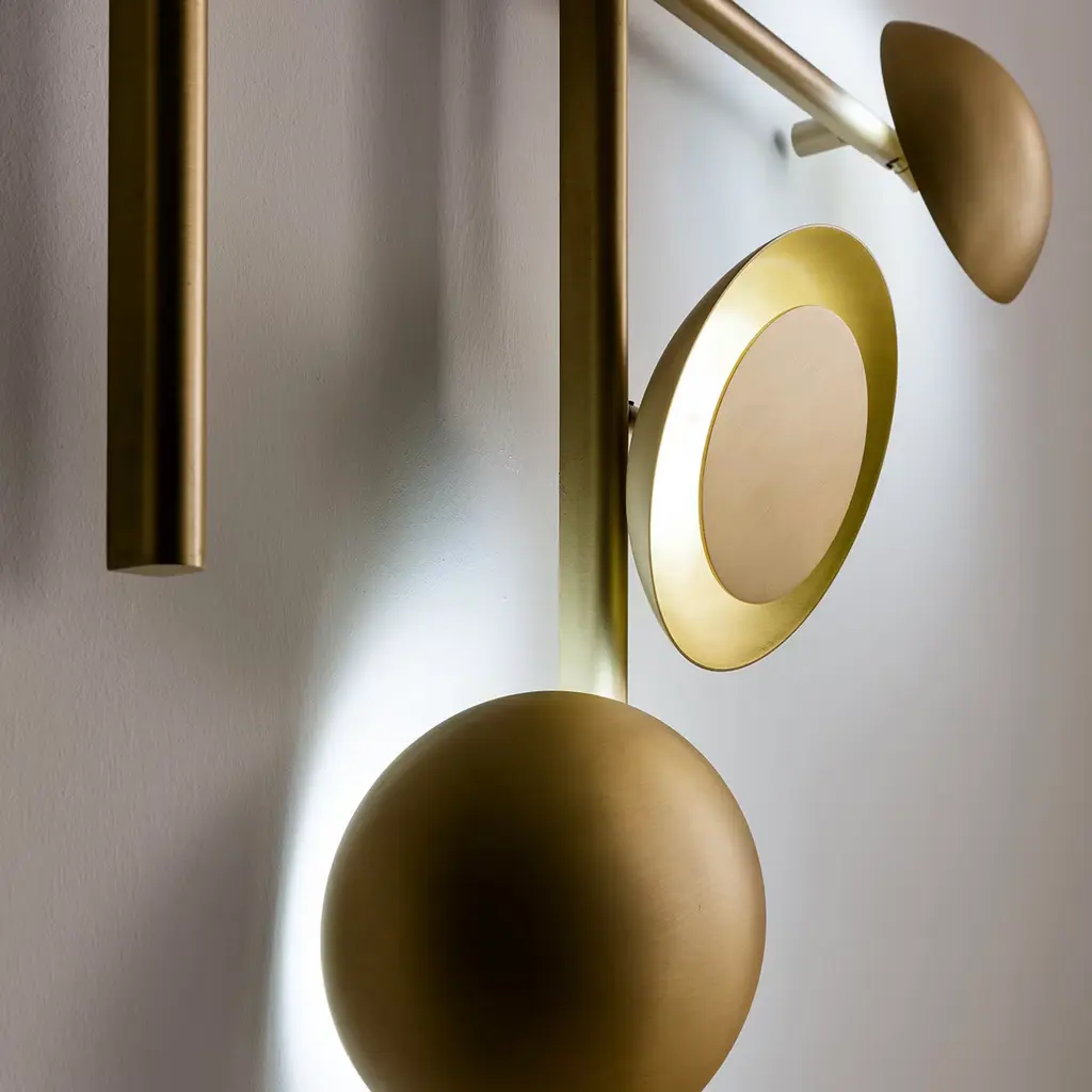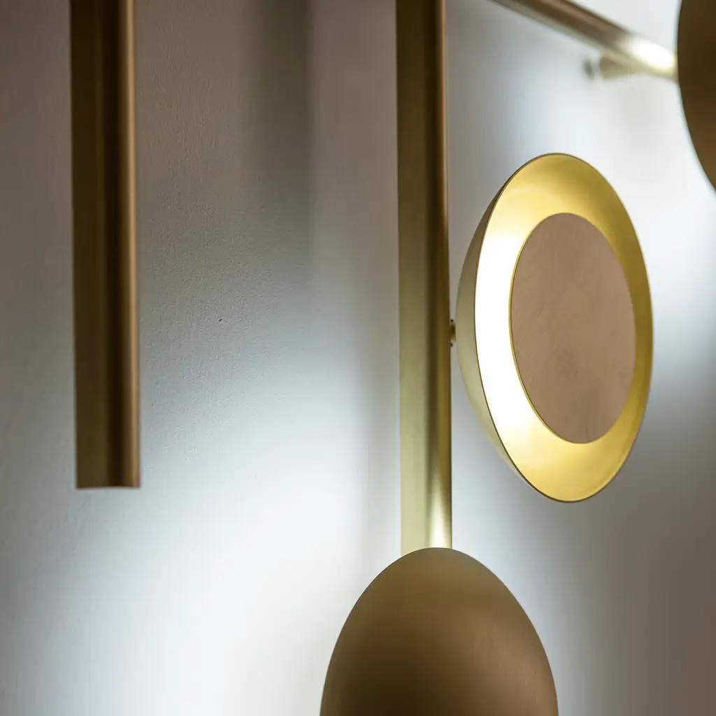 Illumination becomes an original sculpture of geometric forms with this stunning burnished brass wall lamp of the Gaia Collection by Cesare Arosio. Astonishing lighting effects are created by the different configurations of the singular disks covering the LED light sources. Whether it be the hanging version for ceilings and walls, or the fixed or suspended versions, this versatile lamp may be combined in multiple ways according to inspiration.