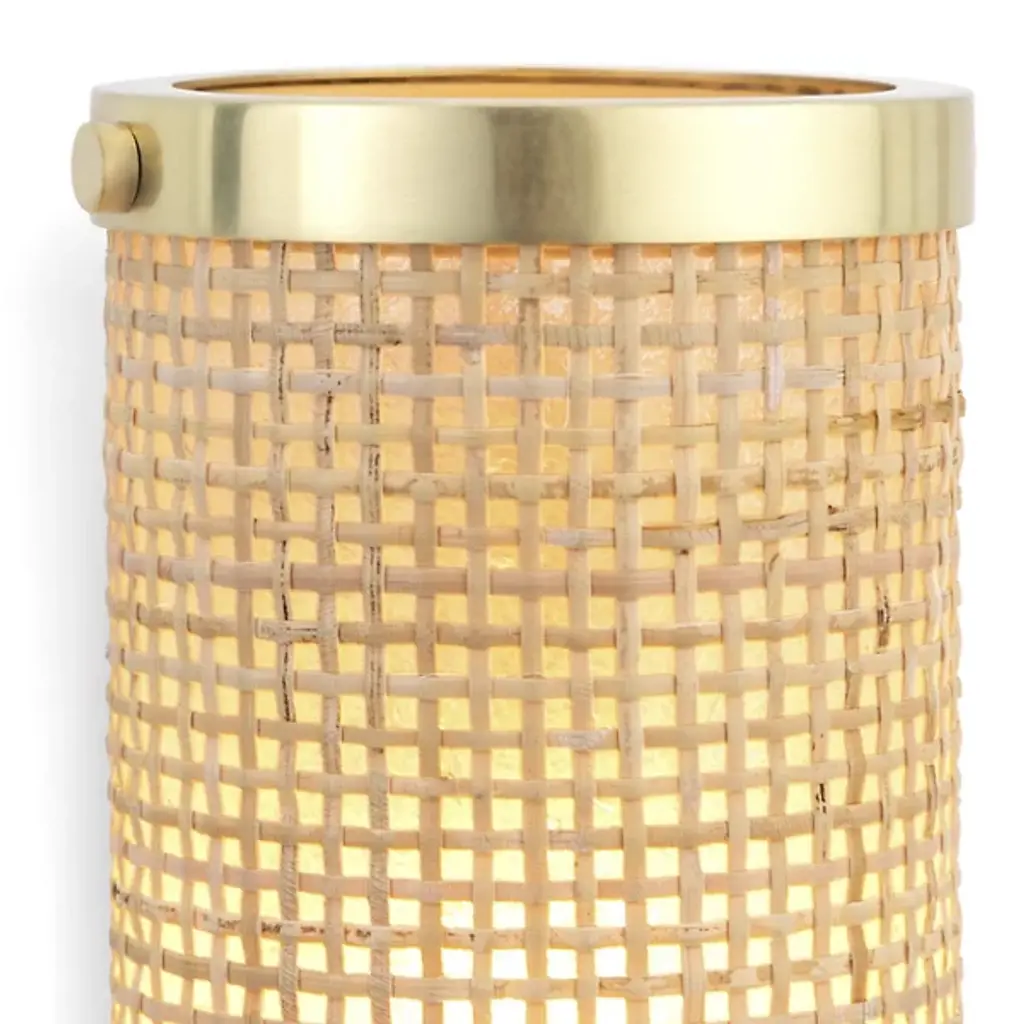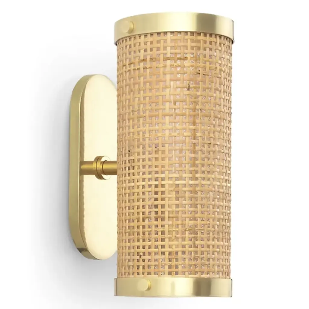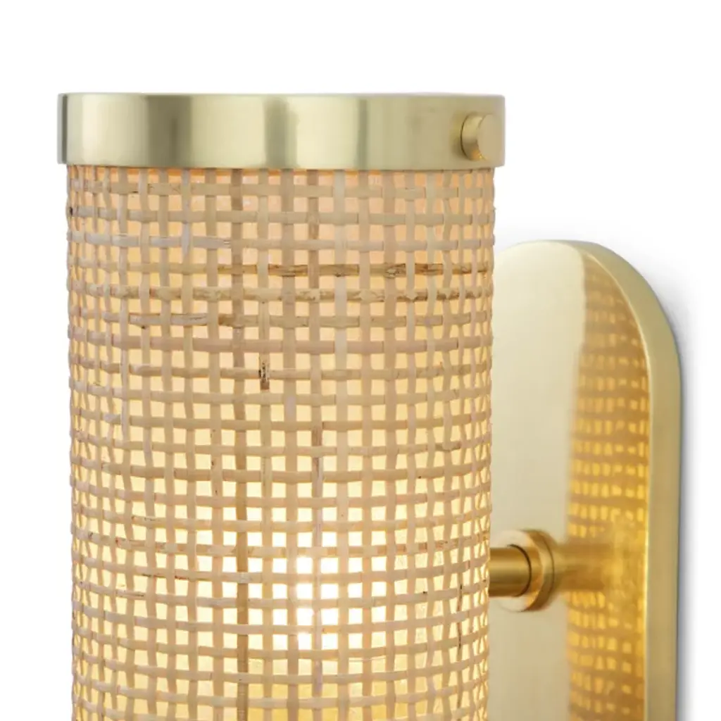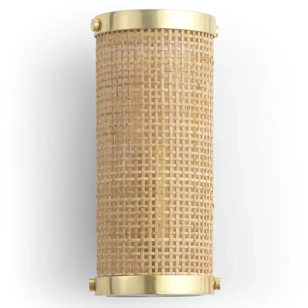 The Galiano Wall Sconce from Alder & Ore blends organic texture with modern appeal, featuring a natural rattan shade and a sleek metal frame. Mounted on an oval wall plate, its cylindrical shade softens the light, casting a warm, inviting glow through the woven structure. Ideal for accent lighting in hallways, bedrooms, or cozy seating areas, this ADA-compliant fixture adds depth and character while complementing various styles with its effortless charm.