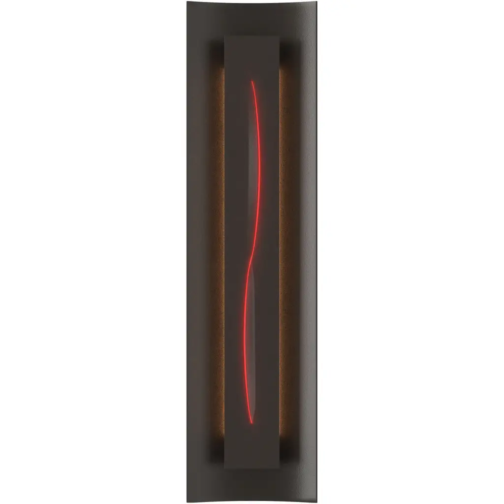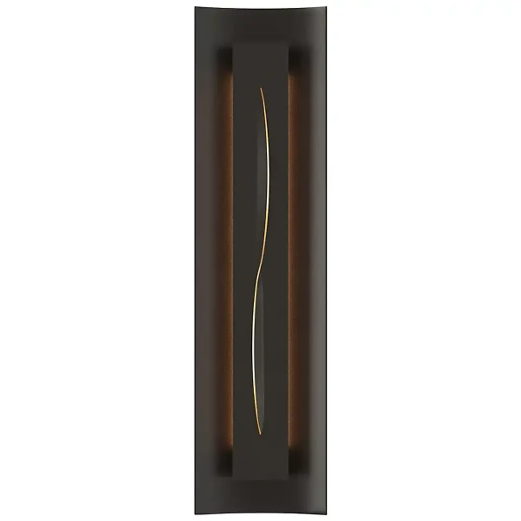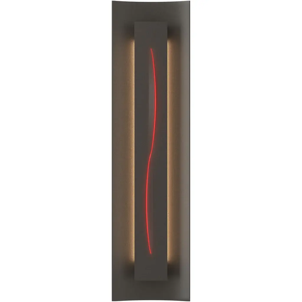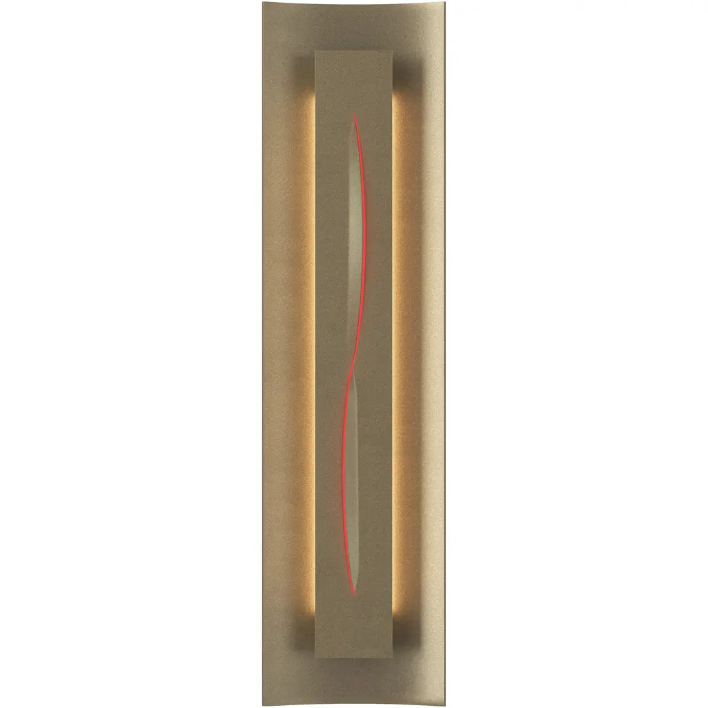Give your large format photographs or beautiful paintings neatly styled lighting with the Gallery 217640 Wall Sconce from Hubbardton Forge. Its metal backplate curves gently at the center while appearing as a neat rectangular shape from a distance. A true rectangular metal housing protrudes from the backplate, at its center, a waved glass contour accents the piece with gentle color brightened by its lighting. Softened light behind the rectangular housing showcases its sharp quality and provides the piece with warm ambient lighting.