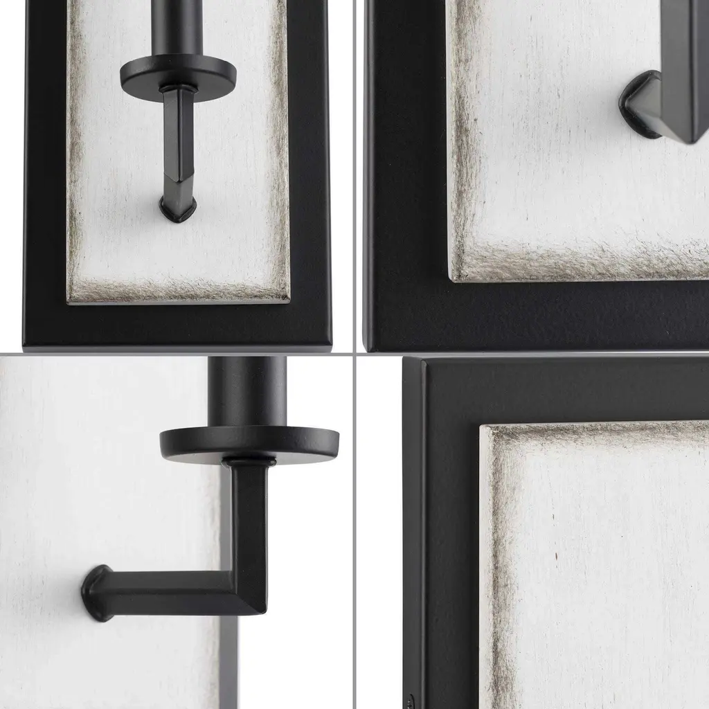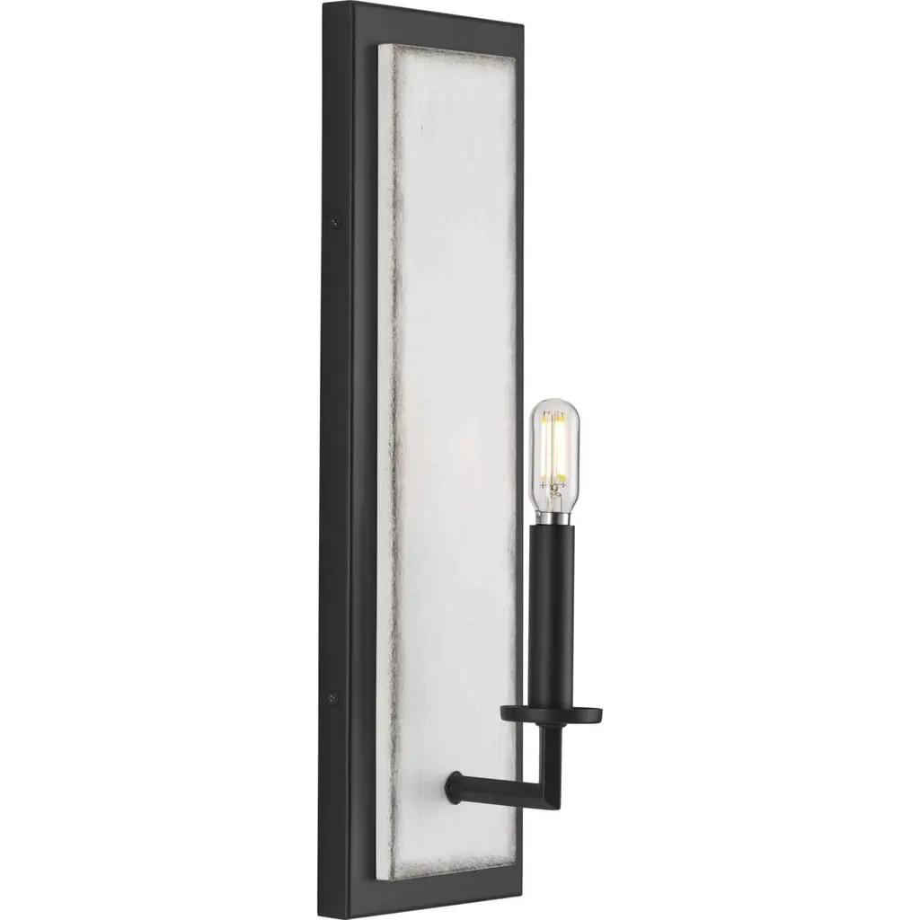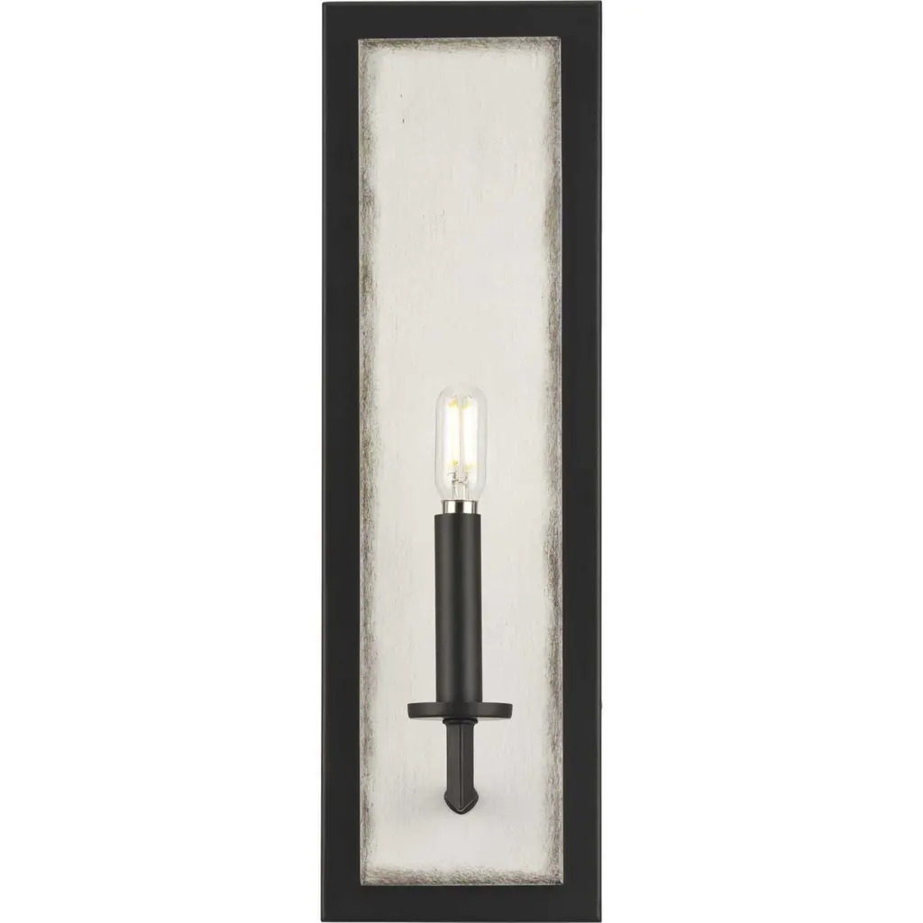 Clean, modern lines combine with rustic elements in the Galloway Collection. A lightly distressed white faux wood panel highlights a rectangular backplate finished in classic matte black. A matte black column holds a candelabra light that glows brightly to illuminate spaces in a casually elegant style. The larger scale and elegant look of the backplate's faux wood-finished panel makes this wall bracket the perfect accompaniment for great rooms, bedrooms and dining rooms.
