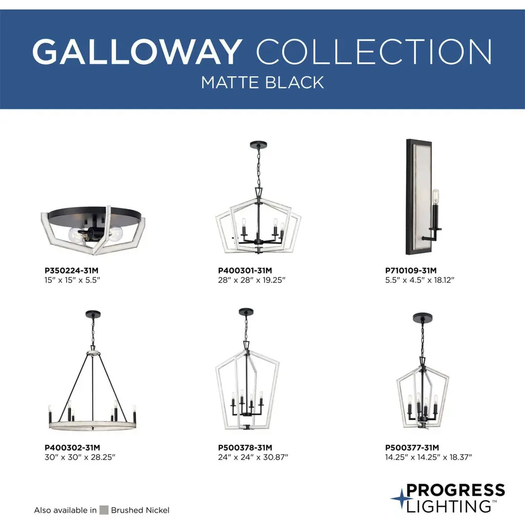 Clean, modern lines combine with rustic elements in the Galloway Collection. A lightly distressed white faux wood panel highlights a rectangular backplate finished in classic matte black. A matte black column holds a candelabra light that glows brightly to illuminate spaces in a casually elegant style. The larger scale and elegant look of the backplate's faux wood-finished panel makes this wall bracket the perfect accompaniment for great rooms, bedrooms and dining rooms.